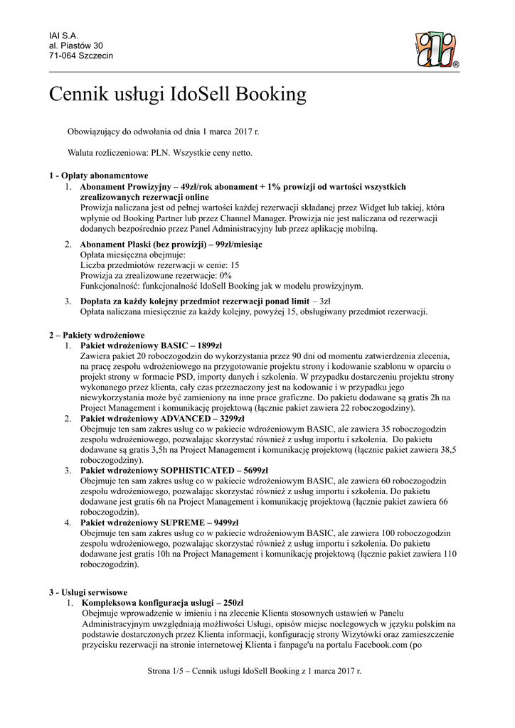 IAI S.A. al. Piastów 30 71-064 Szczecin Cennik usługi IdoSell Booking Obowiązujący do odwołania od dnia 1 marca 2017 r. Waluta rozliczeniowa: PLN. Wszystkie ceny netto. 1 - Opłaty abonamentowe 1. Abonament Prowizyjny – 49zł/rok abonament + 1% prowizji od wartości wszystkich zrealizowanych rezerwacji online Prowizja naliczana jest od pełnej wartości każdej rezerwacji składanej przez Widget lub takiej, która wpłynie od Booking Partner lub przez Channel Manager. Prowizja nie jest naliczana od rezerwacji dodanych bezpośrednio przez Panel Administracyjny lub przez aplikację mobilną. 2. Abonament Płaski (bez prowizji) – 99zł/miesiąc Opłata miesięczna obejmuje: Liczba przedmiotów rezerwacji w cenie: 15 Prowizja za zrealizowane rezerwacje: 0% Funkcjonalność: funkcjonalność IdoSell Booking jak w modelu prowizyjnym. 3. Dopłata za każdy kolejny przedmiot rezerwacji ponad limit – 3zł Opłata naliczana miesięcznie za każdy kolejny, powyżej 15, obsługiwany przedmiot rezerwacji. 2 – Pakiety wdrożeniowe 1. Pakiet wdrożeniowy BASIC – 1899zł Zawiera pakiet 20 roboczogodzin do wykorzystania przez 90 dni od momentu zatwierdzenia zlecenia, na pracę zespołu wdrożeniowego na przygotowanie projektu strony i kodowanie szablonu w oparciu o projekt strony w formacie PSD, importy danych i szkolenia. W przypadku dostarczeniu projektu strony wykonanego przez klienta, cały czas przeznaczony jest na kodowanie i w przypadku jego niewykorzystania może być zamieniony na inne prace graficzne. Do pakietu dodawane są gratis 2h na Project Management i komunikację projektową (łącznie pakiet zawiera 22 roboczogodziny). 2. Pakiet wdrożeniowy ADVANCED – 3299zł Obejmuje ten sam zakres usług co w pakiecie wdrożeniowym BASIC, ale zawiera 35 roboczogodzin zespołu wdrożeniowego, pozwalając skorzystać również z usług importu i szkolenia. Do pakietu dodawane są gratis 3,5h na Project Management i komunikację projektową (łącznie pakiet zawiera 38,5 roboczogodziny). 3. Pakiet wdrożeniowy SOPHISTICATED – 5699zł Obejmuje ten sam zakres usług co w pakiecie wdrożeniowym BASIC, ale zawiera 60 roboczogodzin zespołu wdrożeniowego, pozwalając skorzystać również z usług importu i szkolenia. Do pakietu dodawane jest gratis 6h na Project Management i komunikację projektową (łącznie pakiet zawiera 66 roboczogodzin). 4. Pakiet wdrożeniowy SUPREME – 9499zł Obejmuje ten sam zakres usług co w pakiecie wdrożeniowym BASIC, ale zawiera 100 roboczogodzin zespołu wdrożeniowego, pozwalając skorzystać również z usług importu i szkolenia. Do pakietu dodawane jest gratis 10h na Project Management i komunikację projektową (łącznie pakiet zawiera 110 roboczogodzin). 3 - Usługi serwisowe 1. Kompleksowa konfiguracja usługi – 250zł Obejmuje wprowadzenie w imieniu i na zlecenie Klienta stosownych ustawień w Panelu Administracyjnym uwzględniają możliwości Usługi, opisów miejsc noclegowych w języku polskim na podstawie dostarczonych przez Klienta informacji, konfigurację strony Wizytówki oraz zamieszczenie przycisku rezerwacji na stronie internetowej Klienta i fanpage'u na portalu Facebook.com (po Strona 1/5 – Cennik usługi IdoSell Booking z 1 marca 2017 r. IAI S.A. al. Piastów 30 71-064 Szczecin dostarczeniu odpowiednich danych do logowania się na stronie internetowej i Facebook.com). W przypadku przełączenia domeny w ciągu 30 dni na Stronę Wizytówkę opłata jest anulowana i zwracana na Saldo Klienta. 2. Roboczogodzina prac indywidualnych - 100zł/h Roboczogodzina przy pracy nad Wizytówką, Projektem strony Wizytówki, przygotowaniu i wektoryzacji grafiki w ramach prac nad logo, tłumaczeniami, edycją danych Klienta, imporcie danych lub tworzeniu programu do importu danych z zewnętrznej bazy danych, w tym innego systemu rezerwacji miejsc noclegowych, nietypowej konfiguracji serwera przez administratora w zakresie np. przekierowań, domen itp. 4 - Licencje na inne pola eksploatacji niż Usługa Przygotowywane przez nas materiały graficzne mogą być bez dodatkowej licencji wykorzystywane w ramach Usługi. Jeżeli chcesz wykorzystać przygotowane przez nas materiały w ramach zleceń graficznych na innych polach eksploatacji niż Usługa, należy wykupić odpowiednią licencję. Kreacje nie wymienione w poniższym zakresie (np. szablony e-maili, wstawki HTML i JavaScript, Bannery i Buttony) nie wymagają wykupowania dodatkowej licencji. 1. Wystawienie pisemnej licencji na logo – 100zł Loga wykonane przez naszych grafików są wraz z licencją na wykorzystanie w ramach Usługi. Uzyskanie wyłącznej licencji przenoszącej majątkowe prawa autorskie, pozwala na rejestrację znaku i dowolne nim dysponowanie. Opłata obejmuje udzielenie pisemnej, wyłącznej licencji przenoszącej prawa majątkowe. Jeżeli w ramach opłaty za wykonanie projektu strony wizytówki zostało przygotowane logo, zezwalamy na posługiwanie się nim wyłącznie na stronach związanych z Usługą. Jeżeli Klient chce się posługiwać logo w innych materiałach niż strona internetowa w ramach Usługi musi wykupić przeniesienie praw majątkowych. Opłata zawiera wystawienie i przesłanie w dokumencie PDF podpisanym kwalifikowanym podpisem cyfrowym licencji wyłącznej na 1 znak towarowy i nie zawiera kosztu przygotowania i wektoryzacji grafiki. Te prace muszą być wykonywane w ramach dodatkowych prac serwisowych graficznych, płatnych na zasadach ogólnych lub samodzielnie przez Klienta. Wysłanie licencji w postaci papierowej, wymaga zamówienia dodatkowej usługi Przesyłka listowa na terenie Europy. 2. Wystawienie licencji na indywidualny projekt maski – 1000zł Obejmuje udostępnienie projektu maski PSD ze zgodą na samodzielne pocięcie projektu i samodzielne zakodowanie, bez konieczności korzystania z Usługi. Licencja jest wyłączna i obejmuje zgodę na dalsze modyfikacje projektu przez Klienta. 3. Wystawienie licencji na szablon Strony wizytówki 