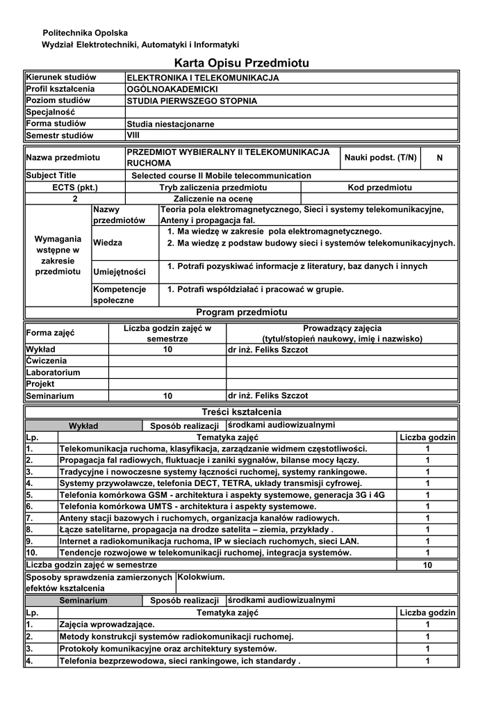 przedmiot wybieralny ii telekomunikacja ruchoma