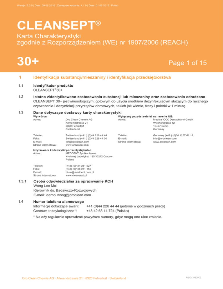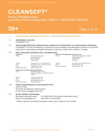 Wersja: 5.0.0 | Data: 09.06.2016 | Zastępuje wydanie: 4.1.0 | Data: 01.06.2015 | Polish CLEANSEPT® Karta Charakterystyki zgodnie z Rozporządzeniem (WE) nr 1907/2006 (REACH) 30+ Page 1 of 15 1 Identyfikacja substancji/mieszaniny i identyfikacja przedsiębiorstwa 1.1 Ident yfikator produktu ® CLEANSEPT 30+ 1.2 I stotne zident yfikowane zastosowania substancji lub mieszaniny oraz zastosowania odradzane CLEANSEPT 30+ jest wirusobójczym, gotowym do użycia środkiem dezynfekującym służącym do ręcznego czyszczenia i dezynfekcji przyrządów obrotowych, takich jak wiertła, frezy i polerki w 1 minutę. 1.3 Dane dotyczące dostawcy karty charakterystyki Wytwórca Adres: Telefon: Faks: E-mail: Strona internetowa: Oro Clean Chemie AG Allmendstrasse 21 8320 Fehraltorf Switzerland Switzerland (+41 ) (0)44 226 44 44 Switzerland (+41 ) (0)44 226 44 00 info@oroclean.com www.oroclean.com Wyłączny przeds t a wi c i e l n a t e r en i e U E : Adres: Medical OCC Deutschland GmbH Wickhofstrasse 12 13467 Berlin Germany Telefon: E-mail: Strona internetowa: Germany (+49 ) (0)30 1207 61 18 info@oroclean.com www.oroclean.com U ż y t k o w n i k k o ń c o w y / i mporter/dyst r yb u t o r Adres: MEDDENT Spolka Jawna Krolowej Jadwigi st. 135 30212 Cracow Poland Telefon: Faks: E-mail: Strona internetowa: (+48) (0)124 251 527 (+48) (0)126 251 150 biuro@meddent.com.pl www.cleansept.pl 1.3.1 Osoba odpowiedzialna za opracowanie KCH Wong Lee Moi Kierownik ds. Badawczo-Rozwojowych E-mail: leemoi.wong@oroclean.com 1.4 Numer telefonu alarmowego Informacje dotyczące awarii: +41 (0)44 226 44 44 (jedynie w godzinach pracy) Centrum toksykologiczne*: +48 42 63 14 724 (Polska) * Należy regularnie sprawdzać powyższe numery, gdyż mogą one ulec zmianie. Oro Clean Chemie AG · Allmendstrasse 21 · 8320 Fehraltorf · Switzerland PLDD43A63EC0 Wersja: 5.0.0 | Data: 09.06.2016 | Zastępuje wydanie: 4.1.0 | Data: 01.06.2015 | Polish CLEANSEPT® Karta Charakterystyki zgodnie z Rozporządzeniem (WE) nr 1907/2006 (REACH) 30+ Page 2 of 15 2 Identyfikacja zagrożeń 2.1 Klasyfikacja substancji lub mieszaniny 2.1.1 Klasyfikacja zgodnie z Rozporządzeniem (WE) nr 1272/2008 Klasy i kategorie zagrożeń Zwroty wskazujące rodzaj zagrożenia Proc edura klasyfikacji Met. Corr. 1 H290 Może powodować korozję metali. Na podstawie danych z testów. Flam. Liq. 3 H226 Łatwopalna ciecz i pary. Na podstawie danych z testów. Skin Irrit. 2 H315 Działa drażniąco na skórę. Zharmonizowana (prawna) klasy fikacja. Eye Irrit. 2 H319 Działa drażniąco na oczy. Zharmonizowana (prawna) klasy fikacja. STOT SE 3 H336 Może wywoływać uczucie senności lub zawroty głowy. Zharmonizowana (prawna) klasy fikacja. 2.2 Elementy oznakowania 2.2.1 O znaczenie mieszaniny zgodnie z Rozporządzeniem (WE) nr 1272/2008 Piktogramy oznaczające zagrożenia GHS02 GHS05 GHS07 Hasło ostrzegawcze: Ostrzeżenie Oro Clean Chemie AG · Allmendstrasse 21 · 8320 Fehraltorf · Switzerland PLDD43A63EC0 Wersja: 5.0.0 | Data: 09.06.2016 | Zastępuje wydanie: 4.1.0 | Data: 01.06.2015 | Polish CLEANSEPT® Karta Charakterystyki zgodnie z Rozporządzeniem (WE) nr 1907/2006 (REACH) 30+ Page 3 of 15 Zwroty wskazujące rodzaj zagrożenia H226 Łatwopalna ciecz i pary. H290 Może powodować korozję metali. H315 Działa drażniąco na skórę. H319 Działa drażniąco na oczy. H336 Może wywoływać uczucie senności lub zawroty głowy. Zwroty wskazujące środki ostrożności: P210 Przechowywać z dala od źródeł ciepła/ iskrzenia/otwartego ognia/ gorących powierzchni. Palenie wzbronione. P261 Unikać wdychania pyłu/dymu/gazu/mgły/par/rozpylonej cieczy. P280 Stosować rękawice ochronne, odzież ochronną oraz ochronę oczu. P303+P361+P353 W PRZYPADKU KONTATKU ZE SKÓRĄ (lub z włosami): Natychmiast usunąć/zdjąć całą zanieczyszczoną odzież. Spłukać skórę pod strumieniem wody/prysznicem. P305+P351+P338 W PRZYPADKU DOSTANIA SIĘ DO OCZU: Ostrożnie płukać wodą przez kilka minut. Wyjąć soczewki kontaktowe, jeżeli są założone i można je łatwo usunąć. Nadal płukać. P501 Zawartość/pojemnik usunąć zgodnie z odpowiednimi przepisami. Uzupełniające informacje o zagrożeniach (UE): – No supplementary labelling requirements according to Regulation (EC) 1272/2008. 2.3 Inne zagrożenia Niniejsza mieszanina nie należy do kategorii PBT lub vPvB zgodnie z REACH, aneks XIII. 3 Skład / Informacja o składnikach 3.1 Substancje Niniejszy produkt jest mieszaniną (patrz część 3.2). 3.2 Mieszaniny Oro Clean Chemie AG · Allmendstrasse 21 · 8320 Fehraltorf · Switzerland PLDD43A63EC0 Wersja: 5.0.0 | Data: 09.06.2016 | Zastępuje wydanie: 4.1.0 | Data: 01.06.2015 | Polish CLEANSEPT® Karta Charakterystyki zgodnie z Rozporządzeniem (WE) nr 1907/2006 (REACH) 30+ 3.2.1 Page 4 of 15 Niebezpieczne składniki Klasyfikacja zgodnie z Rozporządzeniem (WE) nr 1272/2008 Nazwa Numer CAS Numer EINECS Numer in Numer REACH deksu K a te g o r i e zagrożeń Zwroty Stężenie wskazujące rodzaj zagrożeni Propan-2-ol 67-63-0 200-661-7 603-117-00- 05-2115478264-410 0000 Flam. Liq. 2, Eye Irrit. 2, STOT SE 3 H225, H319, H336 30% - < 50% Wodorotlenek potasu 1310-58-3 215-181-3 019-002-00- 05-2115774030-578 0000 Acute Tox. 4, Skin Corr. 1A H302, H314 < 1% Acute Tox. 4, Skin Corr. 1B, Aquatic Acute 1, Aquatic Chronic 2 H302, H314, H400, H411 < 1% Acute Tox. 4, Eye Irrit. H302, H319 2 < 1% chlorek didecylodimetyloa monu 7173-51-5 230-525-2 612-131-00- 05-2115772765-326 0000 2-fenoksyetanol 122-99-6 204-589-7 603-098-00- 05-2116597863-259 0000 3.2.2 Informacje dodatkowe Pełen tekst wymienionych zwrotów R i H podano w części 16 . 4 Środki pierwszej pomocy 4.1 Opis środków pierwszej pomocy 4.1.1 Zalecenia ogólne Zapewnić środki ochrony. Stosować odpowiednie środki ochrony osobistej. Natychmiast zdjąć zanieczyszc zoną odzież. Usunąć osoby ze strefy zagrożenia. W przypadku utraty przytomności lub zagrożenia utratą przytomności natychmiast skorzysta