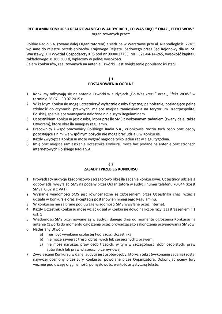 REGULAMIN KONKURSU REALIZOWANEGO W AUDYCJACH „CO WAS KRĘCI ” ORAZ „ EFEKT WOW” organizowanych przez: Polskie Radio S.A. (zwane dalej Organizatorem) z siedzibą w Warszawie przy al. Niepodległości 77/85 wpisane do rejestru przedsiębiorców Krajowego Rejestru Sądowego przez Sąd Rejonowy dla M. St. Warszawy, XIII Wydział Gospodarczy KRS pod nr 0000017753, NIP: 521-04-14-265, wysokość kapitału zakładowego: 8 366 300 zł, wpłacony w pełnej wysokości. Celem konkursów, realizowanych na antenie Czwórki , jest zwiększenie popularności stacji. §1 POSTANOWIENIA OGÓLNE 1. Konkursy odbywają się na antenie Czwórki w audycjach „Co Was kręci ” oraz „ Efekt WOW” w terminie 26.07 – 30.07.2015 r. 2. W każdym Konkursie mogą uczestniczyć wyłącznie osoby fizyczne, pełnoletnie, posiadające pełną zdolność do czynności prawnych, mające miejsce zamieszkania na terytorium Rzeczpospolitej Polskiej, spełniające wymagania nałożone niniejszym Regulaminem. 3. Uczestnikiem Konkursu jest osoba, która prześle SMS z wykonanym zadaniem (zwany dalej także Utworem), które określa niniejszy regulamin. 4. Pracownicy i współpracownicy Polskiego Radia S.A., członkowie rodzin tych osób oraz osoby pozostające z nimi we wspólnym pożyciu nie mogą brać udziału w Konkursie. 5. Każdy Zwycięzca Konkursu może wygrać nagrodę tylko jeden raz w ciągu tygodnia. 6. Imię oraz miejsce zamieszkania Uczestnika Konkursu może być podane na antenie oraz stronach internetowych Polskiego Radia S.A. §2 ZASADY I PRZEBIEG KONKURSU 1. Prowadzący audycje każdorazowo szczegółowo określa zadanie konkursowe. Uczestnicy udzielają odpowiedzi wysyłając SMS na podany przez Organizatora w audycji numer telefonu 70 044 (koszt SMSa: 0,62 zł z VAT). 2. Wysłanie wiadomości SMS jest równoznaczne ze zgłoszeniem przez Uczestnika chęci wzięcia udziału w Konkursie oraz akceptacją postanowień niniejszego Regulaminu. 3. W konkursie nie są brane pod uwagę wiadomości SMS wysyłane przez Internet. 4. Każdy Uczestnik Konkursu może wziąć udział w Konkursie dowolną liczbę razy, z zastrzeżeniem § 1 ust. 5 5. Wiadomości SMS przyjmowane są w audycji danego dnia od momentu ogłoszenia Konkursu na antenie Czwórki do momentu ogłoszenia przez prowadzącego zakończenia przyjmowania SMSów. 6. Nadesłany Utwór: a) musi być wynikiem osobistej twórczości Uczestnika; b) nie może zawierać treści obraźliwych lub sprzecznych z prawem; c) nie może naruszać praw osób trzecich, w tym w szczególności dóbr osobistych, praw autorskich lub praw własności przemysłowej. 7. Zwycięzcami Konkursu w danej audycji jest osoba/osoby, których tekst (wykonanie zadania) został najwyżej oceniony przez Jury Konkursu, powołane przez Organizatora. Dokonując oceny Jury weźmie pod uwagę oryginalność, pomysłowość, wartość artystyczną tekstu. §3 NAGRODY 1. Nagrodą w konkursie jest 5 voucherów o wartości 380 zł każdy, które upoważniają do odbioru butów Vans w sklepach Vans na terenie całego kraju (wykaz sklepów znajduje się w Załączniku nr 1). Jeden voucher dla danego zwycięzcy. 2. Nagrody nie podlegają wymianie na ekwiwalent pieniężny lub rzeczowy. 3. Zwycięzcy udostępnią Organizatorowi swoje dokładne dane, które posłużą do przekazania nagrody w terminie 30 dni od momentu wygrania. 4. Nagrody nie są objęte podatkiem od wygranej. 5. Organizator zastrzega sobie prawo do przyznania dodatkowych nagród i wyróżnień. §4 DANE OSOBOWE 1. Administratorem danych osobowych przetwarzanych w związku z realizacją Konkursu jest Organizator. 2. Dane osobowe przekazane Organizatorowi przez Uczestników Konkursu będą przetwarzane przez Organizatora wyłącznie w celu realizacji Konkursu i doręczenia nagród. Podanie danych osobowych jest dobrowolne, jednak ich niepodanie uniemożliwia otrzymanie nagrody w Konkursie. Każdy Uczestnik Konkursu posiada prawo wglądu do swoich danych osobowych, do ich poprawiania oraz żądania ich usunięcia. Dane osobowe będą przetwarzane zgodnie z przepisami ustawy z dnia 29 sierpnia 1997 r. o ochronie danych osobowych (Dz. U. 2014.1182 j.t.z późn. zm.) na co każdy Uczestnik Konkursu wyraża zgodę. §5 PRAWA AUTORSKIE 1. Uczestnik Konkursu oświadcza, że Utwór zgłoszony do Konkursu został stworzony samodzielnie przez Uczestnika i jest wolny od praw i roszczeń osób trzecich, w tym dotyczących praw autorskich i pokrewnych oraz że ponosi wobec Organizatora odpowiedzialność z tego tytułu, zwalniając go z wszelkich roszczeń osób trzecich. 2. Z chwilą wysłania Utworu do Konkursu Uczestnik udziela bez wynagrodzenia nieograniczonej czasowo i terytorialnie niewyłącznej licencji do korzystania z Utworu (licencja w zakresie autorskich praw majątkowych i praw pokrewnych) na następujących polach eksploatacji: a) utrwalanie i zwielokrotnianie (w tym wprowadzenie do pamięci komputera) Utworu dowolną techniką, b) publiczne udostępnianie Utworu w taki sposób, aby każdy mógł mieć do niego dostęp w miejscu i czasie przez siebie wybranym, c) nadawanie Utworu za pomocą fonii. 3. Uczestnik upoważnia Organizatora do udostępnienia Utworu anonimowo oraz do decydowania o jego pierwszym publicznym udostępnieniu. §6 REKLAMACJE 1. Wszelkie reklamacje mogą być kierowane do powołanej przez Organizatora Komisji Reklamacyjnej. 2. Złożone przez Uczestników reklamacje będą rozpatrywane w terminie 14 dni od dnia otrzymania przez Komisję Reklamacyjną. O rozpatrzeniu reklamacji Uczestnik zostanie powiadomiony pisemnie. §7 POSTANOWIENIA KOŃCOWE 1. Konkurs prowadzony na podstawie regulaminu nie jest grą losową, loterią fantową, zakładem wzajemnym ani loterią promocyjną, których wynik zależy od przypadku w rozumieniu art. 2 ustawy z dnia 19.11.2009 o grach hazardowych (Dz. U. z 2009 nr 201, poz. 1540 z późniejszymi zmianami). 2. Niniejszy regulamin dostępny jest w siedzibie Organizatora oraz na st