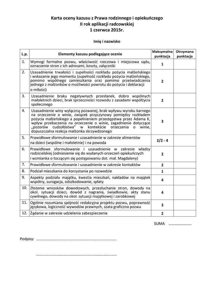 Karta oceny kazusu z Prawa rodzinnego i opiekuńczego II rok aplikacji radcowskiej 1 czerwca 2015r. Imię i nazwisko Maksymalna Otrzymana punktacja punktacja L.p. Elementy kazusu podlegające ocenie 1. Wymogi formalne pozwu, właściwość rzeczowa i miejscowa sądu, oznaczenie stron z ich adresami, koszty, załączniki 1 2. Uzasadnienie trwałości i zupełności rozkładu pożycia małżeńskiego i wskazanie jego momentu (zupełność rozkładu pożycia małżeńskiego, pomimo wspólnego zamieszkania oraz pomimo przeświadczenia jednego z małżonków o możliwości powrotu do pożycia i deklaracji o miłości) 2 Uzasadnienie braku negatywnych przesłanek, dobro wspólnych małoletnich dzieci, brak sprzeczności rozwodu z zasadami współżycia społecznego 2 Uzasadnienie winy wyłączną pozwanej, brak wpływu wyroku karnego na orzeczenie o winie, związek przyczynowy pomiędzy rozkładem pożycia małżeńskiego a popełnieniem przestępstwa przez Adama K, wpływ przebaczenia na orzeczenie o winie, zagadnienie dotyczące „pozorów cudzołóstwa” w kontekście orzeczenia o winie, dopuszczalna reakcja małżonka skrzywdzonego 3 3. 4. 5. Prawidłowe sformułowanie i uzasadnienie w zakresie alimentów na dzieci (wspólne i małoletnie) i na powoda 6. Prawidłowe sformułowanie i uzasadnienie w zakresie władzy rodzicielskiej (odniesienie się do wydanych orzeczeń opiekuńczych i wzmianka o toczącym się postępowaniu dot. mał. Magdaleny) 2 7. Prawidłowe sformułowanie i uzasadnienie w zakresie kontaktów 2 8. Podział mieszkania do korzystania po rozwodzie 1 9. Aspekty podziału majątku, kwestia mieszkań, nakładów na majątek wspólny, surogacja, odszkodowanie, spłaty 4 10. Złożenie wniosków dowodowych, przesłuchanie stron, dowody na okol. sytuacji dzieci, dowód z nagrania, świadkowie, akty stanu cywilnego, dowody na okol. sytuacji majątkowej i zarobkowej 11. Ogólnie rozumiana spójność redakcyjna projektu pozwu, poprawność językowa, logiczność wywodów prawnych, szata graficzna pozwu 12. Żądanie w zakresie udzielenia zabezpieczenia 2/2 - 4 4 3 2 SUMA …………………… Podpisy: ……………………………………………………………………….. ………………………………………………………………………..