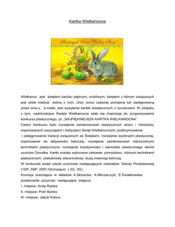 Kartka Wielkanocna Wielkanoc jest świętem bardzo pięknym, urokliwym, świętem z którym związanych jest wiele tradycji. Jedną z nich, choć coraz częściej pomijaną lub zastępowaną przez sms-y, e-maile, jest wysyłanie kartek świątecznych z życzeniami. W związku z tym, nadchodzące Święta Wielkanocne stały się inspiracją do zorganizowania konkursu plastycznego, pt. „NAJPIĘKNIEJSZA KARTKA WIELKANOCNA”. Celem konkursu było rozwijanie zainteresowań plastycznych dzieci i młodzieży inspirowanych zwyczajami i tradycjami Świąt Wielkanocnych, podtrzymywanie i pielęgnowanie tradycji związanych ze Świętami, rozwijanie wyobraźni plastycznej, inspirowanie do aktywności twórczej, rozwijanie zainteresowań różnorodnymi technikami plastycznymi, rozwijanie kreatywności i warsztatu plastycznego wśród uczniów Ośrodka. Kartki zostały wykonane ciekawie, pomysłowo, różnymi technikami plastycznymi, zaskakiwały starannością i dużą inwencją twórczą. W konkursie wzięli udział uczniowie następujących oddziałów: Szkoły Podstawowej (1SP, 5SP, 2SP) Gimnazjum ( 2G, 3G). Komisja oceniająca w składzie: A.Słonecka, A.Milczarczyk, E.Kwiatkowska postanowiła przyznać następujące miejsca: I. miejsce- Anita Rylska II. miejsce- Piotr Bartos III. miejsce- Jakub Kobus. Wiedząc, jak ważne jest dla dzieci docenienie ich trudu laureaci konkursu uhonorowani zostali imiennymi dyplomami i czekoladowymi zajączkami świątecznymi. Kartki można podziwiać do 16 kwietnia w świetlicy szkolnej. PRACE BIORĄCE UDZIAŁ W KONKURSIE I. II. III. Ewelina Kwiatkowska