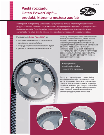 E13/70319 Paski rozrzådu Gates PowerGrip® – produkt, któremu mo†esz zaufaç Ka†dy pasek rozrzådu firmy Gates zosta¬ zaprojektowany z my∂lå o konkretnym zastosowaniu przy jednoczesnym spe¬nieniu lub przekroczeniu wymogów pierwszego monta†u (OE) producenta danego samochodu. Firma Gates jest dostawcå OE do wszystkich czo¬owych producentów samochodów na ca¬ym ∂wiecie. Mo†esz wi™c zainstalowaç nasz pasek rozrzådu bez obaw. Paski rozrzådu Gates PowerGrip® to: • doskona¬e dopasowanie do kó¬ pasowych • ograniczenie poziomu ha¬asu • precyzyjne wykonanie i umieszczenie z™bów • gwarancja sprawno∂ci dzia¬ania i trwa¬o∂ci Wszyscy czo¬owi producenci samochodów na ∂wiecie potwierdzili wysokå jako∂ç pasków rozrzådu firmy Gates po poddaniu ich wielokrotnym i rygorystycznym testom we wszystkich mo†liwych warunkach u†ytkowania pojazdów. Ka†dy pasek PowerGrip® wykonany jest z najlepszych materia¬ów a jego konstrukcja opracowana do konkretnego zastosowania. Paski majå typowe dla firmy Gates z™by o profilu pó¬okråg¬ym, które så szczególnie cenione za: • wytrzyma¬o∂ç • niski poziom ha¬asu • precyzyjne zaz™bianie Producenci samochodowi z ca¬ego ∂wiata stosujå i potwierdzajå, †e pó¬okråg¬y profil z™bów firmy Gates ∂wietnie sprawdza si™ w praktyce. Inni producenci pasków proponujå odmienne profile do tych samych zastosowaµ i do u†ytku z tymi samymi ko¬ami pasowymi. Takie profile så stosowane zamiennie z profilem przyj™tym przez firm™ Gates. OE/INNE GATES/OE ➨ Kilka przyk¬adów zastosowania pó¬okråg¬ego profilu z™bów, typowego dla firmy Gates Paski PowerGrip® 1,8 16v TS 2,0 16v TS 2,4 20v 1,4 12v 1,6 16v 1,6 / 1,8 / 2,0 16v 1,9 JTD 2,4 JTD 1,2 16v 1,1 1,2 8v ALFA ROMEO 145/146, 156, GTV, Spider FIAT Bravo, Brava, Marea Berl/SW, Nuova Punto, Barchetta, Coupé LANCIA Delta, Lybra Berl/SW ALFA ROMEO 145/146, 156, 166, GTV, Spider LANCIA K, K coupé, K SW FIAT Bravo, Brava, Marea LANCIA Y FIAT Bravo, Brava, Marea, Multipla, Stilo LANCIA Dedra, Lybra ALFA 145, 146, 155, 156 FIAT Punto, Stilo LANCIA Lybra ALFA ROMEO 145/146, 156 FIAT Bravo, Brava, Marea Berl/SW LANCIA Lybra Berl/SW ALFA ROMEO 156, 166 FIAT Marea Berl/SW LANCIA Lybra Berl/SW, K Berl/SW FIAT Bravo, Brava, Marea, Punto, Stilo Lancia Y FIAT Panda, Seicento LANCIA Y FIAT Punto, Strada LANCIA Y OE 5429XS 5429XS 60625130 / 60656342 / 7710579 60625130 / 60656342 / 7710579 5429XS 5429XS 5429XS 5431XS 5431XS 5432XS 5432XS 5469XS 5469XS 5469XS 5500XS 5500XS 5500XS 5500XS 5500XS 5500XS 5503XS 5503XS 5544XS 5544XS 5545XS 5545XS 60625130 / 60656342 / 7710579 60625130 / 60656342 / 7710579 60625130 / 60656342 / 7710579 7762910 7762910 46400045 / 46514671 46400045 / 46514671 60656341 / 60816232 60656341 / 60816232 60656341 / 60816232 60814603 60814603 60814603 60814603 60814603 60814603 46403659 46403659 46750865 46750865 46736500 / 71719652 46736500 / 71719652 Producenci samochodów z ca¬ego ∂wiata wysoko ceniå sobie niezawodno∂ç pasków firmy Gates: Alfa Romeo Audi BMW Chrysler Citroën Daewoo Daihatsu Fiat Ford General Motors Honda Hyundai Isuzu Lancia Kia Mazda Mitsubishi Nissan Opel Peugeot Porsche Renault Rover Group Saab Seat Skoda Subaru Suzuki Toyota Vauxhall Volkswagen Volvo Paski rozrzådu Gates PowerGrip® zapewniajå Twoim klientom bezpieczeµstwo, najwy†szå jako∂ç i niezawodno∂ç Twój dystrybutor: Producent zastrzega sobie prawo do wprowadzania zmian w miar™ potrzeb. © Gates Europe nv 2005 Wydrukowano w Belgii - 04/05.