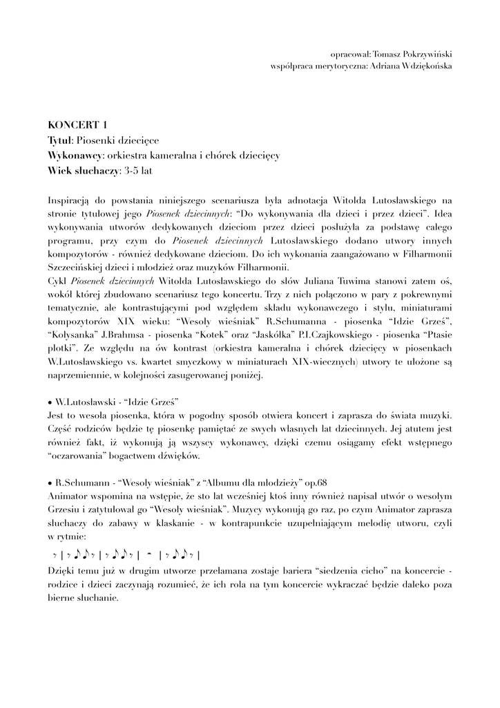 opracował: Tomasz Pokrzywiński współpraca merytoryczna: Adriana Wdziękońska KONCERT 1 Tytuł: Piosenki dziecięce Wykonawcy: orkiestra kameralna i chórek dziecięcy Wiek słuchaczy: 3-5 lat Inspiracją do powstania niniejszego scenariusza była adnotacja Witolda Lutosławskiego na stronie tytułowej jego Piosenek dziecinnych: “Do wykonywania dla dzieci i przez dzieci”. Idea wykonywania utworów dedykowanych dzieciom przez dzieci posłużyła za podstawę całego programu, przy czym do Piosenek dziecinnych Lutosławskiego dodano utwory innych kompozytorów - również dedykowane dzieciom. Do ich wykonania zaangażowano w Filharmonii Szczecińskiej dzieci i młodzież oraz muzyków Filharmonii. Cykl Piosenek dziecinnych Witolda Lutosławskiego do słów Juliana Tuwima stanowi zatem oś, wokół której zbudowano scenariusz tego koncertu. Trzy z nich połączono w pary z pokrewnymi tematycznie, ale kontrastującymi pod względem składu wykonawczego i stylu, miniaturami kompozytorów XIX wieku: “Wesoły wieśniak” R.Schumanna - piosenka “Idzie Grześ”, “Kołysanka” J.Brahmsa - piosenka “Kotek” oraz “Jaskółka” P.I.Czajkowskiego - piosenka “Ptasie plotki”. Ze względu na ów kontrast (orkiestra kameralna i chórek dziecięcy w piosenkach W.Lutosławskiego vs. kwartet smyczkowy w miniaturach XIX-wiecznych) utwory te ułożone są naprzemiennie, w kolejności zasugerowanej poniżej. • W.Lutosławski - “Idzie Grześ” Jest to wesoła piosenka, która w pogodny sposób otwiera koncert i zaprasza do świata muzyki. Część rodziców będzie tę piosenkę pamiętać ze swych własnych lat dziecinnych. Jej atutem jest również fakt, iż wykonują ją wszyscy wykonawcy, dzięki czemu osiągamy efekt wstępnego “oczarowania” bogactwem dźwięków. • R.Schumann - “Wesoły wieśniak” z “Albumu dla młodzieży” op.68 Animator wspomina na wstępie, że sto lat wcześniej ktoś inny również napisał utwór o wesołym Grzesiu i zatytułował go “Wesoły wieśniak”. Muzycy wykonują go raz, po czym Animator zaprasza słuchaczy do zabawy w klaskanie - w kontrapunkcie uzupełniającym melodię utworu, czyli w rytmie: o|oeeo|oeeo| ! |oeeo| Dzięki temu już w drugim utworze przełamana zostaje bariera “siedzenia cicho” na koncercie rodzice i dzieci zaczynają rozumieć, że ich rola na tym koncercie wykraczać będzie daleko poza bierne słuchanie. • W.Lutosławski - “Rzeczka” Animator łączy tę piosenkę z poprzednimi utworami np. opowiadając, że podczas spaceru wesoły Grześ zawędrował nad rzeczkę. Po wysłuchaniu utworu Animator pyta jaki instrument, który wcześniej nie grał, pojawił się w tej piosence. Chodzi o harfę, która w piosence Rzeczka W.Lutosławskiego odgrywa bardzo istotną rolę. Jej łagodny dźwięk jest przez dzieci (ale również rodziców!) bardzo lubiany. Warto zatem wyeksponować ten instrument i zaprezentować go w utworze solowym (będzie to również ciekawy sposób na ponowne skupienie uwagi słuchaczy zgodnie z zasadą kontrastów). Ponieważ scenariusz adresowany jest do młodszych dzieci opowiadanie o instrumencie należy ograniczyć do minimum, gdyż w tej grupie wiekowej zdecydowanie ważniejsze będzie “zaczarowanie” słuchaczy dźwiękiem samego instrumentu - jego niepowtarzalną barwą. • Harfa solo (krótki utwór wybrany przez wykonawcę) Po występie harfistki/harfisty Animator dziękuje soliście i zapowiada wiersz (J.Tuwima -autora wszystkich tekstów piosenek w tym scenariuszu) o innym wspaniałym soliście - Panu Tralalińskim. Jeżeli wśród słuchaczy są 5-latki, Animator może wybrać spośród nich pomocników - reprezentujących różne postaci i zwierzątka w wierszu. • fragment wiersza “O panu Tralalińskim” + piosenka “Tralala” Wiersz przechodzi płynnie w prostą piosenkę “Tralala”. Melodia jest na tyle krótka i prosta, że rodzice - zachęcani przez Animatora - powinni po chwili bez trudu dołączyć do wspólnego śpiewu. Po odśpiewaniu wesołej piosenki słuchacze będą najprawdopodobniej ożywieni i pełni energii, dlatego też następne dwa utwory będą miały za zadanie wyciszenie i uspokojenie atmosfery. Animator nawiązuje do kotka, który wystąpił we fragmencie wiersza i zapowiada kolejną piosenkę. • W.Lutosławski - “Kotek” Piosenka może zostać powtórzona, jeżeli Animator zdecyduje się zaprosić rodziców i dzieci do zabawy we wspólne miauczenia - w odpowiednich miejscach piosenki. Do zabawy tej warto również dodać elementy zachęcające do delikatnego kontaktu fizycznego dziecka i rodzica/-ców, np. głaskanie po głowie, pleckach, rączkach, etc. A ponieważ tytułowy kotek zasypia na końcu piosenki, następnym utworem będzie kołysanka (której dzieci mogą słuchać “śpiąc” wtulone w rodziców niczym małe kotki). • J.Brahms - “Kołysanka” op.49 Nr 4 Zapowiadając następny utwór Animator opowiada dzieciom, że skoro kotek śpi - na podwórku harcują ptaszki. • W.Lutosławski - “Ptasie plotki” • Luto-zabawa - “Aleatoryzm” Piosenka “Ptasie plotki” jest pretekstem do zabawy w “Aleatoryzm”. Animator tłumaczy, że taka “bójka wśród podwórka” trochę przypomina jedną z ulubionych technik kompozytorskich W.Lutosławskiego - aleatoryzm. Może być ona zilustrowana na przykład w następujący sposób: Animator prosi rodziców o wspólne (rytmicznie i razem) powiedzenie zdania “Teraz bójka wśród podwórka, że aż lecą barwne piórka” (ostatnie dwa wersy piosenki “Ptasie plotki”). Następnie rodzice wypowiadają to zdanie każdy we własnym tempie (Animator może zachęcić do wypróbowania skrajnych temp). Kolejnym wariantem może być kilkukrotne powtarzanie pierwszej połowy zdania każdy we własnym tempie, a następnie, na sygnał “dyrygenta” - Animatora, rytmiczne wypowiedzenie drugiej połowy zdania. Ilość kolejnych wariantów jest ograniczona jedynie cz