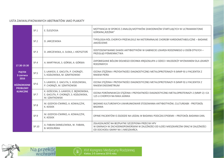 LISTA ZAKWALIFIKOWANYCH ABSTRAKTÓW JAKO PLAKATY SP.1 E. ŚLESZYCKA MOTYWACJA W SPORCIE Z ANALIZĄ MOTYWÓW ZAWODNIKÓW STARTUJĄCYCH W ULTRAMARATONIE GÓRSKIM„RZEŹNIK” SP.2 D. JARCZEWSKA TYPOLOGIA RÓL CHORYCH PRZEWLEKLE NA NIETERMINALNE CHOROBY KARDIOMETABOLICZNE – BADANIE JAKOŚCIOWE SP.3 D. JARCZEWSKA, A. SUSKA, J. KRZYSZTOŃ DOSTOSOWYWANIE DAWEK ANTYBIOTYKÓW W GABINECIE LEKARZA RODZINNEGO U OSÓB OTYŁYCH – PRZEGLĄD PIŚMIENNICTWA SP.4 A. MARTYNIUK, S. GÓRSKI, A. GÓRSKA ZAPOBIEGANIE BÓLOM DOLNEGO ODCINKA KRĘGOSŁUPA U DZIECI I MŁODZIEŻY WYZWANIEM DLA LEKARZY RODZINNYCH PIĄTEK 3 czerwca 2016 SP.5 S. ŁAWICKI, E. GACUTA, P. CHORĄŻY, S. KOZŁOWSKA, M. SZMITKOWSKI OCENA STĘŻENIA I PRZYDATNOŚCI DIAGNOSTYCZNEJ METALOPROTEINAZY-9 (MMP-9) U PACJENTEK Z RAKIEM PIERSI RÓŻNORODNE PROBLEMY KLINICZNE SP.6 S. ŁAWICKI, E. GACUTA, S. KOZŁOWSKA, P. CHORĄŻY, M. SZMITKOWSKI OCENA STĘŻENIA I PRZYDATNOŚCI DIAGNOSTYCZNEJ METALOPROTEINAZY-9 (MMP-9) U PACJENTEK Z RAKIEM ENDOMETRIUM SP.7 K. GOŚCICKA, S. ŁAWICKI, E. BĘDKOWSKA, E. GACUTA, P. CHORĄŻY, S. KOZŁOWSKA, M. SZMITKOWSKI OCENA PORÓWNAWCZA STĘŻENIA I PRZYDATNOŚCI DIAGNOSTYCZNEJ METALOPROTEINAZY-2 (MMP-2) I CA 125 U CHORYCH NA RAKA JAJNIKA SP.8 M. GODYCKI-ĆWIRKO, A. KOWALCZYK, K. KOSIEK BADANIE KULTUROWYCH UWARUNKOWAŃ STOSOWANIA ANTYBIOTYKÓW, CULTUREABX - PROTOKÓŁ BADANIA SP.9 M. GODYCKI-ĆWIRKO, A. KOWALCZYK, K. KOSIEK OPINIE PACJENTÓW O ZGODZIE NA UDZIAŁ W BADANIU PODCZAS EPIDEMII – PROTOKÓŁ BADANIA EARL SP.10 A. FABIAN-DANIELEWSKA, W. FABIAN, B. MODLIŃSKA ZGŁASZALNOŚĆ NA BEZPŁATNE SZCZEPIENIA PRZECIW HPV W GMINACH W ZACHODNIOPOMORSKIM W ZALEŻNOŚCI OD ILOŚCI MIESZKAŃCÓW ORAZ W ZALEŻNOŚCI OD DOCHODU GMINY NA 1 MIESZKAŃCA. 17.30-19.30 LISTA ZAKWALIFIKOWANYCH ABSTRAKTÓW JAKO PREZENTACJE USTNE PU.1 W. KULIŃSKI METODY HYDRO-BALNEOLOGICZNE – MOŻLIWOŚCI WYKORZYSTANIA PU.2 W. KULIŃSKI, J. MRÓZ ZESPÓŁ ALGODYSTROFICZNY PROBLEMEM W PRAKTYCE LEKARZA RODZINNEGO PU.3 M.GODYCKI-ĆWIRKO, A. KOWALCZYK, M.NOCUŃ ZALECENIA POZOSTANIA W DOMU PRZY INFEKCJI DRÓG ODDECHOWYCH PU.4 K. GOŚCICKA, S. ŁAWICKI, E. BĘDKOWSKA, E. GACUTA, P. CHORĄŻY, S. KOZŁOWSKA, M. SZMITKOWSKI OCENA PORÓWNAWCZA STĘŻENIA I PRZYDATNOŚCI DIAGNOSTYCZNEJ METALOPROTEINAZY-9 (MMP-9) ORAZ MARKERÓW CA 125 I HE4 U PACJENTEK Z RAKIEM JAJNIKA PU.5 A. MARTYNIUK, S. GÓRSKI, L. MARCINOWICZ, P. KITLAS, A. GÓRSKA BÓLE KRZYŻA U PERSONELU PIELĘGNIARSKIEGO- ANALIZA CHORÓB WSPÓŁISTNIEJĄCYCH PU.6 A. MARTYNIUK, A. GÓRSKA PRZEWLEKŁY BÓL KRZYŻA JAKO JEDEN Z PIERWSZYCH OBJAWÓW SZPICZAKA PLAZMOCYTOWEGO U 58-LETNIEJ PACJENTKI - OPIS PRZYPADKU PU.7 P. BOROWY, E. CZERWIŃSKI OCENA SKUTECZNOŚCI SUPLEMENTACJI CHOLEKALCYFEROLU W DAWCE 5000UI/DOBĘ U CHORYCH Z OSTEOPOROZĄ I OBNIŻONYM POZIOMEM 25(OH)D3 PU.8 W. KULIŃSKI ZESPOŁY BÓLOWE KRĘGOSŁUPA – PROBLEMY W DIAGNOSTYCE I LECZENIU 08.00-09.20 PIĄTEK 3 czerwca 2016 RÓŻNORODNE PROBLEMY KLINICZNE 08.00-09.20 PIĄTEK 3 czerwca 2016 BÓL W OKOLICY KRĘGOSŁUPA 08.00-09.20 PU.9 D. JARCZEWSKA WSPÓŁPRACA LEKARZA RODZINNEGO Z CZŁONKAMI RODZINY OSOBY CHOREJ NA NIETERMINALNE CHOROBY KARDIOMETABOLICZNE – MOŻLIWOŚCI, OCZEKIWANIA: BADANIE JAKOŚCIOWE PU.10 M. MIKOS, A. MATONÓG PRAWA LEKARZA A OBOWIĄZKI PACJENTA W PODSTAWOWEJ OPIECE ZDROWOTNEJ PU.11 M. MIKOS, A. MATONÓG NOWE FORMY WSPARCIA INSTYTUCJONALNEGO SENIORÓW A WSPÓŁPRACA Z POZ PU.12 R. DELA, A.KRÓL, S. LISOWSKA „HEALTH IS PRIMARY” JAKO PRZYKŁAD DOBRYCH PRAKTYK ZAA OCENU PIĄTEK 3 czerwca 2016 SYSTEM OPIEKI 08.00-09.00 PU.13 P. BOROWY , E. CZERWIŃSKI WYSTĘPOWANIE OSTEOPOROZY I ZŁAMAŃ NISKOENERGETYCZNYCH W POPULACJI POMENOPAUZALNYCH KOBIET W MAŁOPOLSCE PU.14 J. FRANCZYK, J. BETLEJ, P. FRANCZYK, D. GRYGORUK, D. KAPUSTA, J. WOŹNIAK, H. YOUSSEF EPIDEMIA NADWAGI I OTYŁOŚCI - CO PRAKTYCZNIE LEKARZ RODZINNY MOŻE I POWINIEN ZROBIĆ - 10 LAT DOŚWIADCZEŃ PU.15 A. ŚREDNIAWA, K. KRUK, D. JARCZEWSKA , M. ULMAN, K. ŻABICKA, R. KRĘPA, T. TOMASIK DEPRESJA POPORODOWA A KARMIENIE PIERSIĄ PU.16 A. ŚREDNIAWA, A. SUSKA, D. JARCZEWSKA, A. WINDAK NABYWANIE UMIEJĘTNOŚCI KOMUNIKACYJNYCH Z PERSPEKTYWY KRAKOWSKICH STUDENTÓW MEDYCYNY – BADANIE PILOTAŻOWE PU.17 A. SUSKA, A. ŚREDNIAWA, D. JARCZEWSKA, A. WINDAK PODEJŚCIE STUDENTÓW KIERUNKU LEKARSKIEGO DO NAJWAŻNIEJSZYCH ASPEKTÓW RELACJI LEKARZ-PACJENT – BADANIE PILOTAŻOWE PU.18 A. FABIAN-DANIELEWSKA, W. FABIAN, B. MODLIŃSKA WPŁYW EDUKACJI NA WIEDZĘ Z ZAKRESU TEMATYKI RAKA SZYJKI MACICY PU.19 A. KOWALCZYK, ŻAKOWSKA I., M. GODYCKI-ĆWIRKO DOSTOSOWANE WDRAŻANIE JAKOŚCI OPIEKI NAD PACJENTAMI Z PRZEWLEKŁĄ OBTURACYJNĄ CHOROBĄ PŁUC – FINALNE WYNIKI KLASTROWEGO RANDOMIZOWANEGO BADANIA TICD PU.20 M. KOZIARSKA-ROŚCISZEWSKA UCHODŹCY W EUROPIE – O CZYM POWINIEN WIEDZIEĆ LEKARZ RODZINNY? SOBOTA 4 czerwca 2016 EPIDEMIOLOGIA WYBRANYCH CHORÓB I PROBLEMÓW 08.00-09.00 SOBOTA 4 czerwca 2016 EDUKACJA I JAKOŚĆ OPIEKI