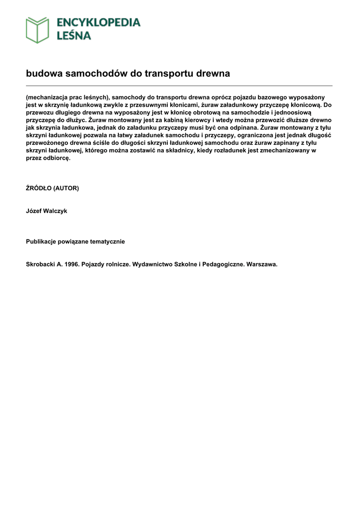 budowa samochodów do transportu drewna (mechanizacja prac leśnych), samochody do transportu drewna oprócz pojazdu bazowego wyposażony jest w skrzynię ładunkową zwykle z przesuwnymi kłonicami, żuraw załadunkowy przyczepę kłonicową. Do przewozu długiego drewna na wyposażony jest w kłonicę obrotową na samochodzie i jednoosiową przyczepę do dłużyc. Żuraw montowany jest za kabiną kierowcy i wtedy można przewozić dłuższe drewno jak skrzynia ładunkowa, jednak do załadunku przyczepy musi być ona odpinana. Żuraw montowany z tyłu skrzyni ładunkowej pozwala na łatwy załadunek samochodu i przyczepy, ograniczona jest jednak długość przewożonego drewna ściśle do długości skrzyni ładunkowej samochodu oraz żuraw zapinany z tyłu skrzyni ładunkowej, którego można zostawić na składnicy, kiedy rozładunek jest zmechanizowany w przez odbiorcę. ŹRÓDŁO (AUTOR) Józef Walczyk Publikacje powiązane tematycznie Skrobacki A. 1996. Pojazdy rolnicze. Wydawnictwo Szkolne i Pedagogiczne. Warszawa.