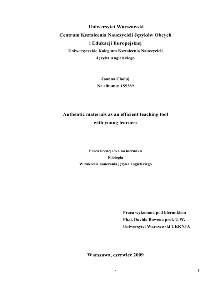 Uniwersytet Warszawski Centrum Kształcenia Nauczycieli Języków Obcych i Edukacji Europejskiej Uniwersyteckie Kolegium Kształcenia Nauczycieli Języka Angielskiego Joanna Chołuj Nr albumu: 155289 Authentic materials as an efficient teaching tool with young learners Praca licencjacka na kierunku Filologia W zakresie nauczania języka angielskiego Praca wykonana pod kierunkiem Ph.d. Davida Bowena prof. U.W. Uniwersytet Warszawski UKKNJA Warszawa, czerwiec 2009 - 1 Oświadczenie kierującego pracą Oświadczam, Ŝe niniejsza praca została przygotowana pod moim kierunkiem i stwierdzam, Ŝe spełnia ona warunki do przedstawieniu jej w postępowaniu o nadanie tytułu zawodowego. Data Podpis kierującego pracą Oświadczenie autora pracy Świadom odpowiedzialności prawnej oświadczam, Ŝe niniejsza praca dyplomowa została napisana przeze mnie samodzielnie i nie zawiera treści uzyskanych w sposób niezgodny z obowiązującymi przepisami. Oświadczam równieŜ, Ŝe przedstawiona przeze mnie praca nie była wcześniej przedmiotem procedur związanych z uzyskaniem tytułu zawodowego w wyŜszej uczelni. Oświadczam ponadto, Ŝe niniejsza wersja pracy jest identyczna z załączoną wersją elektroniczną. Data Podpis autora pracy - 2 Streszczenie Niniejsza praca, nosząca tytuł “Materiały autentyczne jako skuteczna metoda nauczania dzieci”, składa się z dwóch zasadniczych części, teoretycznej i praktycznej. W części teoretycznej zawarto charakterystykę grupy wiekowej, oraz analizę specyfiki nauczania dzieci w tym wieku. Następnie omówiono pojęcie materiałów autentycznych i wymieniono najwaŜniejsze ich rodzaje. Ponadto przedstawiono definicję terminu „zarządzanie klasą” i podano najwaŜniejsze sposoby wprowadzania i utrzymywania dyscypliny w klasie przedszkolnej. Zaprezentowano równieŜ trzy najczęściej powtarzające się problemy i podano propozycje ich rozwiązania z wykorzystaniem materiałów autentycznych. W części praktycznej zamieszczono opis trzech lekcji przeprowadzonych z wykorzystaniem materiałów autentycznych w oparciu o omówione wskazówki teoretyczne dotyczące roli materiałów autentycznych w rozwiązywaniu problemów dyscyplinarnych. Słowa kluczowe Nauczanie przedszkolaków Materiały autentyczne Zarządzanie klasą Dyscyplina Motywacja Zachowanie uczniów Zainteresowanie Dziedzina pracy : Nauczanie dzieci 05100 Kształcenie nauczycieli Tytuł pracy w języku polskim: Materiały autentyczne jako skuteczna metoda nauczania dzieci - 3 Table of contents: 1. Introductory section 5 1.1. Justification of the topic and the aims of the project……………………………… 5 1.2. Teaching environment and the class profile ……………………………………… 5 2. Theoretical background 7 2.1. Young learners……………………………………………………………………. 7 2.1.1. Definition of ‘young learners of the preschool age’ …………………... 7 2.1.2. Mental development and behavioural patterns specific for preschoolers 7 2.1.3. Advantages of teaching young learners………………………………… 10 2.1.4. Difficulties in teaching of young learners ……………………………… 11 2.2. Authentic materials……………………………………………………………….. 12 2.2.1. Definition of authentic materials ………………………………………. 12 2.2.2. The application of authentic materials ………………………………… 12 2.3. Class management ……………………………………………………………….. 14 2.3.1. Definition of ‘class management’……………………………………… 14 2.4. Typical behavioural problems in the teaching of preschoolers ……...................... 15 2.4.1. The use of native tongue during the class …………………………….. 15 2.4.2. Disruptive behaviour towards the teacher and other pupils …………… 17 2.4.3. Breaking props and careless handling of authentic materials …………. 18 2.5. Methodology ……………………………………………………………………… 19 2.5.1. Basic techniques of class management ………………………………… 19 2.5.2. How to deal with behavioural problems with help of authentic materials 20 3. Class management techniques in practice 22 3. 1. Lesson 1: The use of native tongue during the class……………………………… 23 3.1.1. Lesson plan 1: description and the choice of materials…………………. 23 3.1.2. After-class reflections and observations ………………………………... 24 3.2. Lesson 2: Disruptive behaviour towards the teacher and other pupils……………. 28 3.2.1. Lesson plan 2: description and the choice of materials ………………… 28 3.2.2. After-class reflections and observations ………………………………… 29 3.3 Lesson 3: Breaking props and careless handling of authentic materials….………… 33 3.3.1. Lesson plan 3: description and the choice of materials ………………… 33 3.3.2. After-class reflections and observations………………………………… 34 4. Conclusions 38 5. Bibliography 40 6. Appendices 42 - 4 1. Introductory section 1.1. Justification of the topic and the aims of the project The topic of the present study states that the author will focus on teaching environment in the preschool language teaching centres. From now on then, the reader may expect that no attention will be given to the primary and higher schooling system and its foreign language teaching situation. I have found the mentioned above area of my interest more disputable and less known to readers. While few will argue whether the language education is necessary within the schooling system, there seems to be a quiet debate in the matter of teaching languages to our youngest children. Teaching or not – some try to ask themselves. This problem itself may be worth a