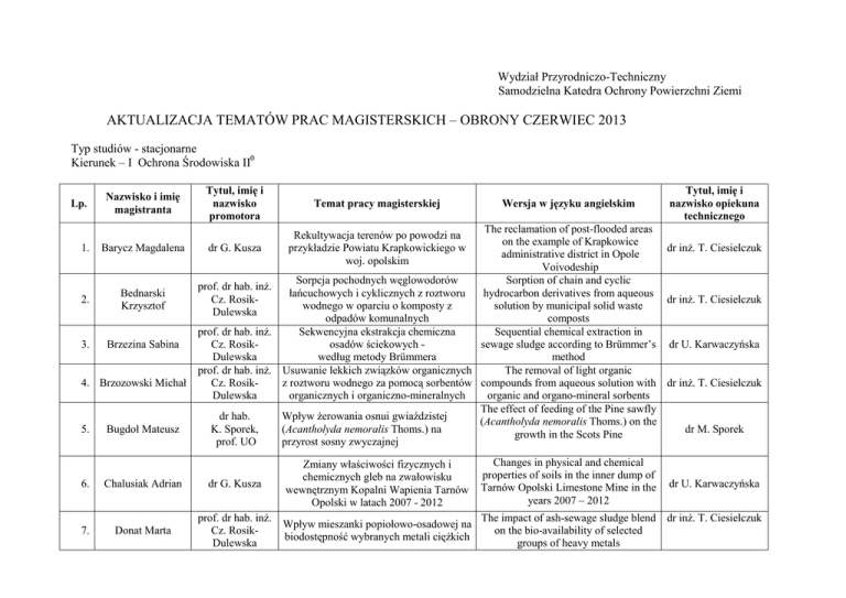 Wydział Przyrodniczo-Techniczny Samodzielna Katedra Ochrony Powierzchni Ziemi AKTUALIZACJA TEMATÓW PRAC MAGISTERSKICH – OBRONY CZERWIEC 2013 Typ studiów - stacjonarne Kierunek – I Ochrona Środowiska II0 Lp. Nazwisko i imię magistranta 1. Barycz Magdalena 2. Bednarski Krzysztof 3. Brzezina Sabina 4. Brzozowski Michał 5. Bugdoł Mateusz Tytuł, imię i nazwisko promotora Temat pracy magisterskiej Wersja w języku angielskim Tytuł, imię i nazwisko opiekuna technicznego The reclamation of post-flooded areas on the example of Krapkowice dr G. Kusza dr inŜ. T. Ciesielczuk administrative district in Opole Voivodeship Sorption of chain and cyclic Sorpcja pochodnych węglowodorów prof. dr hab. inŜ. hydrocarbon derivatives from aqueous łańcuchowych i cyklicznych z roztworu dr inŜ. T. Ciesielczuk Cz. Rosiksolution by municipal solid waste wodnego w oparciu o komposty z Dulewska composts odpadów komunalnych Sekwencyjna ekstrakcja chemiczna Sequential chemical extraction in prof. dr hab. inŜ. Cz. Rosikosadów ściekowych sewage sludge according to Brümmer’s dr U. Karwaczyńska Dulewska według metody Brümmera method prof. dr hab. inŜ. Usuwanie lekkich związków organicznych The removal of light organic Cz. Rosikz roztworu wodnego za pomocą sorbentów compounds from aqueous solution with dr inŜ. T. Ciesielczuk Dulewska organicznych i organiczno-mineralnych organic and organo-mineral sorbents The effect of feeding of the Pine sawfly Wpływ Ŝerowania osnui gwiaździstej dr hab. (Acantholyda nemoralis Thoms.) on the K. Sporek, (Acantholyda nemoralis Thoms.) na dr M. Sporek growth in the Scots Pine prof. UO przyrost sosny zwyczajnej Rekultywacja terenów po powodzi na przykładzie Powiatu Krapkowickiego w woj. opolskim 6. Chalusiak Adrian dr G. Kusza Zmiany właściwości fizycznych i chemicznych gleb na zwałowisku wewnętrznym Kopalni Wapienia Tarnów Opolski w latach 2007 - 2012 7. Donat Marta prof. dr hab. inŜ. Cz. RosikDulewska Wpływ mieszanki popiołowo-osadowej na biodostępność wybranych metali cięŜkich Changes in physical and chemical properties of soils in the inner dump of Tarnów Opolski Limestone Mine in the years 2007 – 2012 The impact of ash-sewage sludge blend dr inŜ. T. Ciesielczuk on the bio-availability of selected groups of heavy metals dr U. Karwaczyńska 8. 9. 10. 11. 12. 13. 14. 15. Rozwiązania systemowe w Europejskim The system solutions in the European Higher Education Area (EHEA) Obszarze Kształcenia WyŜszego (EOKW) concerning university studies in the dr E. Gołąbek Dziwisz Magdalena dotyczące uniwersyteckich studiów w zakresie ochrony środowiska, na area of environmental protection, on the chosen examples wybranych przykładach The analysis of the ambient air dr hab. K. Analiza zanieczyszczeń powietrza pollution in the areas of organized Foltyn Mariola Borecka, atmosferycznego na terenach emisji dr E. Gołąbek emission in the vicinity of Katowice prof. UO zorganizowanej w rejonie huty Katowice steelworks The evaluation of the usefulness of tree Ocena przydatności gatunków drzew prof. dr hab. inŜ. zastosowanych w rekultywacji zwałowiska species applied in the reclamation of the Gołdij Joanna Cz. Rosikwewnętrznego Kopalni Wapienia Tarnów inner dump of Tarnów Opolski dr G. Kusza Dulewska Opolski, z uwzględnieniem właściwości Limestone Mine including soil podłoŜa glebowego substratum properties prof. dr hab. inŜ. Zastosowanie kompostów z odpadów The application of municipal waste Górski Mateusz Cz. Rosikkomunalnych do biodegradacji oleju composts in the motor oil dr inŜ. T. Ciesielczuk Dulewska silnikowego biodegradation Ocena stanu zdrowotnego zieleni wysokiej The evaluation of high greenery health dr hab. K. Grzesiak Monika Borecka, w parkach miasta Kępna status in the parks of Kępno town dr J. Sławiński prof. UO Wykorzystanie programu HEC-RAS w The use of HEC-RAS application in the dr hab. inŜ. modelowaniu przepustowości i połoŜenia modeling of the flow capacity and the mgr Agnieszka Kabała Paulina M. Wiatkowski zwierciadła wody w rzece Strudze water level of the Struga River BroŜonowicz dr hab. K. Borecka, prof. UO Kowalska Marta prof. dr hab. inŜ. Czesława RosikDulewska Ochrona przeciwpowodziowa w Polsce i Niemczech – analiza porównawcza na przykładzie zlewni rzek Odry i Łaby Krupa Mateusz prof. dr hab. inŜ. Czesława RosikDulewska Ocena jakości wody zbiornika retencyjnego Brzózki na rzece Pratwa 16. Lenartowicz Jacek 17. Malczewska Paulina prof. dr hab. inŜ. Cz. RosikDulewska prof. dr hab. inŜ. Cz. RosikDulewska Wyznaczanie sorpcji produktów ropopochodnych metodą wzniosu kapilarnego Ługowanie metali cięŜkich po nawoŜeniu gleb mieszanką popiołowo - osadową Flood protection in Poland and Germany - the comparative analysis based on the examples of the Odra River Basin and the Elbe River Basin The evaluation of water quality of Brzózki water reservoir on the Pratwa River dr hab. inŜ. M. Wiatkowski dr hab. inŜ. M. Wiatkowski The determination of the sorption of oil derivatives by capillary rise method dr inŜ. T. Ciesielczuk The leaching of heavy metals after soil fertilizing with ash-sewage sludge fertilizing mixture dr inŜ. T. Ciesielczuk 18. 19. Nocon Sandra prof. dr hab. inŜ. Sekwencyjna ekstrakcja chemiczna Cz. Rosikosadów ściekowych Dulewska według metody Kerstena i Forstnera Pietrzak Piotr dr hab. inŜ. M. Wiatkowski 20. Potomska Karolina 21. Szołdrowski Tomasz 22. Terlecka Oliwia 23. Wieczorek Katarzyna 24. Wieszołek Grzegorz 25. Włosek Magdalena 26. Wilczek Łukasz 27. Witkowska Magdalena 28. Zając Anna prof. dr hab. inŜ. Cz. RosikDulewska Wpływ zbiornika retencyjnego Kluczbork na przepływy i jakość wody rzeki Stobrawa Sequential chemical extraction in sewage sludge according to Kersten’s and Forstner’s method The influence of Kluczbork Storage Reservoir on the flows and water quality of the Stobrawa River dr U. Karwaczyńska mgr Agnieszka BroŜonowicz Wp