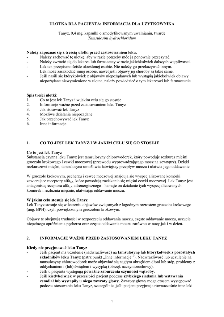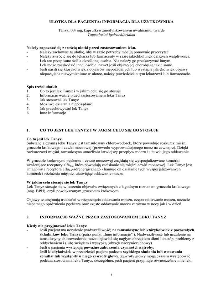 ULOTKA DLA PACJENTA: INFORMACJA DLA UŻYTKOWNIKA Tanyz, 0,4 mg, kapsułki o zmodyfikowanym uwalnianiu, twarde Tamsulosini hydrochloridum Należy zapoznać się z treścią ulotki przed zastosowaniem leku. Należy zachować tę ulotkę, aby w razie potrzeby móc ją ponownie przeczytać. Należy zwrócić się do lekarza lub farmaceuty w razie jakichkolwiek dalszych wątpliwości. Lek ten przepisano ściśle określonej osobie. Nie należy go przekazywać innym. Lek może zaszkodzić innej osobie, nawet jeśli objawy jej choroby są takie same. Jeśli nasili się którykolwiek z objawów niepożądanych lub wystąpią jakiekolwiek objawy niepożądane niewymienione w ulotce, należy powiedzieć o tym lekarzowi lub farmaceucie. Spis treści ulotki: 1. Co to jest lek Tanyz i w jakim celu się go stosuje 2. Informacje ważne przed zastosowaniem leku Tanyz 3. Jak stosować lek Tanyz 4. Możliwe działania niepożądane 5. Jak przechowywać lek Tanyz 6. Inne informacje 1. CO TO JEST LEK TANYZ I W JAKIM CELU SIĘ GO STOSUJE Co to jest lek Tanyz Substancją czynną leku Tanyz jest tamsulosyny chlorowodorek, który powoduje rozkurcz mięśni gruczołu krokowego i cewki moczowej (przewodu wyprowadzającego mocz na zewnątrz). Dzięki rozkurczowi mięśni, tamsulosyna umożliwia łatwiejszy przepływ moczu i ułatwia jego oddawanie. W gruczole krokowym, pęcherzu i cewce moczowej znajdują się wyspecjalizowane komórki zawierające receptory alfa1A, które powodują zaciskanie się mięśni cewki moczowej. Lek Tanyz jest antagonistą receptora alfa1A-adrenergicznego - hamuje on działanie tych wyspecjalizowanych komórek i rozluźnia mięśnie, ułatwiając oddawanie moczu. W jakim celu stosuje się lek Tanyz Lek Tanyz stosuje się w leczeniu objawów związanych z łagodnym rozrostem gruczołu krokowego (ang. BPH), czyli powiększonym gruczołem krokowym. Objawy te obejmują trudności w rozpoczęciu oddawania moczu, częste oddawanie moczu, uczucie niepełnego opróżnienia pęcherza oraz częste oddawanie moczu zarówno w nocy jak i w dzień. 2. INFORMACJE WAŻNE PRZED ZASTOSOWANIEM LEKU TANYZ Kiedy nie przyjmować leku Tanyz Jeśli pacjent ma uczulenie (nadwrażliwość) na tamsulosynę lub którykolwiek z pozostałych składników leku Tanyz (patrz punkt ,,Inne informacje’’). Nadwrażliwość lub uczulenie na tamsulosyny chlorowodorek może objawiać się nagłym obrzękiem dłoni lub stóp, problemy z oddychaniem i (lub) świądem i wysypką (obrzęk naczynioruchowy). Jeśli u pacjenta występują poważne zaburzenia czynności wątroby. Jeśli kiedykolwiek w przeszłości pacjent podczas szybkiego siadania lub wstawania zemdlał lub wystąpiły u niego zawroty głowy. Zawroty głowy mogą czasem występować podczas stosowania leku Tanyz, szczególnie, jeśli pacjent przyjmuje równocześnie inne leki 1 blokujące receptory alfa1-adrenergiczne. Jeśli pacjent odczuwa osłabienie lub zawroty głowy, należy natychmiast usiąść lub położyć się i poczekać do chwili ustąpienia objawów. Kiedy zachować szczególną ostrożność stosując lek Tanyz (oraz skontaktować się z lekarzem) Jeśli u pacjenta występują zaburzenia czynności nerek. U pacjentów poddawanych operacji oczu z powodu zmętnienia soczewek (zaćma). Jeśli planowana jest operacja zaćmy pacjent powinien powiadomić lekarza okulistę o przyjmowaniu obecnie lub ostatnio chlorowodorku tamsulosyny. Lekarz okulista może wtedy zastosować odpowiednie środki ostrożności poprzez dobór odpowiednich leków bądź technik chirurgicznych. Należy zapytać lekarza, czy potrzebne jest przesunięcie w czasie lub okresowe odstawienie leku z powodu przeprowadzanej operacji zaćmy. Jeśli u pacjenta podczas stosowania tamsulosyny wystąpią nagłe obrzęki dłoni i stóp, problemy z oddychaniem i (lub) świąd i wysypka spowodowane reakcją alergiczną (obrzęk naczynioruchowy). Stosowanie innych leków Należy powiadomić lekarza o wszystkich innych przyjmowanych lekach, szczególnie o lekach obniżających ciśnienie tętnicze, ponieważ istnieje potencjalne ryzyko nasilenia ich działania podczas stosowania leku Tanyz. U niektórych pacjentów stosujących, w leczeniu wysokiego ciśnienia tętniczego lub powiększenia gruczołu krokowego, leki blokujące receptory alfa-adrenergiczne, mogą podczas szybkiego siadania lub wstawania wystąpić zawroty głowy spowodowane obniżeniem ciśnienia. U niektórych pacjentów objawy te występują podczas leczenia zaburzeń erekcji (impotencja) przy użyciu antagonistów receptorów alfa-adrenergicznych. W celu zmniejszenia prawdopodobieństwa wystąpienia tych objawów pacjent powinien zażywać regularnie dawkę dobową leku blokującego receptor alfa, zanim rozpocznie leczenie zaburzeń erekcji. Przed jakimkolwiek zabiegiem operacyjnym czy dentystycznym należy poinformować lekarza o przyjmowaniu leku Tanyz, ponieważ istnieje potencjalne ryzyko wpływu na działanie leku znieczulającego. Należy powiedzieć lekarzowi lub farmaceucie o wszystkich przyjmowanych aktualnie lub ostatnio lekach, również tych, które wydawane są bez recepty. Prowadzenie pojazdów i obsługiwanie maszyn Jeśli u pacjenta występują omdlenia, zawroty głowy, senność lub zaburzenia widzenia, nie powinien on prowadzić pojazdów oraz obsługiwać maszyn do momentu ustąpienia dolegliwości. 3. JAK STOSOWAĆ LEK TANYZ Dawkowanie Dawka leku stosowana u dorosłych i pacjentów w wieku podeszłym to jedna kapsułka przyjmowana każdego dnia. Kapsułki należy przyjmować po śniadaniu lub po pierwszym posiłku w danym dniu. Kapsułki należy połykać w całości, nie należy ich żuć ani kruszyć. Podczas stosowania leku lekarz może uznać za stosowne przeprowadzanie okresowych badań pacjenta. Przyjęcie większej niż zalecana dawki leku Tanyz W razie przyjęcia większej niż zalecana dawki leku należy niezwłocznie zwrócić się do lekarza lub udać się na oddział ratunkowy najbliższego szp