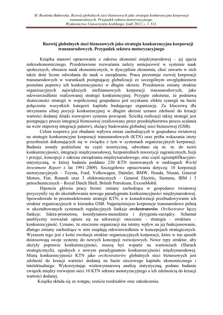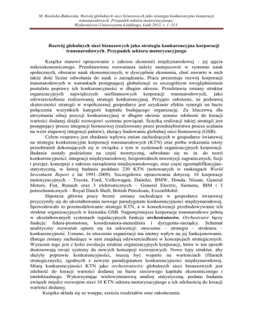 M. Rosińska-Bukowska, Rozwój globalnych sieci biznesowych jako strategia konkurencyjna korporacji transnarodowych. Przypadek sektora motoryzacyjnego, Wydawnictwo Uniwersytetu Łódzkiego, Łódź 2012, s. 1–513. Rozwój globalnych sieci biznesowych jako strategia konkurencyjna korporacji transnarodowych. Przypadek sektora motoryzacyjnego Książka stanowi opracowanie z zakresu ekonomii międzynarodowej – jej ujęcia mikroekonomicznego. Przedstawione rozważania należy umiejscowić w systemie nauk społecznych, obszarze nauk ekonomicznych, w dyscyplinie ekonomia, choć zawarto w nich także dość liczne odwołania do nauk o zarządzaniu. Praca prezentuje rozwój korporacji transnarodowych w warunkach postępującej globalizacji ze szczególnym uwzględnieniem postulatu poprawy ich konkurencyjności w długim okresie. Przedstawia zmiany struktur organizacyjnych największych niefinansowych korporacji transnarodowych, jako odzwierciedlenie realizowanej strategii konkurencyjnej. Przyjęto założenie, że podstawą skuteczności strategii w współczesnej gospodarce jest uzyskanie efektu synergii na bazie połączenia wszystkich kategorii kapitału budującego organizację. Za kluczową dla utrzymania silnej pozycji konkurencyjnej w długim okresie uznano zdolność do kreacji wartości dodanej dzięki rozwojowi systemu powiązań. Ścieżką realizacji takiej strategii jest postępujący proces integracji biznesowej (realizowany przez przedsiębiorstwa proces scalania na wzór etapowej integracji państw), służący budowaniu globalnej sieci biznesowej (GSB). Celem rozprawy jest zbadanie wpływu zmian zachodzących w gospodarce światowej na strategie konkurencyjne korporacji transnarodowych (KTN) oraz próba wskazania istoty przeobrażeń dokonujących się w związku z tym w systemach organizacyjnych korporacji. Badania zostały podzielone na część teoretyczną, odwołano się m. in. do teorii konkurencyjności, integracji międzynarodowej, bezpośrednich inwestycji zagranicznych, fuzji i przejęć, koncepcji z zakresu zarządzania międzynarodowego, oraz część egzemplifikacyjnostatystyczną, w której badaniu poddano 230 KTN (notowanych w rankingach World Investment Report z lat 1991–2009). Szczegółowe opracowania dotyczą: 10 korporacji motoryzacyjnych – Toyota, Ford, Volkswagen, Daimler, BMW, Honda, Nissan, General Motors, Fiat, Renault oraz 3 elektronicznych – General Electric, Siemens, IBM i 3 petrochemicznych – Royal Dutch Shell, British Petroleum, ExxonMobil. Hipoteza główna pracy brzmi: zmiany zachodzące w gospodarce światowej przyczyniły się do ukształtowania nowego paradygmatu konkurencyjności międzynarodowej. Spowodowało to przemodelowanie strategii KTN, a w konsekwencji przebudowywanie ich struktur organizacyjnych w kierunku GSB. Najpotężniejsze korporacje transnarodowe pełnią w ukształtowanych systemach regulacyjnych funkcje orchestratorów. Orchestrator łączy funkcje: lidera-promotora, koordynatora-menedżera i dyrygenta-zarządcy. Schemat analityczny rozważań opiera się na sekwencji: otoczenie – strategia – struktura – konkurencyjność. Uznano, że otoczenie organizacji ma istotny wpływ na jej funkcjonowanie, dlatego zmiany zachodzące w nim znajdują odzwierciedlenie w koncepcjach strategicznych. Wyrazem tego jest z kolei ewolucja struktur organizacyjnych korporacji, które w ten sposób dostosowują swoje systemy do nowych koncepcji rozwojowych. Nowe typy struktur, aby służyły poprawie konkurencyjności, muszą być wsparte na wartościach (filarach strategicznych), zgodnych z nowym paradygmatem konkurencyjności międzynarodowej. Miarą konkurencyjności KTN jako orchestratorów globalnych sieci biznesowych jest zdolność do kreacji wartości dodanej na bazie sieciowego kapitału ekonomicznego i intelektualnego. Wykorzystując wielowymiarową analizę statystyczną, podano badaniu związek między rozwojem sieci 10 KTN sektora motoryzacyjnego a ich zdolnością do kreacji wartości dodanej. Książka składa się ze wstępu, sześciu rozdziałów oraz zakończenia. M. Rosińska-Bukowska, Rozwój globalnych sieci biznesowych jako strategia konkurencyjna korporacji transnarodowych. Przypadek sektora motoryzacyjnego, Wydawnictwo Uniwersytetu Łódzkiego, Łódź 2012, s. 1–513. Celem rozdziału I jest próba wykazania, że postępująca globalizacja ma zasadnicze znaczenie dla kierunków zmian w KTN. Tworzy sprzyjający klimat dla rozwoju podmiotom otwartym na zacieśnianie współpracy w skali globalnej. Korporacje realizują swoje strategie ekspansji, angażując się w różnego typu formy integracyjne: budują globalne łańcuchy produkcyjne, dokonują inwestycji bezpośrednich (BIZ), a także kolejnych fuzji i przejęć (M&As). Zaakcentowano, że cechą charakterystyczną obecnego etapu – globalizacji korporacyjnej jest konkurowanie między systemami korporacyjnymi (koalicjami), a nie pojedynczymi podmiotami. Celem rozdziału II jest próba wykazania, że czynnikiem decydującym o konkurencyjności w długim okresie jest założona strategia rozwoju, a jej widocznym na zewnątrz obrazem jest sposób kształtowania struktur organizacyjnych. Realizacja zaawansowanych strategii konkurencyjnych powoduje, że modele organizacyjne korporacji stają się coraz bardziej złożone. Konsekwencją dla badań nad konkurencyjnością jest interdyscyplinarność współczesnej teorii przedsiębiorstwa, która uzasadnia zbudowanie nowego paradygmatu konkurencyjności międzynarodowej. Celem rozdziału III jest próba wykazania, że globalizacja, zmieniając charakter konkurencji, dokonała redefinicji znaczenia poszczególnych kategorii kapitału organizacji, co spowodowało przekształcanie korporacji transnarodowych w organizacje sieciowe. Sieci stanowią strukturę regulacyjną, umiejscowioną między rynkiem a hierarchią. Najwyższą formą organizacyjną, odpowiadającą na wyzwania gospodarki opartej na wiedzy, są G