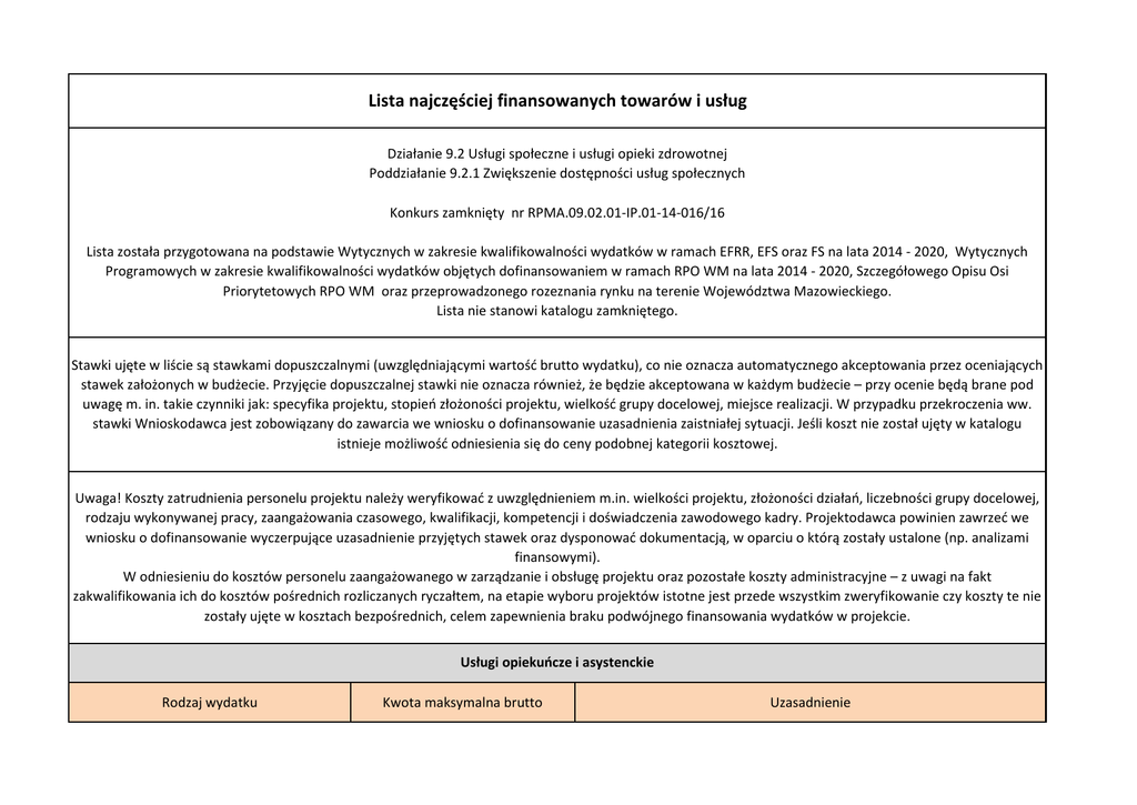 Lista najczęściej finansowanych towarów i usług Działanie 9.2 Usługi społeczne i usługi opieki zdrowotnej Poddziałanie 9.2.1 Zwiększenie dostępności usług społecznych Konkurs zamknięty nr RPMA.09.02.01-IP.01-14-016/16 Lista została przygotowana na podstawie Wytycznych w zakresie kwalifikowalności wydatków w ramach EFRR, EFS oraz FS na lata 2014 - 2020, Wytycznych Programowych w zakresie kwalifikowalności wydatków objętych dofinansowaniem w ramach RPO WM na lata 2014 - 2020, Szczegółowego Opisu Osi Priorytetowych RPO WM oraz przeprowadzonego rozeznania rynku na terenie Województwa Mazowieckiego. Lista nie stanowi katalogu zamkniętego. Stawki ujęte w liście są stawkami dopuszczalnymi (uwzględniającymi wartość brutto wydatku), co nie oznacza automatycznego akceptowania przez oceniających stawek założonych w budżecie. Przyjęcie dopuszczalnej stawki nie oznacza również, że będzie akceptowana w każdym budżecie – przy ocenie będą brane pod uwagę m. in. takie czynniki jak: specyfika projektu, stopień złożoności projektu, wielkość grupy docelowej, miejsce realizacji. W przypadku przekroczenia ww. stawki Wnioskodawca jest zobowiązany do zawarcia we wniosku o dofinansowanie uzasadnienia zaistniałej sytuacji. Jeśli koszt nie został ujęty w katalogu istnieje możliwość odniesienia się do ceny podobnej kategorii kosztowej. Uwaga! Koszty zatrudnienia personelu projektu należy weryfikować z uwzględnieniem m.in. wielkości projektu, złożoności działań, liczebności grupy docelowej, rodzaju wykonywanej pracy, zaangażowania czasowego, kwalifikacji, kompetencji i doświadczenia zawodowego kadry. Projektodawca powinien zawrzeć we wniosku o dofinansowanie wyczerpujące uzasadnienie przyjętych stawek oraz dysponować dokumentacją, w oparciu o którą zostały ustalone (np. analizami finansowymi). W odniesieniu do kosztów personelu zaangażowanego w zarządzanie i obsługę projektu oraz pozostałe koszty administracyjne – z uwagi na fakt zakwalifikowania ich do kosztów pośrednich rozliczanych ryczałtem, na etapie wyboru projektów istotne jest przede wszystkim zweryfikowanie czy koszty te nie zostały ujęte w kosztach bezpośrednich, celem zapewnienia braku podwójnego finansowania wydatków w projekcie. Usługi opiekuńcze i asystenckie Rodzaj wydatku Kwota maksymalna brutto Uzasadnienie Asystent osoby niepełnosprawnej 30 zł/godz. Stawka rozumiana jako godzina zegarowa Opieka nad osobą zależną (umowa zlecenie) 20 zł/godz. Stawka rozumiana jako godzina zegarowa 30 zł/godz. Stawka rozumiana jako godzina zegarowa 120 zł/godz. 170 zł/godz. 170 zł/godz. Stawka rozumiana jako godzina zegarowa Stawka rozumiana jako godzina zegarowa Stawka rozumiana jako godzina zegarowa Opieka nad osobą niepełnosprawną (umowa zlecenie) Fizjoterapeuta Lekarz geriatra Lekarz psychiatra Dowóz do miejsca pracy lub ośrodka wsparcia podstawienie specjalistycznego samochodu 25 zł; każdy przejechany 1 km - 2,50 zł - Działania umożliwiające pozostawanie osób z niepełnosprawnościami i osób niesamodzielnych w lokalnej społeczności Rodzaj wydatku Kwota maksymalna brutto Zakup taboretu pod prysznic 130 zł/szt. Zakup maty antypoślizgowej na wannę lub pod prysznic 60 zł/szt. Zakup uchwytów do łazienki Zakup laski dla osób niewidomych 100 zł/szt. 100 zł/szt. Zakup naklejki brajlowskiej na klawiaturę 160 zł/szt. Zakup szyn podjazdowych Montaż szyn teleskopowych 1 000 zł/szt. 2 500 zł/szt. Usługi opiekuńcze realizowane w oparciu o nowoczesne technologie informacyjno-komunikacyjne Rodzaj wydatku Zakup zestawu teleopieki Kwota maksymalna brutto 1 500 zł Uzasadnienie Cena dotyczy zakupu terminala teleopieki Działania wspierające opiekunów faktycznych Rodzaj wydatku Kwota maksymalna brutto Szkolenia z zakresu sprawowania opieki nad osobą niesamodzielną Poradnictwo psychologiczne Poradnictwo prawne Terapeuta (umowa zlecenie) Uzasadnienie 750 zł/kurs Cena dotyczy kursu 100 zł/godz. 150 zł/godz. 90 zł/godz. Stawka rozumiana jako godzina zegarowa Stawka rozumiana jako godzina zegarowa Stawka rozumiana jako godzina zegarowa Wypożyczalnie sprzętu pielęgnacyjnego i wspomagającego Rodzaj wydatku Kwota maksymalna brutto Wypożyczenie wózka inwalidzkiego 50 zł/miesiąc Wypożyczenie balkonika rehabilitacyjnego 30 zł/miesiąc Wypożyczenie chodzika rehabilitacyjnego 40 zł/miesiąc Wypożyczenie podośnika wannowego Wypożyczenie schodołazów Wypożyczenie kul inwalidzkich 100 zł/miesiąc 270 zł/miesiąc 20 zł/miesiąc/szt. Rozwój usług mieszkalnictwa wspieranego Rodzaj wydatku Pracownik socjalny (umowa zlecenie) Kwota maksymalna brutto 60 zł/godz. Uzasadnienie Stawka rozumiana jako godzina zegarowa. Wydatki towarzyszące Rodzaj wydatku Kwota maksymalna brutto/jednostka miary Uzasadnienie Zwrot kosztów dojazdu Nocleg w kraju Wydatek kwalifikowalny jedynie w przypadku uczestniczenia we wsparciu oferowanym poza miejscem zamieszkania oraz w związku z uzasadnionymi potrzebami grupy docelowej (np. koszty dojazdów dla osób niepełnosprawnych, bezrobotnych). Zaleca się, aby podróż odbywała się publicznymi/zbiorowymi środkami transportu, z wyjątkiem gdy na danym terenie są uzasadnione powody dla innej formy podróży. Cena uzależniona od cenników Wydatek kwalifikowalny do wysokości opłat za środki transportu operatorów komunikacji publicznej publicznego szynowego lub kołowego (w przypadku podróży międzynarodowych także transportu lotniczego) zgodnie z cennikiem biletów II klasy obowiązującym na danym obszarze, także w przypadku korzystania ze środków transportu prywatnego (w szczególności samochodem lub taksówką) jako refundacja wydatku faktycznie poniesionego do ww. wysokości. Wydatek kwalifikowalny, o ile jest to uzasadnione specyfiką i celami realizowanego projektu. Usługa powinna być realizowana w przypadku warsztatów/spotkań co najmniej dwudniowych. Nie ma możliwości Hotel o maksyma