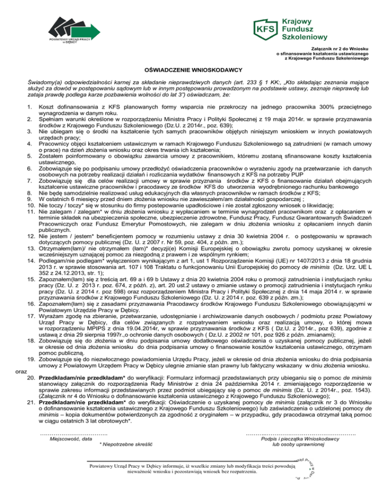 Załącznik nr 2 do Wniosku o sfinansowanie kształcenia ustawicznego z Krajowego Funduszu Szkoleniowego OŚWIADCZENIE WNIOSKODAWCY Świadomy(a) odpowiedzialności karnej za składanie nieprawdziwych danych (art. 233 § 1 KK:, „Kto składając zeznania mające służyć za dowód w postępowaniu sądowym lub w innym postępowaniu prowadzonym na podstawie ustawy, zeznaje nieprawdę lub zataja prawdę podlega karze pozbawienia wolności do lat 3”) oświadczam, że: 1. 2. 3. 4. 5. 6. 7. 8. 9. 10. 11. 12. 13. 14. 15. 16. 17. 18. 19. Koszt dofinansowania z KFS planowanych formy wsparcia nie przekroczy na jednego pracownika 300% przeciętnego wynagrodzenia w danym roku. Spełniam warunki określone w rozporządzeniu Ministra Pracy i Polityki Społecznej z 19 maja 2014r. w sprawie przyznawania środków z Krajowego Funduszu Szkoleniowego (Dz.U. z 2014r., poz. 639); Nie ubiegam się o środki na kształcenie tych samych pracowników objętych niniejszym wnioskiem w innych powiatowych urzędach pracy; Pracownicy objęci kształceniem ustawicznym w ramach Krajowego Funduszu Szkoleniowego są zatrudnieni (w ramach umowy o prace) na dzień złożenia wniosku oraz okres trwania ich kształcenia; Zostałem poinformowany o obowiązku zawarcia umowy z pracownikiem, któremu zostaną sfinansowane koszty kształcenia ustawicznego, Zobowiązuje się po podpisaniu umowy przedłożyć oświadczenia pracowników o wyrażeniu zgody na przetwarzanie ich danych osobowych na potrzeby realizacji działań i rozliczania wydatków finansowych z KFS na potrzeby PUP Zobowiązuję się dla celów realizacji umowy w sprawie przyznania środków z KFS o finansowanie działań obejmujących kształcenie ustawiczne pracowników i pracodawcy ze środków KFS do utworzenia wyodrębnionego rachunku bankowego Nie będę samodzielnie realizować usług edukacyjnych dla własnych pracowników w ramach środków z KFS; W ostatnich 6 miesięcy przed dniem złożenia wniosku nie zawieszałem/am działalności gospodarczej ; Nie toczy / toczy* się w stosunku do firmy postepowanie upadłościowe i nie został zgłoszony wniosek o likwidację; Nie zalegam / zalegam* w dniu złożenia wniosku z wypłacaniem w terminie wynagrodzeń pracownikom oraz z opłacaniem w terminie składek na ubezpieczenia społeczne, ubezpieczenie zdrowotne, Fundusz Pracy, Fundusz Gwarantowanych Świadczeń Pracowniczych oraz Fundusz Emerytur Pomostowych, nie zalegam w dniu złożenia wniosku z opłacaniem innych danin publicznych. Nie jestem / jestem* beneficjentem pomocy w rozumieniu ustawy z dnia 30 kwietnia 2004 r. o postępowaniu w sprawach dotyczących pomocy publicznej (Dz. U. z 2007 r. Nr 59, poz. 404, z późn. zm.); Otrzymałem(łam)/ nie otrzymałem (łam)* decyzji(e) Komisji Europejskiej o obowiązku zwrotu pomocy uzyskanej w okresie wcześniejszym uznającej pomoc za niezgodną z prawem i ze wspólnym rynkiem; Podlegam/nie podlegam* wyłączeniom wynikającym z art 1, ust 1 Rozporządzenie Komisji (UE) nr 1407/2013 z dnia 18 grudnia 2013 r. w sprawie stosowania art. 107 i 108 Traktatu o funkcjonowaniu Unii Europejskiej do pomocy de minimis (Dz. Urz. UE L 352 z 24.12.2013, str. 1); Zapoznałem(łam) się z treścią art. 69 a i 69 b Ustawy z dnia 20 kwietnia 2004 roku o promocji zatrudnienia i instytucjach rynku pracy (Dz. U. z 2013 r. poz. 674, z późń. z), art. 20 ust.2 ustawy o zmianie ustawy o promocji zatrudnienia i instytucjach rynku pracy (Dz. U. z 2014 r. poz 598) oraz rozporządzeniem Ministra Pracy i Polityki Społecznej z dnia 14 maja 2014 r. w sprawie przyznawania środków z Krajowego Funduszu Szkoleniowego (Dz. U. z 2014 r. poz. 639 z późn. zm.); Zapoznałem(łam) się z zasadami przyznawania Pracodawcy środków Krajowego Funduszu Szkoleniowego obowiązującymi w Powiatowym Urzędzie Pracy w Dębicy. Wyrażam zgodę na zbieranie, przetwarzanie, udostępnianie i archiwizowanie danych osobowych / podmiotu przez Powiatowy Urząd Pracy w Dębicy, dla celów związanych z rozpatrywaniem wniosku oraz realizacją umowy, o której mowa w rozporządzeniu MPIPS z dnia 19.04.2014r, w sprawie przyznawania środków z KFS ( Dz.U. z 2014r., poz 639), zgodnie z ustawą z dnia 29 sierpnia 1997r.,o ochronie danych osobowych ( Dz.U. z 2002 nr 101, poz 926 z późn. zmianami); Zobowiązuję się do złożenia w dniu podpisania umowy dodatkowego oświadczenia o uzyskanej pomocy publicznej, jeżeli w okresie od dnia złożenia wniosku do dnia podpisania umowy o finansowanie kosztów kształcenia ustawicznego, otrzymam pomoc publiczną. Zobowiązuje się do niezwłocznego powiadomienia Urzędu Pracy, jeżeli w okresie od dnia złożenia wniosku do dnia podpisania umowy z Powiatowym Urzędem Pracy w Dębicy ulegnie zmianie stan prawny lub faktyczny wskazany w dniu złożenia wniosku. oraz 20. Przedkładam/nie przedkładam* do weryfikacji: Formularz informacji przedstawianych przy ubieganiu się o pomoc de minimis stanowiący załącznik do rozporządzenia Rady Ministrów z dnia 24 października 2014 r. zmieniającego rozporządzenie w sprawie zakresu informacji przedstawianych przez podmiot ubiegający się o pomoc de minimis (Dz. U. z 2014r., poz. 1543). (Załącznik nr 4 do Wniosku o dofinansowanie kształcenia ustawicznego z Krajowego Funduszu Szkoleniowego); 21. Przedkładam/nie przedkładam* do weryfikacji: Oświadczenie o uzyskanej pomocy de minimis (załącznik nr 3 do Wniosku o dofinansowanie kształcenia ustawicznego z Krajowego Funduszu Szkoleniowego) lub zaświadczenia o udzielonej pomocy de minimis – kopia dokumentów potwierdzonych za zgodność z oryginałem – w przypadku, gdy pracodawca otrzymał taką pomoc w ciągu ostatnich 3 lat obrotowych*. …………………………….. Miejscowość, data * Niepotrzebne skreślić ………..………………………………………. Podpis i pieczątka Wnioskodawcy lub osoby uprawnionej Powiatowy Urząd Pracy w Dębicy informuje, iż wszelkie zmiany lub modyfikacja treści powod
