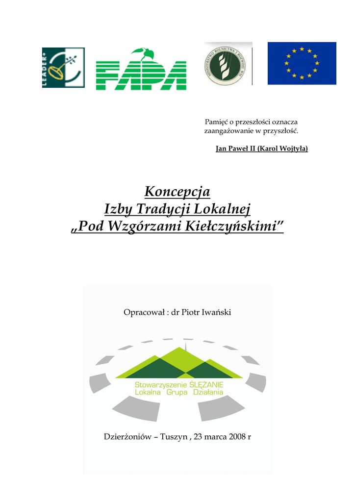Pamięć o przeszłości oznacza zaangaŜowanie w przyszłość. Jan Paweł II (Karol Wojtyła) Koncepcja Izby Tradycji Lokalnej „Pod Wzgórzami Kiełczyńskimi” Opracował : dr Piotr Iwański DzierŜoniów – Tuszyn , 23 marca 2008 r Zawartość koncepcji Izby Tradycji Lokalnej „Pod Wzgórzami Kiełczyńskimi” Wstęp 1. 2. 3. 4. 5. 6. 7. 8. Krótki opis miejscowości. Miejsce wystawienia. Sposób uzyskiwania zbiorów. Rodzaj zbiorów. Sposób prezentacji. Terminy otwarcia i osoby odpowiedzialne za Izbę Tradycji Lokalnej . Promocja Izby Tradycji Lokalnej MoŜliwości pozyskiwania środków. Wstęp Miejsce tradycji lokalnej to przestrzeń, w której powinny spotykać się zarówno przeszłość, jak i przyszłość, w tak szybko umykającej nam chwili obecnej. Nikt z nas nie pochodzi znikąd. Nawet przybywając na kilka dni, miesięcy, lat, tworzymy wokół siebie oswojoną przestrzeń. Otaczamy się wspomnieniami z przeszłych miejsc, w których przyszło nam Ŝyć i spotykać róŜnych ludzi. Wspomnienia te zatrzymane są na fotografiach, w dokumentach, listach, czasami w przedmiotach, kojarzących się nam z minionymi zdarzeniami. Zakorzeniamy się nawet na chwilę, nigdy nie jesteśmy do końca wędrowcem. Nie wiemy teŜ gdzie przydarzy nam się zakończyć naszą podróŜ. KaŜdy z nas ma swoją podróŜ i historię. Pamiątki i rzeczy waŜne, istotne z punktu widzenia jednostki, ale nabierające z czasem znaczenia takŜe dla społeczności, w otoczeniu której zostały wytworzone. KaŜda miejscowość składa się z mieszkańców, fizycznych osób, będących na danym terenie zameldowanych, urodzonych, zamęŜnych czy Ŝonatych. KaŜda miejscowość posiada takŜe pamięć zbiorową, nie będącą jedynie sumą wspomnień pojedynczych osób, lecz na pewno z tych wspomnień się składającą. Tradycję lokalną budują takŜe zdarzenia, emocje, wspomnienia, wyobraŜenia, pamięć, związane z sąsiadami, miejscami, spotkaniami, przeŜytymi pierwszymi chwilami w Ŝyciu. Bez miejsca i sposobu prezentacji ulotnych chwil przeszłości, informacje te znikną wraz z ludźmi, którzy je wytworzyli. Dlatego, wśród mieszkańców, powstaje czasem idea miejsca, które zebrałoby te wszystkie historie, rzeczy, pamiątki, wspomnienia, marzenia, moŜe nawet sny ? Tak było w Tuszynie. Mieszkańcy kilku wsi poczuli potrzebę udokumentowania swojej obecności tutaj. Zapisania się w rzeczywistości. Tworzenia jej. PoniŜsza koncepcja jest wynikiem rozmów i spotkań z mieszkańcami wsi, nauczycielami ze 2 szkoły podstawowej w Tuszynie , członkami rady sołeckiej oraz nauczycielem historii z gimnazjum gminnego, który powołał do Ŝycia Izbę Regionalną Gminy DzierŜoniów. Celem istniejącej Izby Tradycji – miejsca tradycji oprócz uratowania przed zapomnieniem powinno być − kształtowanie poczucia grupowej przynaleŜności, − uczenie tolerancji poprzez rozumienie innych, ich pochodzenia i nawyków kulturowych, − budzenie patriotyzmu lokalnego , − przygotowanie do uczestnictwa w szeroko pojmowanym dziedzictwie kulturowym poprzez działanie w Małej Ojczyźnie, − przygotowanie do Ŝycia w społeczeństwie obywatelskim poprzez aktywność na rzecz własnego środowiska, − poczucie „bycia sobą i u siebie”. 1. Opis miejscowości Tuszyn jest jedną z 15 wsi, naleŜących do gminy DzierŜoniów i liczy ponad 350 mieszkańców. Specyficzne usytuowanie tej miejscowości w jednym ciągu komunikacyjnym z Włókami, Kiełczynem i okolicznymi: KsiąŜnicą oraz Jędrzejowicami, powodują, ze Izba Tradycji nie będzie ograniczać się jedynie do Tuszyna, lecz będzie ona centrum kulturalno - historycznym dla 5 miejscowości. Dlatego przedstawię poniŜej informacje na temat tych pięciu miejscowości. Tuszyn wraz z wymienionymi miejscowościami, leŜy na południowy-zachód od ŚlęŜy, w północnej części Kotliny DzierŜoniowskiej, na wysokości 250-260 m n.p.m. Najstarsza znana nazwa wsi: Villa Henrici wymieniona została w 1283 r. i pochodzi z okresu, kiedy Śląsk naleŜał do Piastów. Inna nazwa wsi: Heinrichsdorf, wymieniona w 1366 r., pochodzi z okresu panowania czeskiego. Kolejną nazwę wsi: Hennersdorff wymieniono w 1677 r., kiedy Śląskiem, jako częścią Czech, władali Habsburgowie. Po II wojnie światowej, kiedy Śląsk przyłączono do Polski, w 1945 r., wieś otrzymała nazwę: Tuszyn. Tuszyn został załoŜony prawdopodobnie przez niemieckich osadników w 1283 r. jako jedna z wielu wsi przy trakcie. Pierwszym znanym właścicielem wsi był wymieniony w 1366 r. Hannus von Betschow. W 1369 r. wieś naleŜała do braci Henselina i Ottona de Ryne, w 1385 r. do Niclosa Gellhorn, a później do von Heine. W 1769 r. właścicielem wsi był von Schweiniz, a w 1785 r. jego córka Dorothea Elisabeth. Od 1825 r. wieś była własnością starościny von Prittwitz-Gaffron, z domu von Seidlitz. Własnością rodziny von Prittwitz-Gaffron wieś pozostała do 1945 r. W Tuszynie znajduje się barokowy pałac z XVIII, przebudowany na przeł. XIX i XX w.. Po gruntownej modernizacji, od 2005 r. w pałacu mieści się szkoła podstawowa, w której murach znajdować się ma Izba Tradycji Lokalnej „Pod Wzgórzami Kiełczyńskimi”. Nad portalem, pod kartuszami herbowymi, znajduje się prawdopodobna data budowy: 1715 r. Pałac otoczony jest załoŜonym w XVIII w. 3 parkiem, w którym znajduje się pawilon ogrodowy. W murze z bramami widoczne są dwie płyty kamienne z kartuszami herbowymi. W parku znajduje się takŜe pomnik odsłonięty 8 maja 2005 r. Jest to obelisk poświęcony pamięci przymusowo wysiedlonych mieszkańców wschodnich terenów II Rzeczypospolitej Polskiej. W Tuszynie znajduje się kościół pw. Najświętszego Serca Pana Jezusa, zbudowany w 1900 r. dla ewangelików. Jest to neoromańska, trzynawowa budowla ze smukłą ośmioboczną wieŜą. Po II wojnie światowej kościół przejęli katolicy. W 1962 r. był remontowany. W centrum wsi, przy budynku nr