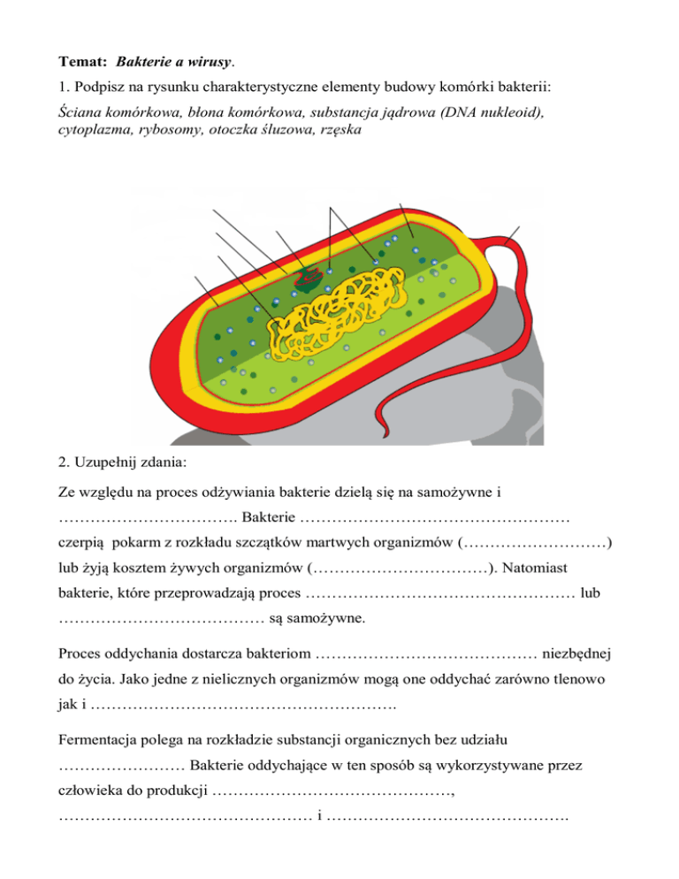 Temat: Bakterie a wirusy. 1. Podpisz na rysunku charakterystyczne elementy budowy komórki bakterii: Ściana komórkowa, błona komórkowa, substancja jądrowa (DNA nukleoid), cytoplazma, rybosomy, otoczka śluzowa, rzęska 2. Uzupełnij zdania: Ze względu na proces odżywiania bakterie dzielą się na samożywne i ……………………………. Bakterie …………………………………………… czerpią pokarm z rozkładu szczątków martwych organizmów (………………………) lub żyją kosztem żywych organizmów (……………………………). Natomiast bakterie, które przeprowadzają proces …………………………………………… lub ………………………………… są samożywne. Proces oddychania dostarcza bakteriom …………………………………… niezbędnej do życia. Jako jedne z nielicznych organizmów mogą one oddychać zarówno tlenowo jak i …………………………………………………. Fermentacja polega na rozkładzie substancji organicznych bez udziału …………………… Bakterie oddychające w ten sposób są wykorzystywane przez człowieka do produkcji ………………………………………, ………………………………………… i ………………………………………. 3. Uzupełnij schemat budowy wirusa: http://www.bryk.pl/słowniki/słownik_biologiczny/87653-wirusy.html 4. Uzupełnij zdania (podręcznik str. 51): Wirusy to …………………………………… formy, które składają się z ……………….………… ……………………………… zamkniętego w otoczce białkowej, zwanej …………………………. Poza organizmem żywiciela ni wykazują żadnych oznak …………………………………… dlatego wirusów nie zaliczamy do …………………………….……………. uaktywniają się dopiero po znalezieniu ……………………………… 5. Ponumeruj etapy infekcji komórki przez wirusy: Materiał genetyczny i białkowe otoczki wirusa są powielane w setkach kopii. Wirus wprowadza do wnętrza komórki swój materiał genetyczny. Wirus przyczepia się do komórki żywiciela. Wydostając się z komórki wirusy powodują jej śmierć i infekują następne komórki.