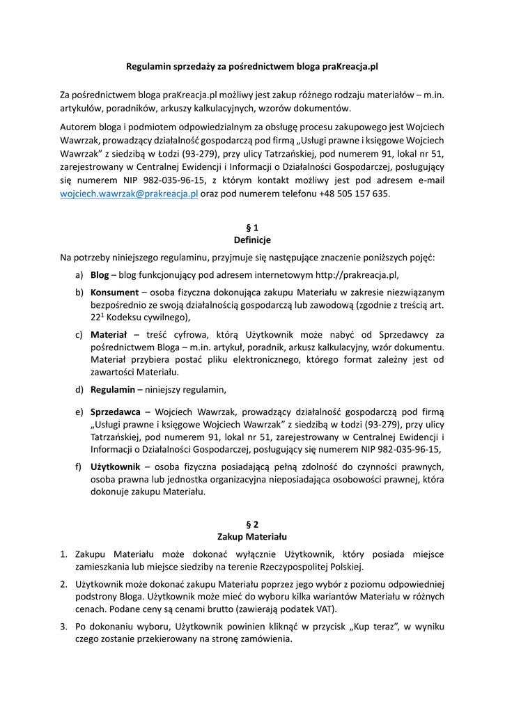 Regulamin sprzedaży za pośrednictwem bloga praKreacja.pl Za pośrednictwem bloga praKreacja.pl możliwy jest zakup różnego rodzaju materiałów – m.in. artykułów, poradników, arkuszy kalkulacyjnych, wzorów dokumentów. Autorem bloga i podmiotem odpowiedzialnym za obsługę procesu zakupowego jest Wojciech Wawrzak, prowadzący działalność gospodarczą pod firmą „Usługi prawne i księgowe Wojciech Wawrzak” z siedzibą w Łodzi (93-279), przy ulicy Tatrzańskiej, pod numerem 91, lokal nr 51, zarejestrowany w Centralnej Ewidencji i Informacji o Działalności Gospodarczej, posługujący się numerem NIP 982-035-96-15, z którym kontakt możliwy jest pod adresem e-mail [email protected] oraz pod numerem telefonu +48 505 157 635. §1 Definicje Na potrzeby niniejszego regulaminu, przyjmuje się następujące znaczenie poniższych pojęć: a) Blog – blog funkcjonujący pod adresem internetowym http://prakreacja.pl, b) Konsument – osoba fizyczna dokonująca zakupu Materiału w zakresie niezwiązanym bezpośrednio ze swoją działalnością gospodarczą lub zawodową (zgodnie z treścią art. 221 Kodeksu cywilnego), c) Materiał – treść cyfrowa, którą Użytkownik może nabyć od Sprzedawcy za pośrednictwem Bloga – m.in. artykuł, poradnik, arkusz kalkulacyjny, wzór dokumentu. Materiał przybiera postać pliku elektronicznego, którego format zależny jest od zawartości Materiału. d) Regulamin – niniejszy regulamin, e) Sprzedawca – Wojciech Wawrzak, prowadzący działalność gospodarczą pod firmą „Usługi prawne i księgowe Wojciech Wawrzak” z siedzibą w Łodzi (93-279), przy ulicy Tatrzańskiej, pod numerem 91, lokal nr 51, zarejestrowany w Centralnej Ewidencji i Informacji o Działalności Gospodarczej, posługujący się numerem NIP 982-035-96-15, f) Użytkownik – osoba fizyczna posiadającą pełną zdolność do czynności prawnych, osoba prawna lub jednostka organizacyjna nieposiadająca osobowości prawnej, która dokonuje zakupu Materiału. §2 Zakup Materiału 1. Zakupu Materiału może dokonać wyłącznie Użytkownik, który posiada miejsce zamieszkania lub miejsce siedziby na terenie Rzeczypospolitej Polskiej. 2. Użytkownik może dokonać zakupu Materiału poprzez jego wybór z poziomu odpowiedniej podstrony Bloga. Użytkownik może mieć do wyboru kilka wariantów Materiału w różnych cenach. Podane ceny są cenami brutto (zawierają podatek VAT). 3. Po dokonaniu wyboru, Użytkownik powinien kliknąć w przycisk „Kup teraz”, w wyniku czego zostanie przekierowany na stronę zamówienia. 4. Na stronie zamówienia, Użytkownik powinien wypełnić formularz zamówienia, a następnie przejść do procedury płatności poprzez kliknięcie w przycisk „Kupuję i płacę”. 5. Płatność realizowana jest za pośrednictwem serwisu Transferuj.pl, którego właścicielem i operatorem jest Krajowy Integrator Płatności Spółka Akcyjna z siedzibą w Poznaniu, przy ul. Św. Marcin 73/6, wpisana do rejestru przedsiębiorców Krajowego Rejestru Sądowego prowadzonego przez Sąd Rejonowy Poznań – Nowe Miasto i Wilda w Poznaniu, VIII Wydział Gospodarczy Krajowego Rejestru Sądowego pod numerem KRS 0000412357, numer NIP 7773061579, REGON 300878437, kapitał zakładowy 4 798 500,00 PLN (wpłacony w całości). 6. Dostępne metody płatności to szybki przelew elektroniczny i płatność kartą. 7. Z chwilą skutecznego dokonania płatności, między Użytkownikiem a Sprzedawcą zawarta zostaje umowa o dostarczenie treści cyfrowej w postaci wybranego przez Użytkownika Materiału, a Użytkownikowi wyświetlona zostaje strona z potwierdzeniem zakupu. 8. Zakupiony przez Użytkownika Materiał dostępny jest do ściągnięcia bezpośrednio ze strony z potwierdzeniem zakupu, o której mowa w ust. 7 powyżej oraz do Użytkownika wysyłana jest automatycznie wiadomość e-mail, w której znajduje się link pozwalający na ściągnięcie zakupionego Materiału. 9. Dokonując zakupu, Użytkownik wyraża zgodę na przesłanie mu faktury dokumentującej zakup w postaci elektronicznej na podany w zamówieniu adres e-mail. Faktura zostanie wysłana Użytkownikowi w ciągu 24 godzin od chwili skutecznego dokonania płatności. §3 Korzystanie z Materiału 1. Materiał stanowi treść cyfrową w rozumieniu ustawy z dnia 30 maja 2014 r. o prawach konsumenta. 2. Do prawidłowego korzystania z Materiału wystarczające jest posiadanie przez Użytkownika standardowego systemu operacyjnego, programu Adobe Acrobat Reader oraz pakietu oprogramowania biurowego Microsoft Office lub jego odpowiedników (Libre Office, Open Office). 3. W przypadku, gdy Użytkownik nie jest w stanie uruchomić pliku obejmującego zakupiony Materiał, proszony jest o kontakt ze Sprzedawcą pod adresem [email protected]. 4. Jeśli charakter Materiału tego wymaga (np. wzór dokumentu prawnego) Użytkownik ma możliwość jego edycji i dostosowania do własnych potrzeb. 5. Sprzedawca nie ponosi odpowiedzialności za sposób w jaki Użytkownik korzysta z Materiału. 6. W ramach umowy zawartej zgodnie z postanowieniami § 2 Regulaminu, Sprzedawca dostarcza Użytkownikowi jedynie treść cyfrową w postaci zakupionego przez Użytkownika Materiału. Sprzedawca nie świadczy na rzecz Użytkownika jakiejkolwiek pomocy przy z korzystaniu z Materiału, a w szczególności nie udziela Użytkownikowi jakiejkolwiek pomocy prawnej w tym zakresie. Użytkownik może zapewnić sobie pomoc Sprzedawcy w tym zakresie w ramach odrębnego porozumienia ze Sprzedawcą i na warunkach ustalonych indywidualnie ze Sprzedawcą. §4 Odstąpienie od umowy 1. Użytkownik będący Konsumentem ma prawo odstąpić od zawartej ze Sprzedawcą umowy w terminie 14 dni od dnia zawarcia umowy. Aby skorzystać z prawa odstąpienia od umowy, Użytkownik musi poinformować Sprzedawcę o swojej decyzji o odstąpieniu od umowy w drodze jednoznacznego oświadczenia (na przykład pismo wysłane pocztą lub pocztą elektroniczną). A