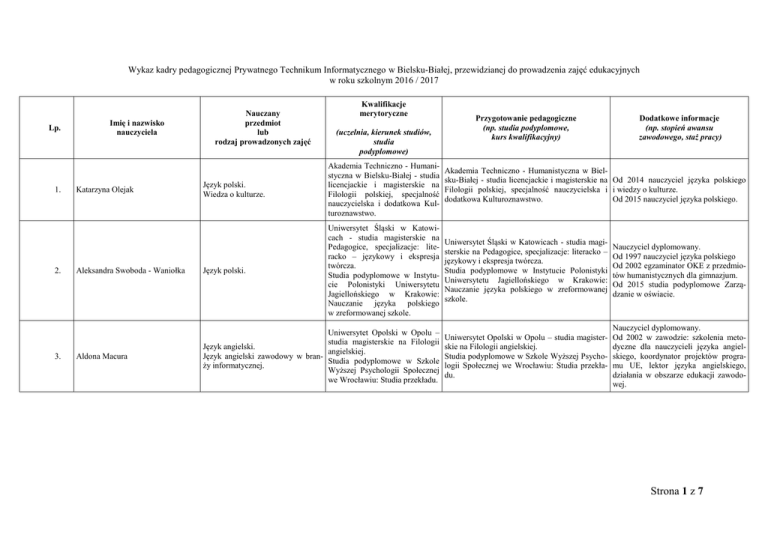 Wykaz kadry pedagogicznej Prywatnego Technikum Informatycznego w Bielsku-Białej, przewidzianej do prowadzenia zajęć edukacyjnych w roku szkolnym 2016 / 2017 Lp. 1. 2. 3. Imię i nazwisko nauczyciela Nauczany przedmiot lub rodzaj prowadzonych zajęć Kwalifikacje merytoryczne (uczelnia, kierunek studiów, studia podyplomowe) Przygotowanie pedagogiczne (np. studia podyplomowe, kurs kwalifikacyjny) Dodatkowe informacje (np. stopień awansu zawodowego, staż pracy) Język polski. Wiedza o kulturze. Akademia Techniczno - Humanistyczna w Bielsku-Białej - studia licencjackie i magisterskie na Filologii polskiej, specjalność nauczycielska i dodatkowa Kulturoznawstwo. Aleksandra Swoboda - Waniołka Język polski. Uniwersytet Śląski w Katowicach - studia magisterskie na Pedagogice, specjalizacje: literacko – językowy i ekspresja twórcza. Studia podyplomowe w Instytucie Polonistyki Uniwersytetu Jagiellońskiego w Krakowie: Nauczanie języka polskiego w zreformowanej szkole. Uniwersytet Śląski w Katowicach - studia magisterskie na Pedagogice, specjalizacje: literacko – językowy i ekspresja twórcza. Studia podyplomowe w Instytucie Polonistyki Uniwersytetu Jagiellońskiego w Krakowie: Nauczanie języka polskiego w zreformowanej szkole. Nauczyciel dyplomowany. Od 1997 nauczyciel języka polskiego Od 2002 egzaminator OKE z przedmiotów humanistycznych dla gimnazjum. Od 2015 studia podyplomowe Zarządzanie w oświacie. Aldona Macura Uniwersytet Opolski w Opolu – studia magisterskie na Filologii Język angielski. angielskiej. Język angielski zawodowy w branStudia podyplomowe w Szkole ży informatycznej. Wyższej Psychologii Społecznej we Wrocławiu: Studia przekładu. Uniwersytet Opolski w Opolu – studia magisterskie na Filologii angielskiej. Studia podyplomowe w Szkole Wyższej Psychologii Społecznej we Wrocławiu: Studia przekładu. Nauczyciel dyplomowany. Od 2002 w zawodzie: szkolenia metodyczne dla nauczycieli języka angielskiego, koordynator projektów programu UE, lektor języka angielskiego, działania w obszarze edukacji zawodowej. Katarzyna Olejak Akademia Techniczno - Humanistyczna w Bielsku-Białej - studia licencjackie i magisterskie na Od 2014 nauczyciel języka polskiego Filologii polskiej, specjalność nauczycielska i i wiedzy o kulturze. dodatkowa Kulturoznawstwo. Od 2015 nauczyciel języka polskiego. Strona 1 z 7 4. 5. 6. Maja Dobija Grzegorz Laszczak Magdalena Zuziak Język hiszpański. Uniwersytet Łódzki w Łodzi – studia magisterskie na Filologii hiszpańskiej dodatkowo Amerykanistyka filologiczna. Akademia Techniczno - Humanistyczna w Bielsku-Białej – studia licencjackie na Filologii hiszpańskiej, specjalizacja: język biznesu i turystyki. Studia podyplomowe kwalifikacyjne na Akademii Techniczno – Humanistycznej w Bielsku – Białej: Przygotowanie pedagogiczne. Uniwersytet Łódzki w Łodzi – studia magisterskie na Filologii hiszpańskiej dodatkowo Amerykanistyka filologiczna. Akademia Techniczno - Humanistyczna w Bielsku-Białej – studia licencjackie na Filologii hiszpańskiej. Studia podyplomowe kwalifikacyjne na Akademii Techniczno – Humanistycznej w Bielsku – Białej: Przygotowanie pedagogiczne. Historia. Wiedza o społeczeństwie. Historia i społeczeństwo. Uniwersytet Śląski w Katowicach - studia magisterskie na Historii, specjalność archiwalna. Studia podyplomowe na Akademii Techniczno – Humanistycznej w Bielsku – Białej: Pedagogika i psychologia. Uniwersytet Śląski w Katowicach - studia magisterskie na Historii, specjalność archiwalna. Studia podyplomowe na Akademii Techniczno – Humanistycznej w Bielsku – Białej: Pedagogika i psychologia. Uniwersytet Śląski w Katowicach – studia magisterskie na Filologii polskiej, specjalizacja nauczycielska. Studia podyplomowe na Uniwersytecie Śląskim w Katowicach: Kwalifikacyjne studia historii. Uniwersytet Śląski w Katowicach – studia magisterskie na Filologii polskiej, specjalizacja nauczycielska. Studia podyplomowe na Uniwersytecie Śląskim w Katowicach: Historia. Historia. Język polski. Od 2013 w zawodzie: lektor języka hiszpańskiego, specjalista ds. obsługi klienta zagranicznego z językiem hiszpańskim, tłumacz angielsko-hiszpański i polsko – hiszpański, nauczyciel języka hiszpańskiego, tłumacz języka hiszpańskiego. Nauczyciel mianowany. Od 1999 do 31.08.2015 nauczyciel historii i WOS. Ukończone Zarządzanie oświatą. Nauczyciel kontraktowy. Od 2010 nauczyciel języka polskiego. Od 2013 nauczyciel języka polskiego i historii. Podyplomowe studia kwalifikacyjne z logopedii. Strona 2 z 7 7. 8. 9. Katarzyna Kolud Alan van der Lee Krzysztof Buczek Akademia Ekonomiczna w Katowicach – studia magisterskie na Zarządzaniu i marketingu. Podstawy przedsiębiorczości. Uniwersytet Ekonomiczny w Działalność gospodarcza w branży Krakowie – studia doktoranckie informatycznej. na Wydziale Ekonomii i StosunEkonomia w praktyce. ków Międzynarodowych. Dyrektor Technikum. Studia podyplomowe na Akademii Techniczno – Humanistycznej w Bielsku-Białej w zakresie doskonalenia pedagogicznego. Geografia. Wiedza o społeczeństwie. Geografia. Podstawy przedsiębiorczości. Informatyka. Doktor nauk ekonomicznych w zakresie nauk o zarządzaniu. Od 2000 w zawodzie: asystent, wykładowca przedmiotów ekonomicznych: podstaw ekonomii, podstaw marketingu, Studia podyplomowe na Akademii Techniczno – ekonomiki i organizacji przedsięHumanistycznej w Bielsku-Białej w zakresie biorstw. doskonalenia pedagogicznego. Od 2007 egzaminator państwowy w zawodzie Technik organizacji reklaNauczyciel akademicki. my (OKE Jaworzno). Od 2006 autor i recenzent zestawów egzaminacyjnych w zawodzie Technik organizacji reklamy (OKE Jaworzno). Uniwersytet Pedagogiczny w Krakowie – studia licencjackie i magisterskie na Geografii z nauczaniem WOS. Uniwersytet Pedagogiczny w Krakowie – studia licencjackie i magisterskie na Geografii z nauczaniem WOS (z uzyskaniem uprawnień do nauczani