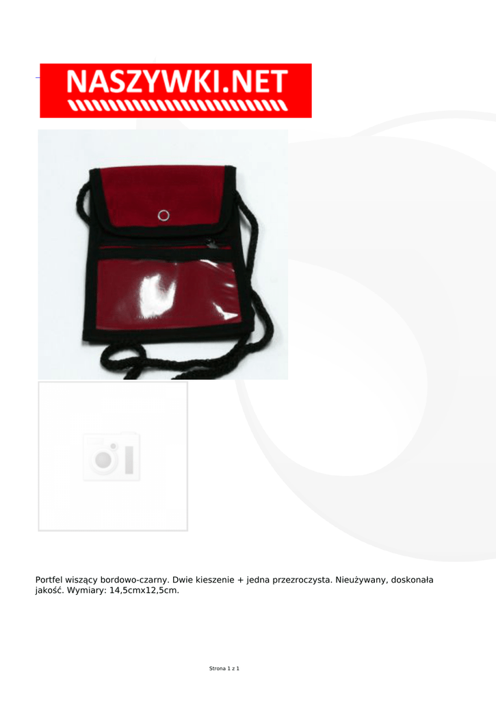 Portfel wiszący bordowo-czarny. Dwie kieszenie + jedna przezroczysta. Nieużywany, doskonała jakość. Wymiary: 14,5cmx12,5cm. Strona 1 z 1