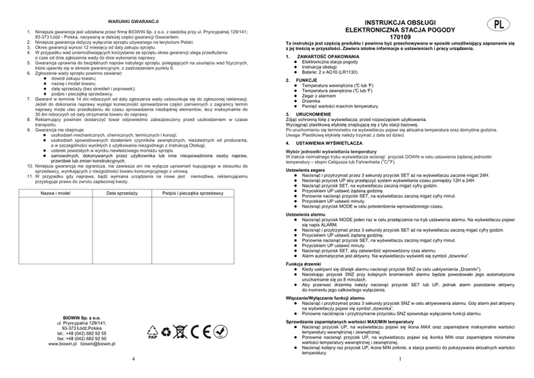 WARUNKI GWARANCJI 1. Niniejsza gwarancja jest udzielana przez firmę BIOWIN Sp. z o.o. z siedzibą przy ul. Pryncypalnej 129/141; 93-373 Łódź - Polska, nazywaną w dalszej części gwarancji Gwarantem. 2. Niniejsza gwarancja dotyczy wyłącznie sprzętu używanego na terytorium Polski. 3. Okres gwarancji wynosi 12 miesięcy od daty zakupu sprzętu. 4. W przypadku wad uniemożliwiających korzystanie ze sprzętu okres gwarancji ulega przedłużeniu o czas od dnia zgłoszenia wady do dnia wykonania naprawy. 5. Gwarancja uprawnia do bezpłatnych napraw nabytego sprzętu, polegających na usunięciu wad fizycznych, które ujawniły się w okresie gwarancyjnym, z zastrzeżeniem punktu 9. 6. Zgłoszenie wady sprzętu powinno zawierać: dowód zakupu towaru; nazwę i model towaru; datę sprzedaży (bez skreśleń i poprawek); podpis i pieczątkę sprzedawcy. 7. Gwarant w terminie 14 dni roboczych od daty zgłoszenia wady ustosunkuje się do zgłoszonej reklamacji. Jeżeli do dokonania naprawy wystąpi konieczność sprowadzenia części zamiennych z zagranicy termin naprawy może ulec przedłużeniu do czasu sprowadzenia niezbędnej elementów, lecz maksymalnie do 30 dni roboczych od daty otrzymania towaru do naprawy. 8. Reklamujący powinien dostarczyć towar odpowiednio zabezpieczony przed uszkodzeniem w czasie transportu. 9. Gwarancja nie obejmuje: uszkodzeń mechanicznych, chemicznych, termicznych i korozji; uszkodzeń spowodowanych działaniem czynników zewnętrznych, niezależnych od producenta, a w szczególności wynikłych z użytkowania niezgodnego z Instrukcją Obsługi; usterek powstałych w wyniku niewłaściwego montażu sprzętu samowolnych, dokonywanych przez użytkownika lub inne nieupoważnione osoby napraw, przeróbek lub zmian konstrukcyjnych. 10. Niniejsza gwarancja nie ogranicza, nie zawiesza ani nie wyłącza uprawnień kupującego w stosunku do sprzedawcy, wynikających z niezgodności towaru konsumpcyjnego z umową. 11. W przypadku gdy naprawa, bądź wymiana urządzenia na nowe jest niemożliwa, reklamującemu przysługuje prawo do zwrotu zapłaconej kwoty. Nazwa i model Data sprzedaży Podpis i pieczątka sprzedawcy INSTRUKCJA OBSŁUGI ELEKTRONICZNA STACJA POGODY 170109 Ta instrukcja jest częścią produktu i powinna być przechowywana w sposób umożliwiający zapoznanie się z jej treścią w przyszłości. Zawiera istotne informacje o ustawieniach i pracy urządzenia. 1. ZAWARTOŚĆ OPAKOWANIA Elektroniczna stacja pogody Instrukcja obsługi Baterie: 2 x AG10 (LR1130) 2. FUNKCJE Temperatura wewnętrzna (°C lub °F) Temperatura zewnętrzna (°C lub °F) Zegar z alarmem Drzemka Pamięć wartości max/min temperatury 3. URUCHOMIENIE Zdjąć ochronną folię z wyświetlacza, przed rozpoczęciem użytkowania. Wyciągnąć plastikową etykietę znajdującą się z tyłu stacji bazowej. Po uruchomieniu się termometru na wyświetlaczu pojawi się aktualna temperatura oraz domyślna godzina. Uwaga: Plastikową etykietę należy trzymać z dala od dzieci. 4. USTAWIENIA WYŚWIETLACZA Wybór jednostki wyświetlania temperatury W trakcie normalnego trybu wyświetlacza wcisnąć przycisk DOWN w celu ustawienia żądanej jednostki o o temperatury – stopni Celsjusza lub Fahrenheita ( C/ F). Ustawienia zegara Nacisnąć i przytrzymać przez 3 sekundy przycisk SET aż na wyświetlaczu zacznie migać 24H. Nacisnąć przycisk UP aby przełączyć system wyświetlania czasu pomiędzy 12H a 24H. Nacisnąć przycisk SET, na wyświetlaczu zaczną migać cyfry godzin. Przyciskiem UP ustawić żądaną godzinę. Ponownie nacisnąć przycisk SET, na wyświetlaczu zaczną migać cyfry minut. Przyciskiem UP ustawić minuty. Nacisnąć przycisk MODE w celu potwierdzenia wprowadzonego czasu. Ustawienia alarmu Nacisnąć przycisk MODE jeden raz w celu przełączenia na tryb ustawienia alarmu. Na wyświetlaczu pojawi się napis ALARM. Nacisnąć i przytrzymać przez 3 sekundy przycisk SET aż na wyświetlaczu zaczną migać cyfry godzin. Przyciskiem UP ustawić żądaną godzinę. Ponownie nacisnąć przycisk SET, na wyświetlaczu zaczną migać cyfry minut. Przyciskiem UP ustawić minuty. Nacisnąć przycisk SET, aby zatwierdzić wprowadzony czas alarmu. Alarm automatycznie jest aktywny. Na wyświetlaczu wyświetli się symbol „dzwonka”. Funkcja drzemki Kiedy uaktywni się dźwięk alarmu nacisnąć przycisk SNZ (w celu uaktywnienia „Drzemki”). Naciskając przycisk SNZ przy kolejnych brzmieniach alarmu będzie powodowało jego automatyczne uruchamianie się po 8 minutach. Aby przerwać drzemkę należy nacisnąć przycisk SET lub UP, jednak alarm pozostanie aktywny do momentu jego całkowitego wyłączenia. Włączanie/Wyłączanie funkcji alarmu Nacisnąć i przytrzymać przez 3 sekundy przycisk SNZ w celu aktywowania alarmu. Gdy alarm jest aktywny na wyświetlaczy pojawi się symbol „dzwonka”. Ponowne naciśnięcie i przytrzymanie przycisku SNZ spowoduje wyłączenie funkcji alarmu. BIOWIN Sp. z o.o. ul. Pryncypalna 129/141; 93-373 Łódź,Polska tel.: +48 (042) 682 92 55 fax: +48 (042) 682 92 50 www.biowin.pl [email protected] Sprawdzanie zapamiętanych wartości MAX/MIN temperatury Nacisnąć przycisk UP, na wyświetlaczu pojawi się ikona MAX oraz zapamiętane maksymalne wartości temperatury wewnętrznej i zewnętrznej. Ponownie nacisnąć przycisk UP, na wyświetlaczu pojawi się ikonka MIN oraz zapamiętane minimalne wartości temperatury wewnętrznej i zewnętrznej. Nacisnąć kolejny raz przycisk UP, ikona MIN zniknie, a stacja powróci do pokazywania aktualnych wartości temperatury. 4 1 Kasowanie zapamiętanych wartości MAX/MIN Podczas wyświetlania temperatury MAX nacisnąć MODE. Zapamiętana przez stację temperatura maksymalna zostanie skasowana. Podczas wyświetlania temperatury MIN nacisnąć MODE. Zapamiętana przez stację temperatura minimalna zostanie skasowana. Stacja po kilku sekundach powróci do normalnego trybu pracy. Środki ostrożności Nie nara