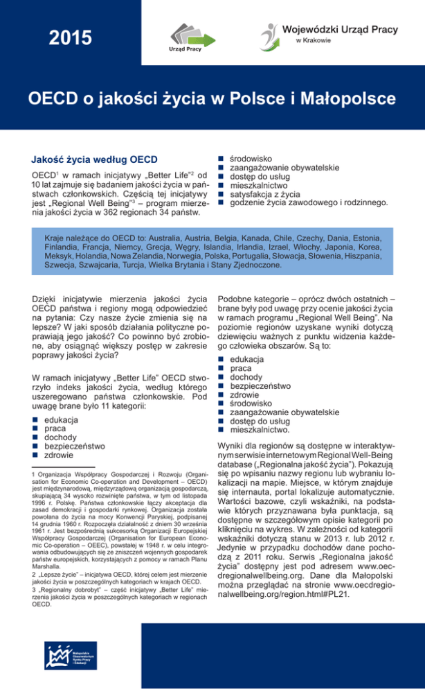 2015 OECD o jakości życia w Polsce i Małopolsce Jakość życia według OECD OECD1 w ramach inicjatywy „Better Life” 2 od 10 lat zajmuje się badaniem jakości życia w pań- stwach członkowskich. Częścią tej inicjatywy jest „Regional Well Being”3 – program mierze- nia jakości życia w 362 regionach 34 państw. środowisko zaangażowanie obywatelskie dostęp do usług mieszkalnictwo satysfakcja z życia godzenie życia zawodowego i rodzinnego. Kraje należące do OECD to: Australia, Austria, Belgia, Kanada, Chile, Czechy, Dania, Estonia, Finlandia, Francja, Niemcy, Grecja, Węgry, Islandia, Irlandia, Izrael, Włochy, Japonia, Korea, Meksyk, Holandia, Nowa Zelandia, Norwegia, Polska, Portugalia, Słowacja, Słowenia, Hiszpania, Szwecja, Szwajcaria, Turcja, Wielka Brytania i Stany Zjednoczone. Dzięki inicjatywie mierzenia jakości życia Podobne kategorie – oprócz dwóch ostatnich – OECD państwa i regiony mogą odpowiedzieć brane były pod uwagę przy ocenie jakości życia na pytania: Czy nasze życie zmienia się na w ramach programu „Regional Well Being”. Na lepsze? W jaki sposób działania polityczne po- poziomie regionów uzyskane wyniki dotyczą prawiają jego jakość? Co powinno być zrobio- dziewięciu ważnych z punktu widzenia każdene, aby osiągnąć większy postęp w zakresie go człowieka obszarów. Są to: poprawy jakości życia? edukacja praca W ramach inicjatywy „Better Life” OECD stwo- dochody rzyło indeks jakości życia, według którego bezpieczeństwo uszeregowano państwa członkowskie. Pod zdrowie środowisko uwagę brane było 11 kategorii: zaangażowanie obywatelskie edukacja dostęp do usług praca mieszkalnictwo. dochody Wyniki dla regionów są dostępne w interaktyw bezpieczeństwo nym serwisie internetowym Regional Well-Being zdrowie database („Regionalna jakość życia”). Pokazują się po wpisaniu nazwy regionu lub wybraniu lo1 Organizacja Współpracy Gospodarczej i Rozwoju (Organisation for Economic Co-operation and Development – OECD) kalizacji na mapie. Miejsce, w którym znajduje jest międzynarodową, międzyrządową organizacją gospodarczą, się internauta, portal lokalizuje automatycznie. skupiającą 34 wysoko rozwinięte państwa, w tym od listopada Wartości bazowe, czyli wskaźniki, na podsta1996 r. Polskę. Państwa członkowskie łączy akceptacja dla zasad demokracji i gospodarki rynkowej. Organizacja została wie których przyznawana była punktacja, są powołana do życia na mocy Konwencji Paryskiej, podpisanej dostępne w szczegółowym opisie kategorii po 14 grudnia 1960 r. Rozpoczęła działalność z dniem 30 września kliknięciu na wykres. W zależności od kategorii 1961 r. Jest bezpośrednią sukcesorką Organizacji Europejskiej Współpracy Gospodarczej (Organisation for European Econowskaźniki dotyczą stanu w 2013 r. lub 2012 r. mic Co-operation – OEEC), powstałej w 1948 r. w celu integroJedynie w przypadku dochodów dane pochowania odbudowujących się ze zniszczeń wojennych gospodarek dzą z 2011 roku. Serwis „Regionalna jakość państw europejskich, korzystających z pomocy w ramach Planu Marshalla. życia” dostępny jest pod adresem www.oec2 „Lepsze życie” – inicjatywa OECD, której celem jest mierzenie dregionalwellbeing.org. Dane dla Małopolski jakości życia w poszczególnych kategoriach w krajach OECD. można przeglądać na stronie www.oecdregio3 „Regionalny dobrobyt” – część inicjatywy „Better Life” mienalwellbeing.org/region.html#PL21. rzenia jakości życia w poszczególnych kategoriach w regionach OECD. 1 Na podstawie przyjętych wskaźników OECD stworzyło rankingi państw i regionów. Kategorie były oceniane w skali od 0 do 10. Każda kategoria otrzymała pewną ilość punktów w zależności od wartości wskaźników. Punktacja powstała na bazie jednego lub kilku wskaźników. Wyższa punktacja wskazuje na lepszą pozycję wobec innych regionów, mniejsza – na gorszą. Dzięki temu powstały rankingi: regionów w dziewięciu i krajów w jedenastu istotnych dla mieszkańców kategoriach. W ten sposób okazało się, że różnice w jakości życia są często większe pomiędzy regionami w tym samym kraju niż między państwami. Wszystkie wskaźniki, na których została oparta wysoko – otrzymała 9,6 punktu. Oznacza to, że punktacja, to oficjalne wskaźniki statystyczne. Polska jest wśród sześciu krajów, które otrzyPrzedstawienie ich na dziesięciostopniowej mały w tej kategorii najwyższe oceny (powyżej skali ułatwia interpretację wyników i porówna- 9 pkt). Do tych krajów należą Czechy (10 pkt), nie regionów. Szybko można zidentyfikować Słowacja (9,9 pkt), Estonia (9,3 pkt), Kanada obszary (regiony), które są w lepszej sytuacji (9 pkt), Izrael (9,0 pkt). Najniższe wyniki w tej oraz te, które wymagają poprawy. Na tej pod- kategorii osiągnęły Turcja, Meksyk i Portugalia stawie mogą być wyciągane wnioski. Jest to (poniżej 1 pkt). więc dobre narzędzie dla prowadzenia polityki Pod względem bezpieczeństwa wynik Polski regionalnej i planowania interwencji w regionie. też jest wysoki (9,5 pkt), choć większość Poniżej przykład Małopolski. państw OECD uzyskała wynik powyżej 9 pkt. Oznacza to, że sytuacja w tym zakresie jest w krajach członkowskich dobra. W dziedzinie dostępu do usług Polska uzyskała 5,9 pkt, co lokuje ją w drugiej połowie stawki krajów. Podobną wartość wskaźnik ten przyjmuje dla Czech, Słowacji, Hiszpanii, Irlandii oraz Węgier W kategorii rynek pracy Polska Aby przybliżyć temat wykorzystania wskaźni- otrzymała 4,6 pkt, ze wskaźnikami zatrudków jakości życia w polityce regionalnej, po- nienia na poziomie 56,9% i bezrobocia 10%, wstał raport pod nazwą „Jak się żyje w Twoim przy znacznie korzystniejszych wartościach regionie?”4. Jego adresatami są głównie wła- tych wskaźników dla OECD: 66,7% – zatruddze regionalne i instytucje mające 