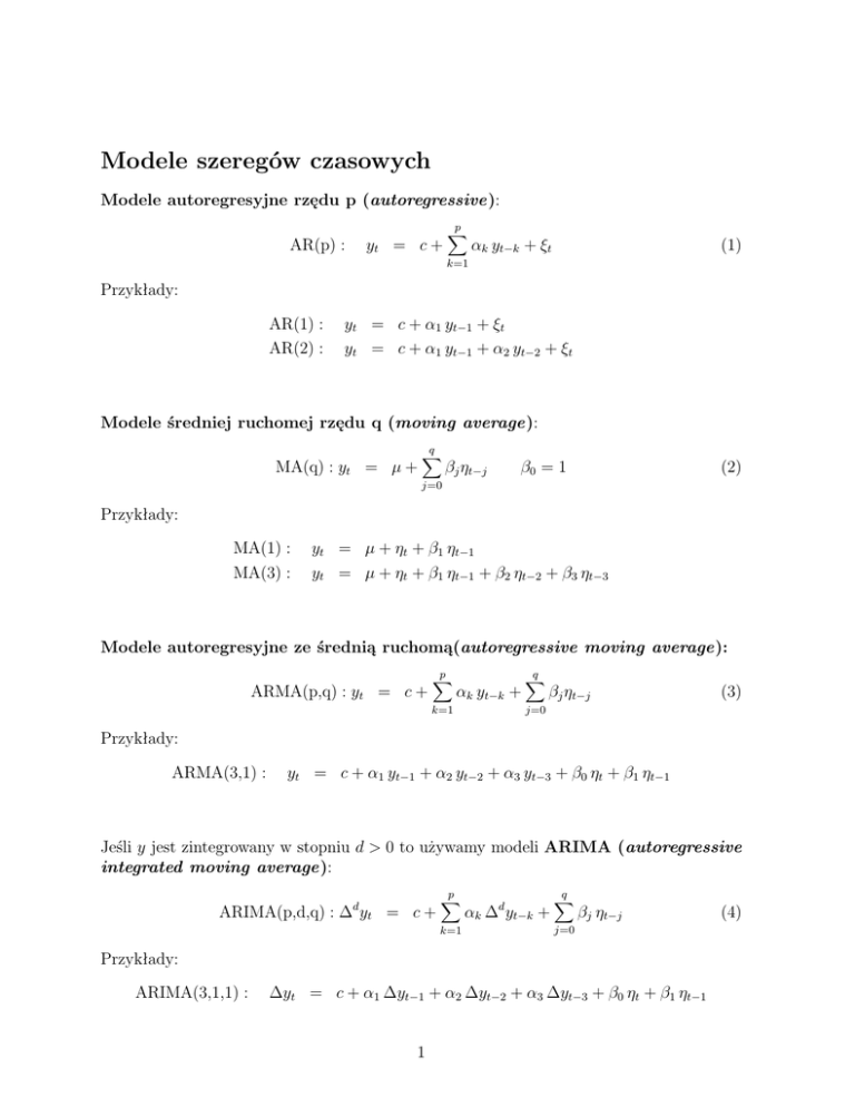 Modele szeregów czasowych Modele autoregresyjne rzędu p (autoregressive): yt = c + AR(p) : p X αk yt−k + ξt (1) k=1 Przykłady: AR(1) : AR(2) : yt = c + α1 yt−1 + ξt yt = c + α1 yt−1 + α2 yt−2 + ξt Modele średniej ruchomej rzędu q (moving average): MA(q) : yt = µ + q X βj ηt−j β0 = 1 (2) j=0 Przykłady: MA(1) : MA(3) : yt = µ + ηt + β1 ηt−1 yt = µ + ηt + β1 ηt−1 + β2 ηt−2 + β3 ηt−3 Modele autoregresyjne ze średnią ruchomą(autoregressive moving average): ARMA(p,q) : yt = c + p X αk yt−k + q X βj ηt−j (3) j=0 k=1 Przykłady: ARMA(3,1) : yt = c + α1 yt−1 + α2 yt−2 + α3 yt−3 + β0 ηt + β1 ηt−1 Jeśli y jest zintegrowany w stopniu d > 0 to używamy modeli ARIMA (autoregressive integrated moving average): d ARIMA(p,d,q) : ∆ yt = c + p X k=1 d αk ∆ yt−k + q X βj ηt−j j=0 Przykłady: ARIMA(3,1,1) : ∆yt = c + α1 ∆yt−1 + α2 ∆yt−2 + α3 ∆yt−3 + β0 ηt + β1 ηt−1 1 (4) Zapis przy pomocy wielomianów opóźnień Operator opóźnień (lag operator ) L: Lyt = yt−1 Lk yt = yt−k ∆d yt = (1 − L)d yt yt = c + α1 yt−1 + α2 yt−2 + . . . αp yt−p + ξt = c + α1 Lyt + α2 L2 yt + . . . αp Lp yt + ξt AR(p) : p X = c+ αk Lk yt + ξt k=1 φ(L) yt = c + ξt 2 gdzie: φ(L) = 1 − α1 L − α2 L − . . . − αp Lp yt = µ + β0 ηt + β1 ηt−1 + β2 ηt−2 + . . . + βq ηt−q = µ + β0 ηt + β1 Lηt + β2 L2 ηt + . . . + βq Lq ηt MA(q) : = µ+ q X βj Lj ηt j=0 = µ + θ(L) ηt 2 gdzie: θ(L) = β0 + β1 L + β2 L + . . . + βq L q yt = c + ARMA(p,q) : p X k αk L yt + q X βj Lj ηt j=0 k=1 φ(L) yt = c + θ(L) ηt ARIMA(p,d,q) : d (1 − L) yt = p X k αk L (1 − L) yt + k=1 d φ(L) (1 − L) yt = c + θ(L) ηt 2 d q X j=0 βj Lj ηt Modele uwzględniające zmienne egzogeniczne Modele ze (skończonym) rozkładem opóźnień (distributed lag ) DL(m) : yt = c + β0 xt + β1 xt−1 + β2 xt−2 + . . . + βm xt−m + εt = c+ m X βj xt−j + εt j=0 Przykłady: DL(0) : DL(4) : y t = c + β x t + εt yt = c + β0 xt + β1 xt−1 + β2 xt−2 + β3 xt−2 + β4 xt−4 + εt β0 - mnożnik bezpośredni (mnożnik krótkookresowy) β̃ = β0 + β1 + . . . + βm - mnożnik długookresowy Model z nieskończonym rozkładem opóźnień - model Koycka (patrz: skrypt) Modele autoregresyjne z rozkładem opóźnień (autoregressive distributed lag ) ADL(p,m) : yt = c + α1 yt−1 + . . . + αp yt−p + β0 xt + β1 xt−1 + . . . + βm xt−m + εt = c+ p X m X αk yt−k + βj xt−j + εt j=0 k=1 Przykłady: ADL(1,0) : ADL(2,2) : yt = c + α1 yt−1 + β xt + εt yt = c + α1 yt−1 + α2 yt−2 + β0 xt + β1 xt−1 + β2 xt−2 + εt β0 - mnożnik krótkookresowy Obliczenie mnożnika długookresowego: ȳ = c + p X αk ȳ + c 1− p X + αk m X β̃ = 1− βj j=0 m X 1− j=0 k=1 βj j=0 m X βj x̄ j=0 m X k=1 ȳ = m X βj j=0 3 x̄ βj Kointegracja Zmienne Xt i Yt są skointegrowane, jeśli Xt ∼ I(d) Yt ∼ I(d) a0 + a1 Xt + a2 Yt ∼ I(d − b) b>0 Przykład: Xt ∼ I(1) Yt ∼ I(1) Zt ∼ I(1) Yt = α0 + α1 Xt + α2 Zt + εt Yt − α0 − α1 Xt − α2 Zt = εt ∼ I(0) lub: Xt ∼ I(1) Yt ∼ I(2) Zt ∼ I(2) Zt − β0 − β1 Yt = ηt ∼ I(1) Xt + α0 + α1 ηt = Xt + α0 + α1 (Zt − β0 − β1 Yt ) ∼ I(0) Model korekty błędem (Error correction model ) przykład dla relacji kointegrującej yt = δ0 + δ1 xt + t : ECM : yt = c + γ et + p X αk yt−k + k=1 m X βj xt−j + εt j=0 et = yt − δ0 − δ1 xt gdzie γ - składnik korekty błędem - określa tempo powrotu zmiennej objaśnianej y do ścieżki równowagi, danej przez relację kointegrującą. Interpretacja γ: jaka część odchylenia zmiennej objaśnianej y od poziomu równowagi wygasa w pierwszym okresie. Jeśli −1 ¬ γ < 0 , to mechanizm korekty błędem działa. Okres połowicznego wygaśnięcia (half-life) odchylenia od poziomu równowagi: hl = ln 0, 5 ln(1 + γ) 4