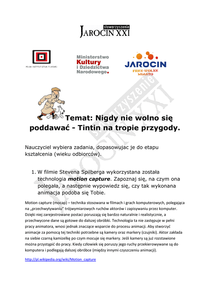 Temat: Nigdy nie wolno się poddawać - Tintin na tropie przygody. Nauczyciel wybiera zadania, dopasowujac je do etapu kształcenia (wieku odbiorców). 1. W filmie Stevena Spilberga wykorzystana została technologia motion capture. Zapoznaj się, na czym ona polegała, a następnie wypowiedz się, czy tak wykonana animacja podoba się Tobie. Motion capture (mocap) – technika stosowana w filmach i grach komputerowych, polegająca na „przechwytywaniu” trójwymiarowych ruchów aktorów i zapisywaniu przez komputer. Dzięki niej zarejestrowane postaci poruszają się bardzo naturalnie i realistycznie, a przechwycone dane są gotowe do dalszej obróbki. Technologia ta nie zastępuje w pełni pracy animatora, wnosi jednak znaczące wsparcie do procesu animacji. Aby stworzyć animacje za pomocą tej techniki potrzebne są kamery oraz markery (czujniki). Aktor zakłada na siebie czarną kamizelkę po czym mocuje się markery. Jeśli kamery są już rozstawione można przystąpić do pracy. Kiedy człowiek się poruszy jego ruchy przekierowywane są do komputera i podlegają dalszej obróbce (między innymi czyszczeniu animacji). http://pl.wikipedia.org/wiki/Motion_capture 2. W filmie występuje retrospekcja. Poniżej masz wyjaśnione, co ten termin oznacza. Zastanów się, w którym momencie filmu jest wykorzystana i czemu służy. retrospekcja 1. książk. przypominanie sobie, odtwarzanie w pamięci dawnych przeżyć 2. książk. odwoływanie się do przeżyć, faktów z przeszłości http://slowniki.gazeta.pl/pl/retrospekcja 3. Sporządź list gończy Sacharyny dla funkcjonariuszy Tajniaka i Jawniaka. Umieść w nim jak najwięcej informacji dotyczących poszukiwanego. 4. Uwaga! Biuro detektywistyczne „Łamigłówka” poszukuje pracowników. Napisz list polecający Tintina, udowadniając, że jak najlepiej nadaje się do tej pracy. 5. „Przygody Tintina” powstały na podstawie komiksu belgijskiego pisarza – artysty Herge, wydrukowanego w ponad 200 milionach egzemplarzy, tłumaczonego na 50 języków. Poniżej masz wypisane tytuły poszczególnych części przygód Tintina. Ułóż tytuły w kolejności alfabetycznej. Odszukaj tytuły innych filmów animowanych, bądź fabularnych, które powstały na podstawie komiksu. „Krab o złotych szczypcach” „Tintin w Ameryce” „Skarb Szkarłatnego Rackhama” „Pęknięte ucho” „TinTin w Kongo” „Cygara faraona” „Tintin w krainie czarnego złota” „Kierunek Księżyc” „Świątynia słońca” „Tajemnica Jednorożca” „Spacer po Księżycu” „Berło Ottokara” „Błękitny Lotos” „Siedem kryształowych kul” „Czarna wyspa” „Tajemnicza gwiazda” „Afera Lakmusa” 6. W filmie występuje otwarte zakończenie, zapowiadające kolejną część przygód reportera Tintina. Zabaw się w scenarzystę, możesz przeczytać też niektóre fragmenty komiksu i spisz pomysły na nowe przygody bohatera. Przygotowała: Justyna Szczepaniak