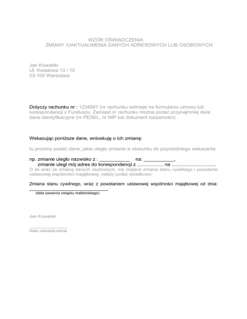 WZÓR OŚWIADCZENIA ZMIANY /UAKTUALNIENIA DANYCH ADRESOWYCH LUB OSOBOWYCH Jan Kowalski Ul. Kwiatowa 13 / 10 03-100 Warszawa Dotyczy rachunku nr : 1234567 (nr rachunku widnieje na formularzu umowy lub korespondencji z Funduszu. Zamiast nr rachunku można podać przynajmniej dwie dane identyfikacyjne (nr PESEL, nr NIP lub dokument tożsamości) Wskazując poniższe dane, wnioskuję o ich zmianę: tu prosimy podać dane, jakie uległy zmianie w stosunku do poprzedniego wskazania: np. zmianie uległo nazwisko z : ___________ na: ___________, zmianie uległ mój adres do korespondencji z ................... na ................................ O ile wraz ze zmianą danych osobowych, ma miejsce zmiana stanu cywilnego i powstanie ustawowej wspólności majątkowej, należy podać dodatkowo: Zmiana stanu cywilnego, wraz z powstaniem ustawowej wspólności majątkowej od dnia: _______________________________ (data zawarcia związku małżeńskiego) Jan Kowalski _______________ data oświadczenia
