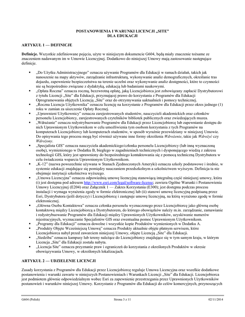 POSTANOWIENIA I WARUNKI LICENCJI „SITE” DLA EDUKACJI ARTYKUŁ 1 — DEFINICJE Definicje. Wszystkie zdefiniowane pojęcia, użyte w niniejszym dokumencie G604, będą miały znaczenie tożsame ze znaczeniem nadawanym im w Umowie Licencyjnej. Dodatkowo do niniejszej Umowy mają zastosowanie następujące definicje. „Do Użytku Administracyjnego” oznacza używanie Programów dla Edukacji w ramach działań, takich jak nanoszenie na mapy aktywów, zarządzanie infrastrukturą, wykonywanie analiz demograficznych, określanie tras dojazdu, zapewnienie bezpieczeństwa na terenie uczelni oraz wykonywanie analiz dostępności, które to czynności nie są bezpośrednio związane z dydaktyką, edukacją lub badaniami naukowymi. „Opłata Roczna” oznacza roczną, bezzwrotną opłatę, jaką Licencjobiorca jest zobowiązany zapłacić Dystrybutorowi z tytułu Licencji „Site” dla Edukacji, przyznającej prawo do korzystania z Programów dla Edukacji Oprogramowania objętych Licencją „Site” oraz do otrzymywania uaktualnień i pomocy technicznej. „Roczna Licencja Użytkownika” oznacza licencję na korzystanie z Programów dla Edukacji przez okres jednego (1) roku w zamian za uiszczenie Opłaty Rocznej. „Uprawnieni Użytkownicy” oznacza zarejestrowanych studentów, nauczycieli akademickich oraz członków personelu Licencjobiorcy, zarejestrowanych czytelników bibliotek publicznych oraz zwiedzających muzea. „Wdrażanie” oznacza redystrybuowanie Programów dla Edukacji przez Licencjobiorcę lub zapewnianie dostępu do nich Uprawnionym Użytkownikom w celu umożliwienia tym osobom korzystania z tych Programów na komputerach Licencjobiorcy lub komputerach studentów, w sposób wyraźnie przewidziany w niniejszej Umowie. Do opisywania tego procesu mogą być również używane inne formy określenia Wdrożenie, takie jak Wdrożyć czy Wdrożony. „Specjalista GIS” oznacza nauczyciela akademickiego/członka personelu Licencjobiorcy (lub inną wyznaczoną osobę), wymienionego w Dodatku B, biegłego w zagadnieniach technicznych i dysponującego wiedzą z zakresu technologii GIS, który jest uprawniony do bezpośredniego kontaktowania się z pomocą techniczną Dystrybutora w celu świadczenia wsparcia Uprawnionym Użytkownikom. „K-12” (nazwa powszechnie używana w Stanach Zjednoczonych Ameryki) oznacza szkoły podstawowe i średnie, w systemie edukacji znajdujące się pomiędzy nauczaniem przedszkolnym a szkolnictwem wyższym. Definicja ta nie obejmuje instytucji szkolnictwa wyższego. „Umowa Licencyjna” oznacza odpowiednią umowę licencyjną stanowiącą integralną część niniejszej umowy, która (i) jest dostępna pod adresem http://www.esri.com/legal/software-license; zawiera Ogólne Warunki i Postanowienia Umowy Licencyjnej (E204) oraz Załącznik 1 — Zakres Korzystania (E300); jest dostępna podczas procesu instalacji i wymaga wyrażenia zgody w formie elektronicznej lub (ii) stanowi umowę licencyjną podpisaną przez Esri, Dystrybutora (jeśli dotyczy) i Licencjobiorcę i zastępuje umowę licencyjną, na którą wyrażono zgodę w formie elektronicznej. „Główna Osoba Kontaktowa” oznacza członka personelu wyznaczonego przez Licencjobiorcę jako główną osobę kontaktową między Licencjobiorcą a Dystrybutorem, do którego obowiązków należy m.in. zarządzanie, zamawianie i redystrybuowanie Programów dla Edukacji między Uprawnionych Użytkowników, uzyskiwanie numerów rejestracyjnych, wyznaczanie Specjalistów GIS oraz ewentualna pomoc Uprawnionym Użytkownikom. „Programy dla Edukacji” oznacza dowolne i wszystkie kopie Produktów wymienionych w Dodatku A. „Produkty Objęte Wcześniejszą Umową” oznacza Produkty aktualnie objęte płatnym serwisem, które Licencjobiorca nabył przed zawarciem niniejszej Umowy, objęte Licencją „Site” dla Edukacji. „Siedziba” oznacza kampusy lub tereny należące do Licencjobiorcy znajdujące się w tym samym kraju, w którym Licencja „Site” dla Edukacji została nabyta. „Licencja Site” oznacza przyznanie praw i ograniczeń do korzystania z określonych Produktów w okresie obowiązywania Umowy, w określonych lokalizacjach. ARTYKUŁ 2 — UDZIELENIE LICENCJI Zasady korzystania z Programów dla Edukacji przez Licencjobiorcę reguluje Umowa Licencyjna oraz wszelkie dodatkowe postanowienia i warunki zawarte w niniejszych Postanowieniach i Warunkach Licencji „Site” dla Edukacji. Licencjobiorca jest podmiotem głównie odpowiedzialnym wobec Esri za zapewnienie przestrzegania przez Uprawnionych Użytkowników postanowień i warunków niniejszej Umowy. Korzystanie z Programów dla Edukacji do celów komercyjnych, przynoszących G604 (Polish) Strona 3 z 11 02/11/2014 zyski lub dla prywatnych korzyści stanowi wyraźne i istotne naruszenie Umowy, a tym samym upoważnia Esri do skorzystania z wszelkich dostępnych form zadośćuczynienia wynikających z przepisów prawa lub zasad słuszności, jak również do uzyskania pełnej zapłaty z tytułu opłat za licencję komercyjną. ARTYKUŁ 3—ZAKRES KORZYSTANIA 3.1 Dodatkowe Dozwolone Sposoby Korzystania. W ramach niniejszej Umowy udzielane są dodatkowo następujące uprawnienia w zakresie Dozwolonych Sposobów Korzystania: a. b. c. d. e. Licencjobiorca może kopiować i Wdrażać na komputerach Licencjobiorcy Programy dla Edukacji w liczbie nieprzekraczającej liczby udzielonych licencji podanej w Tabeli A-1 w Dodatku A dla Licencji „Site” dla Edukacji wyłącznie w celach dydaktycznych i badawczych oraz Do Użytku Administracyjnego. Licencjobiorca może kopiować i Wdrażać Programy w liczbie nieprzekraczającej liczby udzielonych licencji, podanej w Tabeli A-2, wyłącznie do użytku w celach dydaktycznych i badawczych. Licencjobiorca może Wdrożyć Programy dla Edukacji w zwirtualizowanych środowiskach komputerowych. Licencjobiorca może zezwolić swoim nauczycielom akademickim i pracownikom naukowym w okresie ich stałego z