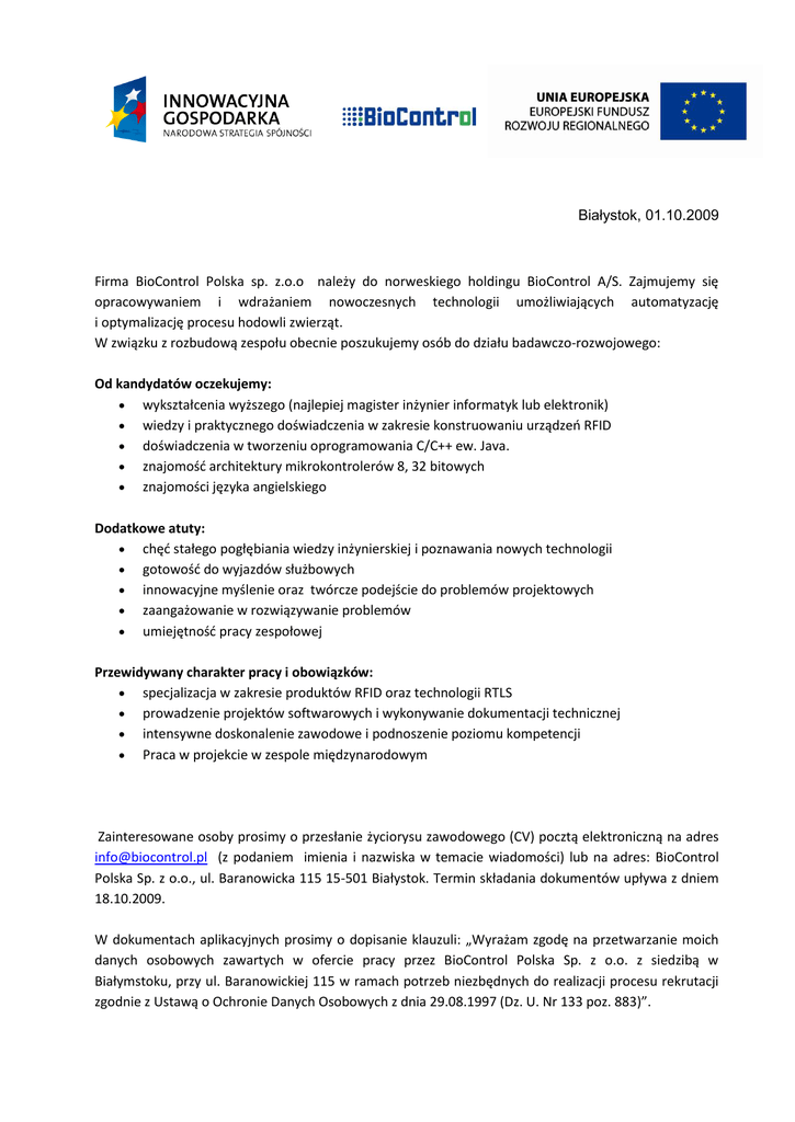 Białystok, 01.10.2009 Firma BioControl Polska sp. z.o.o należy do norweskiego holdingu BioControl A/S. Zajmujemy się opracowywaniem i wdrażaniem nowoczesnych technologii umożliwiających automatyzację i optymalizację procesu hodowli zwierząt. W związku z rozbudową zespołu obecnie poszukujemy osób do działu badawczo-rozwojowego: Od kandydatów oczekujemy: wykształcenia wyższego (najlepiej magister inżynier informatyk lub elektronik) wiedzy i praktycznego doświadczenia w zakresie konstruowaniu urządzeo RFID doświadczenia w tworzeniu oprogramowania C/C++ ew. Java. znajomośd architektury mikrokontrolerów 8, 32 bitowych znajomości języka angielskiego Dodatkowe atuty: chęd stałego pogłębiania wiedzy inżynierskiej i poznawania nowych technologii gotowośd do wyjazdów służbowych innowacyjne myślenie oraz twórcze podejście do problemów projektowych zaangażowanie w rozwiązywanie problemów umiejętnośd pracy zespołowej Przewidywany charakter pracy i obowiązków: specjalizacja w zakresie produktów RFID oraz technologii RTLS prowadzenie projektów softwarowych i wykonywanie dokumentacji technicznej intensywne doskonalenie zawodowe i podnoszenie poziomu kompetencji Praca w projekcie w zespole międzynarodowym Zainteresowane osoby prosimy o przesłanie życiorysu zawodowego (CV) pocztą elektroniczną na adres [email protected] (z podaniem imienia i nazwiska w temacie wiadomości) lub na adres: BioControl Polska Sp. z o.o., ul. Baranowicka 115 15-501 Białystok. Termin składania dokumentów upływa z dniem 18.10.2009. W dokumentach aplikacyjnych prosimy o dopisanie klauzuli: „Wyrażam zgodę na przetwarzanie moich danych osobowych zawartych w ofercie pracy przez BioControl Polska Sp. z o.o. z siedzibą w Białymstoku, przy ul. Baranowickiej 115 w ramach potrzeb niezbędnych do realizacji procesu rekrutacji zgodnie z Ustawą o Ochronie Danych Osobowych z dnia 29.08.1997 (Dz. U. Nr 133 poz. 883)”.