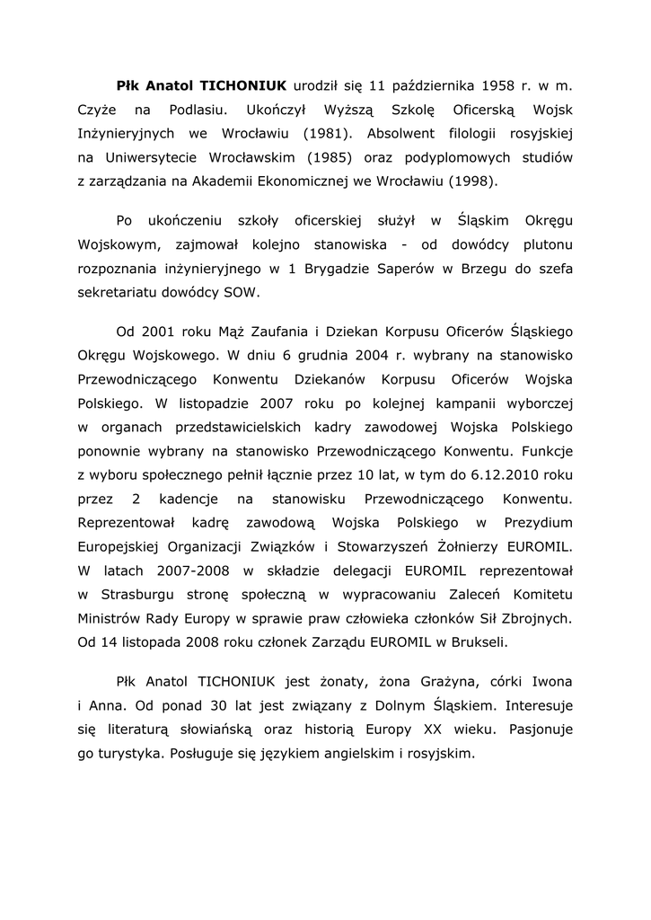 Płk Anatol TICHONIUK urodził się 11 października 1958 r. w m. Czyże na Podlasiu. Inżynieryjnych we Ukończył Wrocławiu Wyższą (1981). Szkolę Absolwent Oficerską filologii Wojsk rosyjskiej na Uniwersytecie Wrocławskim (1985) oraz podyplomowych studiów z zarządzania na Akademii Ekonomicznej we Wrocławiu (1998). Po ukończeniu Wojskowym, szkoły zajmował oficerskiej kolejno służył stanowiska - w Śląskim Okręgu od dowódcy plutonu rozpoznania inżynieryjnego w 1 Brygadzie Saperów w Brzegu do szefa sekretariatu dowódcy SOW. Od 2001 roku Mąż Zaufania i Dziekan Korpusu Oficerów Śląskiego Okręgu Wojskowego. W dniu 6 grudnia 2004 r. wybrany na stanowisko Przewodniczącego Konwentu Dziekanów Korpusu Oficerów Wojska Polskiego. W listopadzie 2007 roku po kolejnej kampanii wyborczej w organach przedstawicielskich kadry zawodowej Wojska Polskiego ponownie wybrany na stanowisko Przewodniczącego Konwentu. Funkcje z wyboru społecznego pełnił łącznie przez 10 lat, w tym do 6.12.2010 roku przez 2 kadencje Reprezentował kadrę na stanowisku zawodową Przewodniczącego Wojska Polskiego w Konwentu. Prezydium Europejskiej Organizacji Związków i Stowarzyszeń Żołnierzy EUROMIL. W latach 2007-2008 w składzie w Strasburgu stronę społeczną w delegacji EUROMIL reprezentował wypracowaniu Zaleceń Komitetu Ministrów Rady Europy w sprawie praw człowieka członków Sił Zbrojnych. Od 14 listopada 2008 roku członek Zarządu EUROMIL w Brukseli. Płk Anatol TICHONIUK jest żonaty, żona Grażyna, córki Iwona i Anna. Od ponad 30 lat jest związany z Dolnym Śląskiem. Interesuje się literaturą słowiańską oraz historią Europy XX wieku. Pasjonuje go turystyka. Posługuje się językiem angielskim i rosyjskim.