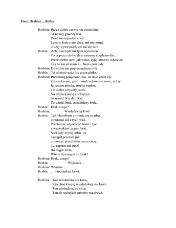 Duet: Hrabina – Hrabia Hrabina: Przez ciebie zaszyć się musiałam na naszej głuchej wsi. Dość mi napsułeś krwi! Lecz w końcu nie chcę, ani nie mogę dłużej wytrzymać, ani mi się śni! Hrabia: Ach, oszczędź mi tych wynurzeń. To ja przez ciebie dziś samotne spędzam dni. Przez ciebie sam, jak palec, żyję, smutny wdowiec. Czy to nie straszne?... Sama powiedz. Hrabina: Do ślubu nas poprowadzono siłą… Hrabia: To właśnie nasz los przesądziło. Hrabina: Przemocą połączono nas, co dało efekt zły. Usposobienie, gust i smak odmienne mam, niż ty. Ja jestem płocha, trochę trzpiot, a z ciebie sztywny mruk. Na dłuższą metę z tobą być – Skaranie! Nie daj Bóg! To wielki brak, zasadniczy brak… Hrabia: Brak czego? Hrabina: Wiedeńskiej krwi! Hrabia: Tak chciałbym zmienić się na plus, otrząsnąć się z tych wad, Przełamać sztywność form i być z wszystkimi za pan brat. Niekiedy myślę sobie, że nastąpił przełom już, otworzyć przed kimś serce chcę… i… raptem ani rusz! Bo ciągle brak, Wiem, że czegoś mi brak! Hrabina: Brak, czego? Hrabia: Wyjaśnię… Hrabina: Właśnie… Hrabia: … wiedeńskiej krwi. Hrabina: Kto wiedeńską ma krew, Kto choć kroplę wiedeńskiej ma krwi, Ten zdobędzie, co chce, Ten do szczęścia otwarte ma drzwi. Razem: Hrabina: Hrabia: Hrabina: Hrabia: Hrabina: Hrabia: Hrabina: Hrabia: Hrabina : Hrabia: Razem: bo wiedeńska w nas krew, Wiednia krew, Wiednia krew, Wiednia krew, To najbardziej dla serc Odpowie… odpowie – Wiednia krew! Choć temperament wpierw miałeś tyci, Starczył gram jeden wiedeńskiej krwi ci. Abyś, odkrywszy w sobie ten gram, Podbił serduszka wiedeńskich dam! To fałsz! Oszczerstwo! To plotek zbiór! Tralalalala, tralalalala… Jak możesz wierzyć w stek takich bzdur!? Tralalalala, tralalalala… Za kobietami latasz, niby chłystek, gonisz za byle dziewczyniną… Ależ… Też mi gach od modystek! Czasem, cóż… czasem krew, wiedeńska krew ponosi mnie, jej ciałek trochę mam. Lecz, żeby ze mnie amant, gach..? Co to, to nie, madame! Nie „nie”, a „tak”! Lecz to niech grzech, to się podoba mi, żeś poczuł wreszcie z żyłach swych wiedeńskiej trochę krwi. Kto wie, czy nie zbudzi się w tobie lew Przez twoją… … przez moją… wiedeńską krew! Kto wiedeńską ma krew, kto choć kroplę wiedeńskiej ma krwi, ten zdobędzie, co chce, ten do szczęścia otwarte ma drzwi. * * *