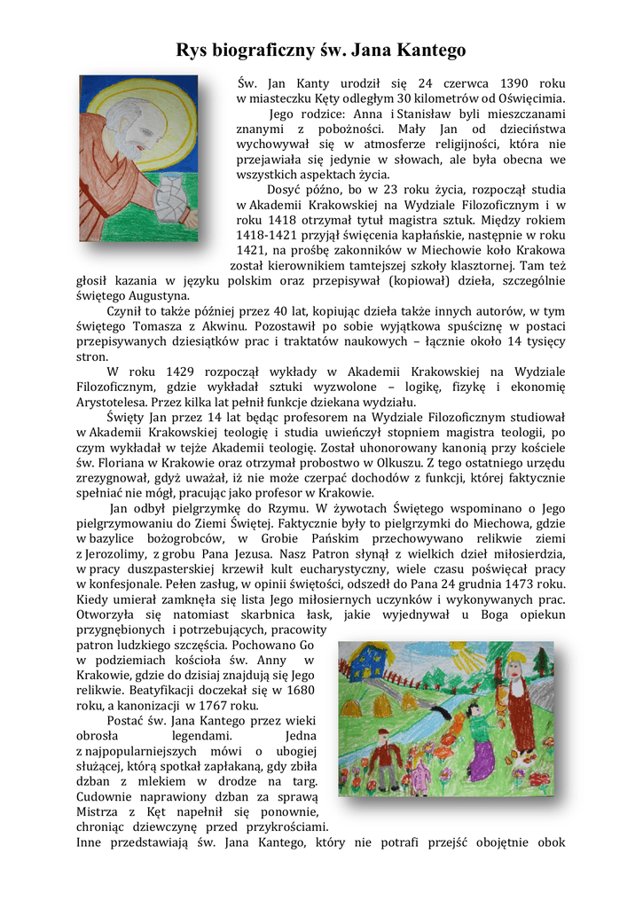 Rys biograficzny św. Jana Kantego Św. Jan Kanty urodził się 24 czerwca 1390 roku w miasteczku Kęty odległym 30 kilometrów od Oświęcimia. Jego rodzice: Anna i Stanisław byli mieszczanami znanymi z pobożności. Mały Jan od dzieciństwa wychowywał się w atmosferze religijności, która nie przejawiała się jedynie w słowach, ale była obecna we wszystkich aspektach życia. Dosyć późno, bo w 23 roku życia, rozpoczął studia w Akademii Krakowskiej na Wydziale Filozoficznym i w roku 1418 otrzymał tytuł magistra sztuk. Między rokiem 1418-1421 przyjął święcenia kapłańskie, następnie w roku 1421, na prośbę zakonników w Miechowie koło Krakowa został kierownikiem tamtejszej szkoły klasztornej. Tam też głosił kazania w języku polskim oraz przepisywał (kopiował) dzieła, szczególnie świętego Augustyna. Czynił to także później przez 40 lat, kopiując dzieła także innych autorów, w tym świętego Tomasza z Akwinu. Pozostawił po sobie wyjątkowa spuściznę w postaci przepisywanych dziesiątków prac i traktatów naukowych – łącznie około 14 tysięcy stron. W roku 1429 rozpoczął wykłady w Akademii Krakowskiej na Wydziale Filozoficznym, gdzie wykładał sztuki wyzwolone – logikę, fizykę i ekonomię Arystotelesa. Przez kilka lat pełnił funkcje dziekana wydziału. Święty Jan przez 14 lat będąc profesorem na Wydziale Filozoficznym studiował w Akademii Krakowskiej teologię i studia uwieńczył stopniem magistra teologii, po czym wykładał w tejże Akademii teologię. Został uhonorowany kanonią przy kościele św. Floriana w Krakowie oraz otrzymał probostwo w Olkuszu. Z tego ostatniego urzędu zrezygnował, gdyż uważał, iż nie może czerpać dochodów z funkcji, której faktycznie spełniać nie mógł, pracując jako profesor w Krakowie. Jan odbył pielgrzymkę do Rzymu. W żywotach Świętego wspominano o Jego pielgrzymowaniu do Ziemi Świętej. Faktycznie były to pielgrzymki do Miechowa, gdzie w bazylice bożogrobców, w Grobie Pańskim przechowywano relikwie ziemi z Jerozolimy, z grobu Pana Jezusa. Nasz Patron słynął z wielkich dzieł miłosierdzia, w pracy duszpasterskiej krzewił kult eucharystyczny, wiele czasu poświęcał pracy w konfesjonale. Pełen zasług, w opinii świętości, odszedł do Pana 24 grudnia 1473 roku. Kiedy umierał zamknęła się lista Jego miłosiernych uczynków i wykonywanych prac. Otworzyła się natomiast skarbnica łask, jakie wyjednywał u Boga opiekun przygnębionych i potrzebujących, pracowity patron ludzkiego szczęścia. Pochowano Go w podziemiach kościoła św. Anny w Krakowie, gdzie do dzisiaj znajdują się Jego relikwie. Beatyfikacji doczekał się w 1680 roku, a kanonizacji w 1767 roku. Postać św. Jana Kantego przez wieki obrosła legendami. Jedna z najpopularniejszych mówi o ubogiej służącej, którą spotkał zapłakaną, gdy zbiła dzban z mlekiem w drodze na targ. Cudownie naprawiony dzban za sprawą Mistrza z Kęt napełnił się ponownie, chroniąc dziewczynę przed przykrościami. Inne przedstawiają św. Jana Kantego, który nie potrafi przejść obojętnie obok marznącego na ulicy biedaka i przyodziewa go własnym płaszczem, oddaje jedyne buty. W zapisanym przez ks. Piotra Skargę żywocie Kanty pojawia się jako pielgrzym napadnięty przez rabusiów. Tak zdumiał swoją uczciwością złodziei, że oddali mu ze skruchą zabrane wcześniej pieniądze… Cechami charakteru jakie posiadał Jan Kanty może „przyodziać się” każdy człowiek, w każdym czasie, gdyż są one uniwersalne i ponadczasowe, szczególnie zaś nauczyciel i uczeń. Nauczyciel dlatego, że powinien on być autorytetem dla ucznia, takim jakim dla swoich podopiecznych święty Jan z Kęt; uczeń zaś dlatego, że wzorując się na mistrzu z Kęt, można dojść do wyżyn mądrości drogą pracowitości i uczciwości. Sw. Jan Kanty jest więc wzorem do naśladowania dla wszystkich, którzy w swoim życiu cenią sobie mądrość, miłosierdzie, pracowitość, uczciwość…