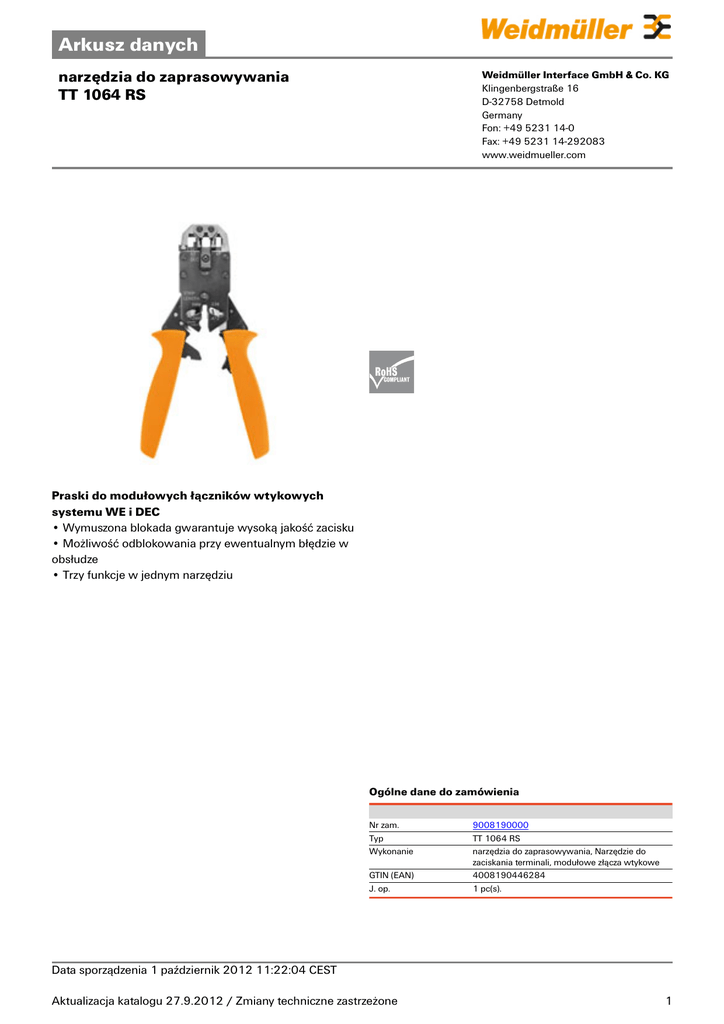 Arkusz danych narzędzia do zaprasowywania TT 1064 RS Weidmüller Interface GmbH & Co. KG Klingenbergstraße 16 D-32758 Detmold Germany Fon: +49 5231 14-0 Fax: +49 5231 14-292083 www.weidmueller.com Praski do modułowych łączników wtykowych systemu WE i DEC • Wymuszona blokada gwarantuje wysoką jakość zacisku • Możliwość odblokowania przy ewentualnym błędzie w obsłudze • Trzy funkcje w jednym narzędziu Ogólne dane do zamówienia Nr zam. Typ Wykonanie GTIN (EAN) J. op. 9008190000 TT 1064 RS narzędzia do zaprasowywania, Narzędzie do zaciskania terminali, modułowe złącza wtykowe 4008190446284 1 pc(s). Data sporządzenia 1 październik 2012 11:22:04 CEST Aktualizacja katalogu 27.9.2012 / Zmiany techniczne zastrzeżone 1 Arkusz danych narzędzia do zaprasowywania TT 1064 RS Weidmüller Interface GmbH & Co. KG Klingenbergstraße 16 D-32758 Detmold Germany Fon: +49 5231 14-0 Fax: +49 5231 14-292083 www.weidmueller.com Dane techniczne Wymiary Długość Waga netto 205 mm 480,08 g Ciężar mechaniczny, bez wymienialnych wkładów modułowe złącza wtykowe 531 g Dane techniczne Wykonanie Opis styku rodzaj styku Klasyfikacje ETIM 2.0 UNSPSC eClass 5.1 eClass 7.0 EC000168 23-17-16-04 21-04-03-01 21-04-38-90 ETIM 3.0 eClass 4.1 eClass 6.0 EC000168 21-04-03-01 21-04-38-90 Wskazówki do produktów Opis artykułu Opis produktu narzędzie do zaciskania do łącznika wtykowego WE/DEC 4, 6 + 10 biegunowego Do sięgających 10-pinów płaskich lub owalnych przewodów do przesyłu danych AWG 28...24 • Osadzanie: 4-pinowych wtyków WE 6-pinowych (RJ12) wtyków WE 6-pinowych wtyków WE (DEC) 10-pinowych (RJ45) wtyków WE • potrójne zagniecenie przy RJ 45 • Do wtyków AMP lub o jednakowej konstrukcji • Inne wykonania na zamówienie certyfikaty Dopuszczenia Data sporządzenia 1 październik 2012 11:22:04 CEST Aktualizacja katalogu 27.9.2012 / Zmiany techniczne zastrzeżone 2 Arkusz danych narzędzia do zaprasowywania TT 1064 RS Rysunki Weidmüller Interface GmbH & Co. KG Klingenbergstraße 16 D-32758 Detmold Germany Fon: +49 5231 14-0 Fax: +49 5231 14-292083 www.weidmueller.com Data sporządzenia 1 październik 2012 11:22:04 CEST Aktualizacja katalogu 27.9.2012 / Zmiany techniczne zastrzeżone 3
