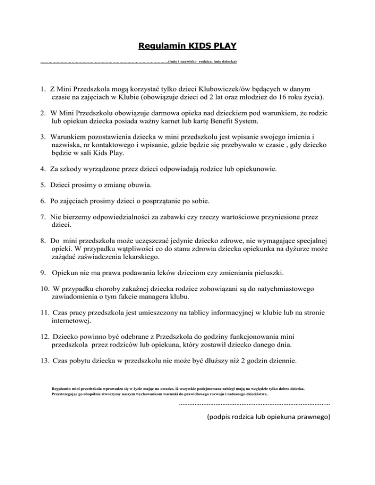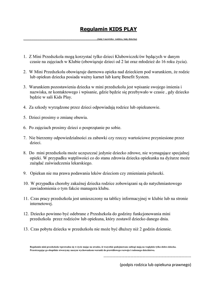 Regulamin KIDS PLAY ………………………………………………………………………………….(imię i nazwisko rodzica, imię dziecka) 1. Z Mini Przedszkola mogą korzystać tylko dzieci Klubowiczek/ów będących w danym czasie na zajęciach w Klubie (obowiązuje dzieci od 2 lat oraz młodzież do 16 roku życia). 2. W Mini Przedszkolu obowiązuje darmowa opieka nad dzieckiem pod warunkiem, że rodzic lub opiekun dziecka posiada ważny karnet lub kartę Benefit System. 3. Warunkiem pozostawienia dziecka w mini przedszkolu jest wpisanie swojego imienia i nazwiska, nr kontaktowego i wpisanie, gdzie będzie się przebywało w czasie , gdy dziecko będzie w sali Kids Play. 4. Za szkody wyrządzone przez dzieci odpowiadają rodzice lub opiekunowie. 5. Dzieci prosimy o zmianę obuwia. 6. Po zajęciach prosimy dzieci o posprzątanie po sobie. 7. Nie bierzemy odpowiedzialności za zabawki czy rzeczy wartościowe przyniesione przez dzieci. 8. Do mini przedszkola może uczęszczać jedynie dziecko zdrowe, nie wymagające specjalnej opieki. W przypadku wątpliwości co do stanu zdrowia dziecka opiekunka na dyżurze może zażądać zaświadczenia lekarskiego. 9. Opiekun nie ma prawa podawania leków dzieciom czy zmieniania pieluszki. 10. W przypadku choroby zakaźnej dziecka rodzice zobowiązani są do natychmiastowego zawiadomienia o tym fakcie managera klubu. 11. Czas pracy przedszkola jest umieszczony na tablicy informacyjnej w klubie lub na stronie internetowej. 12. Dziecko powinno być odebrane z Przedszkola do godziny funkcjonowania mini przedszkola przez rodziców lub opiekuna, który zostawił dziecko danego dnia. 13. Czas pobytu dziecka w przedszkolu nie może być dłuższy niż 2 godzin dziennie. Regulamin mini przedszkola wprowadza się w życie mając na uwadze, iż wszystkie podejmowane zabiegi mają na względzie tylko dobro dziecka. Przestrzegając go obopólnie stworzymy naszym wychowankom warunki do prawidłowego rozwoju i radosnego dzieciństwa. …………………………………………………………………………… (podpis rodzica lub opiekuna prawnego)