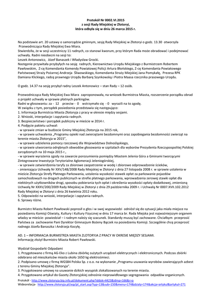 Protokół Nr 0002.VI.2015 z sesji Rady Miejskiej w Złotoryi, która odbyła się w dniu 26 marca 2015 r. Na podstawie art. 20 ustawy o samorządzie gminnym, sesję Rady Miejskiej w Złotoryi o godz. 13.30 otworzyła Przewodnicząca Rady Miejskiej Ewa Miara. Stwierdziła, że w sesji uczestniczy 11 radnych, co stanowi kworum, przy którym Rada może obradować i podejmować uchwały. Radni nieobecni na sesji to: Leszek Antonowicz, Józef Banaszek i Władysław Grocki. Następnie przywitała przybyłych na sesję radnych, Kierownictwo Urzędu Miejskiego z Burmistrzem Robertem Pawłowskim, Z-cę Komendanta Komendy Powiatowej Policji Artura Błońskiego, Z-cę Komendanta Powiatowego Państwowej Straży Pożarnej Andrzeja Śliwowskiego, Komendanta Straży Miejskiej Jana Pomykałę, Prezesa RPK Damiana Klickiego, radcę prawnego Urzędu Barbarę Szynkowską i Piotra Maasa rzecznika prasowego Urzędu. O godz. 14.37 na sesję przybył radny Leszek Antonowicz – stan Rady – 12 osób. Przewodnicząca Rady Miejskiej Ewa Miara zaproponowała, na wniosek Burmistrza Miasta, rozszerzenie porządku obrad o projekt uchwały w sprawie płatnych parkingów. Radni w głosowaniu: za - 12 przeciw - 0 wstrzymało się - 0 wyrazili na to zgodę. W związku z tym, porządek posiedzenia przedstawia się następująco: 1. Informacja Burmistrza Miasta Złotoryja z pracy w okresie między sesjami. 2. Wnioski, interpelacje i zapytania radnych. 3. Bezpieczeństwo i porządek publiczny w mieście w 2014 r. 4. Podjęcie pakietu uchwał: - w sprawie zmian w budżecie Gminy Miejskiej Złotoryja na 2015 rok, - w sprawie uchwalenia „Programu opieki nad zwierzętami bezdomnymi oraz zapobiegania bezdomności zwierząt na terenie miasta Złotoryja w 2015”, - w sprawie udzielenia pomocy rzeczowej dla Województwa Dolnośląskiego, - w sprawie utworzenia odrębnych obwodów głosowania w szpitalach dla wyborów Prezydenta Rzeczypospolitej Polskiej zarządzonych na 10 maja 2015 r., - w sprawie wyrażenia zgody na zawarcie porozumienia pomiędzy Miastem Jelenia Góra a Gminami tworzącymi Zintegrowane Inwestycje Terytorialne Aglomeracji Jeleniogórskiej, - w sprawie zatwierdzenia taryfy za zbiorowe zaopatrzenie w wodę i zbiorowe odprowadzenie ścieków, - zmieniająca Uchwałę Nr XXV/148/2008 Rady Miejskiej w Złotoryi z dnia 27 listopada 2008 r. w sprawie ustalenia w mieście Złotoryja Strefy Płatnego Parkowania, ustalenia wysokości stawek opłat za parkowanie pojazdów samochodowych na drogach publicznych w strefie płatnego parkowania, wprowadzenia zerowej stawki opłat dla niektórych użytkowników drogi, sposobu pobierania tych opłat i określenia wysokości opłaty dodatkowej, zmienioną Uchwałą Nr XXXV/200/2009 Rady Miejskiej w Złotoryi z dnia 29 października 2009 r. i Uchwałą Nr 0007.XVII.102.2012 Rady Miejskiej w Złotoryi z dnia 26 kwietnia 2012 roku. 5. Odpowiedzi na wnioski, interpelacje i zapytania radnych. 6. Sprawy różne. Burmistrz Miasta Robert Pawłowski poprosił o głos i w swej wypowiedzi odniósł się do sytuacji jaka miała miejsce na posiedzeniu Komisji Oświaty, Kultury i Kultury Fizycznej w dniu 17 marca br. Rada Miejska jest najważniejszym organem władzy w mieście- powiedział – i radnym należy się szacunek. Standardy muszą być zachowane. Chciałbym przeprosić Państwa za zachowanie Pani Dyrektor Gimnazjum Bożeny Bączek na posiedzeniu Komisji. Szczególnie chcę przeprosić radnego Józefa Banaszka i Andrzeja Kocyłę. AD. 1 – INFORMACJA BURMISTRZA MIASTA ZLOTORYJA Z PRACY W OKRESIE MIĘDZY SESJAMI. Informację złożył Burmistrz Miasta Robert Pawłowski. Wydział Gospodarki Odpadami 1. Przygotowano z firmą AG-Eko z Lubina zbiórkę zużytych urządzeń elektrycznych i elektronicznych. Podczas zbiórki odebrano od mieszkańców miasta około 1650 kg elektrośmieci. 2. Podpisano umowę z firmą WGS84 Polska Sp. z o.o. na wykonanie „Programu usuwania wyrobów zawierających azbest z terenu Gminy Miejskiej Złotoryja”. 3. Przygotowano umowę na usuwanie dzikich wysypisk zlokalizowanych na terenie miasta. 4. Przygotowano artykuł do Gazety Złotoryjskiej odnośnie nieprawidłowego segregowania odpadów organicznych. Protokół - http://www.zlotoryja.bip.info.pl/dokument.php?iddok=4423&idmp=166&r=o Wideorelacja- http://www.złotoryja.pl/asp/pl_start.asp?typ=13&sub=150&menu=174&dzialy=174&akcja=artykul&artykul=271 Wydział Mienia 1. Trwa procedura wyłaniania wykonawcy na remonty cząstkowe dróg oraz na malowanie oznakowania poziomego dróg. 2. Zaproszono RPK Sp. z o.o. w Złotoryi do złożenia oferty na konserwację oświetlenia. 3. Odzyskano 2 lokale komunalne do nowego przydziału. 4. Zgłoszono nasze miasto do konkursu „Podwórko Nivea”, na wybudowanie placu zabaw. 5. Rozpoczęto pozimowe prace naprawcze elementów małej architektury (wymieniane są zniszczone elementy urządzeń, malowane kosze uliczne) oraz prace konserwacyjne urządzeń kanalizacji deszczowej. 6. Na ukończeniu są zaplanowane na ten okres prace związane z pielęgnacją drzew i krzewów. 7. Rozpoczęto zintensyfikowane prace porządkowe na terenach komunalnych. 8. Dzięki pozyskaniu z Powiatowego Urzędu Pracy pracownikom interwencyjnym, rozpoczęto prace interwencyjne. W tej chwili naprawiane są punktowe ubytki w chodnikach oraz oznakowanie pionowe. 9. Trwają prace remontowe klatki schodowej w budynku przy ul.Basztowej nr 15. 10. Skierowano do Sądu Rejonowego w Złotoryi 3 pozwy w związku z zaległościami czynszowymi. 11. Skierowano do Sądu Rejonowego w Złotoryi 4 pozwy o eksmisje. 12.Zlecono wykonanie dokumentacji technicznej na remonty pustostanów: przy ul. Basztowej nr 32/6-8, Garbarskiej 2/5, Legnickiej 4/5. Wydział Architektury, Geodezji i Rozwoju Miasta Ogłoszono przetargi na sprzedaż lokali użytkowych przy ul. Szkolnej 8c/1 i 8c/2 (przetargi odbędą się 15 kwietnia) i lokalu mieszkalnego przy ul. Rynek 41/1 (2 przetarg odbędzie się 22 kwietnia, w tym przypadku o