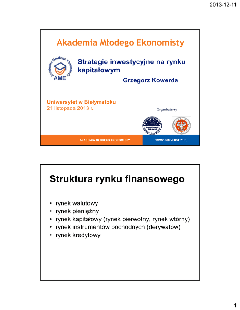 2013-12-11 Akademia Młodego Ekonomisty Strategie inwestycyjne na rynku kapitałowym Grzegorz Kowerda Uniwersytet w Białymstoku 21 listopada 2013 r. Struktura rynku finansowego • • • • • rynek walutowy rynek pieniężny rynek kapitałowy (rynek pierwotny, rynek wtórny) rynek instrumentów pochodnych (derywatów) rynek kredytowy 1 2013-12-11 Składowe rynku kapitałowego • rynek papierów wartościowych (dłużnych i udziałowych), • rynek skryptów dłużnych, długoterminowych pożyczek międzybankowych, • rynek transakcji terminowych, • rynek hipoteczny. Rynek publiczny i niepubliczny • Rynek papierów wartościowych dzielony jest na rynek publiczny i rynek niepubliczny. W ich ramach wyróżnić możemy rynki pierwotny i wtórny, a w ramach publicznego rynku wtórnego – rynek giełdowy i pozagiełdowy. 2 2013-12-11 Od czego zacząć? • Analiza fundamentalna • Analiza techniczna • Analiza portfelowa Analiza fundamentalna składa się z: • • • • • analizy makrootoczenia, analizy sektorowej , analizy sytuacyjnej spółki, analizy finansowej spółki, wyceny spółki. • • • • • • Do zebrania informacji wykorzystuje się: prospekt emisyjny; okresowe i roczne raporty; analizy rynkowe; informacje ekonomiczne z otoczenia spółki. spotkania z zarządami spółek. • Stosuje się także takie czynniki jak pesymizm lub optymizm. 3 2013-12-11 Analiza fundamentalna • Podstawowym narzędziem tej analizy jest analiza wskaźnikowa. • Analizę fundamentalną powinno się rozpoczynać od zbadania wartości takich wskaźników jak: C/Z, C/WK, C/S, C/EBIT, EPS, DYR. • Wartości tych wskaźników są codzienne ujawnione w publikacjach poświęconych zagadnieniom giełdowym. Znajdują się tam także aktualne notowania poszczególnych walorów i informacje dotyczące działalności spółek, które są ich emitentami. Analiza techniczna Opiera się na trzech podstawowych przesłankach: • Rynek dyskontuje wszystko • Ceny podlegają trendom • Historia „lubi się” powtarzać. 4 2013-12-11 Rynek dyskontuje wszystko Wszelkie czynniki, które mają wpływ na cenę są już w niej uwzględnione ponieważ zachowania cen odzwierciedlają zmiany w relacjach popytu i podaży. Nie trzeba badać czynników wpływających na cenę instrumentu lub dociekać przyczyn spadków lub wzrostów. Rynek wie wszystko i to on kształtuje cenę, dlatego też należy badać wykresy i wskaźniki analizy technicznej, aby skutecznie prognozować, w którą stronę rynek podąży. Nie oznacza to, iż analitycy techniczni odrzucają twierdzenia, iż przyczyną trendów na giełdzie są uwarunkowania gospodarcze. Uważają jedynie, że rynek łatwiej można zrozumieć i przewidzieć, analizując zapis jego zachowań, czyli wykresy. Historia „lubi się” powtarzać Analityk techniczny stara się w wykresach cen odnaleźć trend, czyli kierunek, w którym podążają ceny. Rozpoznanie trendu w jego wczesnej fazie pozwala dokonać transakcji, która powinna przynieść zyski (kupić, gdy tworzy się trend rosnący, sprzedać, gdy malejący). Analitycy zakładają bowiem, że istnieje większe prawdopodobieństwo tego, że trend będzie kontynuowany, niż że nastąpi jego odwrócenie. 5 2013-12-11 Linie trendu Rynki kapitałowe z wyprzedzeniem dyskontują swoją przyszłość. Według zwolenników analizy technicznej ceny akcji są ustalane na podstawie relacji między kupującymi a sprzedającymi, między popytem a podażą (bykami a niedźwiedziami). W dłuższym okresie kursy walorów są podporządkowane trendom oraz związanymi z nimi prawidłowościami. Linie trendu są klasyczną metodą analizy technicznej. Identyfikują one trend i dają sygnały do wejścia na giełdę lub wyjścia z niej. Na rynku papierów wartościowych występują trzy rodzaje trendów: - wzrostowe - gdy ceny akcji kształtują się na coraz wyższym poziomie, - spadkowe - gdy ceny akcji kształtują się na coraz niższym poziomie, - formacje horyzontalne - gdzie większa część zwyżek i zniżek kształtuje się na zbliżonym pułapie cenowym. Formacja horyzontalna jest oznaką stabilizacji rynku, jak również może oznaczać fazę przejściową pomiędzy trendem wzrostowym a spadkowym lub odwrotnie. Trend spadkowy 6 2013-12-11 Trend - formacja horyzontalna Analiza trendu 7 2013-12-11 Formacje cenowe Informują o pewnych powtarzających się schematach, które zachodzą na rynku akcji i które można odnieść do przyszłych wydarzeń. Formacje cenowe można podzielić na trzy zasadnicze rodzaje : - formacje zapowiadające odwrócenie się trendu, - formacje sygnalizujące kontynuację trendu, - formacje uniwersalne, czyli takie które spełniają oba warunki. Rodzaje formacji w analizie technicznej • • • • • • • • • • Formacja trójkąta Formacja czworokąta Formacja diamentu Formacja spodka Formacja V Formacja klina Formacja głowy i ramion Formacja podwójnego powrotu Formacja flagi i chorągiewki Formacja Gartleya 8 2013-12-11 Głowa i ramiona Formacja czworokąta 9 2013-12-11 Formacja trójkąta Formacja flagi 10 2013-12-11 Warto pamiętać Analiza fundamentalna powinna udzielić odpowiedzi w jakie akcje inwestować, natomiast analiza techniczna, kiedy dokonać inwestycji. Analiza portfelowa Analiza portfelowa jest bardzo istotnym, o ile nie najważniejszym, elementem strategii inwestycyjnej. Dzięki powyższej analizie możemy wyeliminować znaczną część ryzyka towarzyszącego akcjom. Analiza portfelowa pozwala badać zależności pomiędzy maksymalizacją stopy zwrotu przy określonym poziomie ryzyka lub przy danym poziomie stopy zwrotu, minimalizacją ryzyka. 11 2013-12-11 Giełda Papierów Wartościowych w Warszawie • • • • • GPW jest instytucją publiczną mającą na celu zapewnienie możliwości obrotu papierami wartościowymi (takimi jak akcje, obligacje, prawa poboru itp.) oraz niebędącymi papierami wartościowymi instrumentami finansow