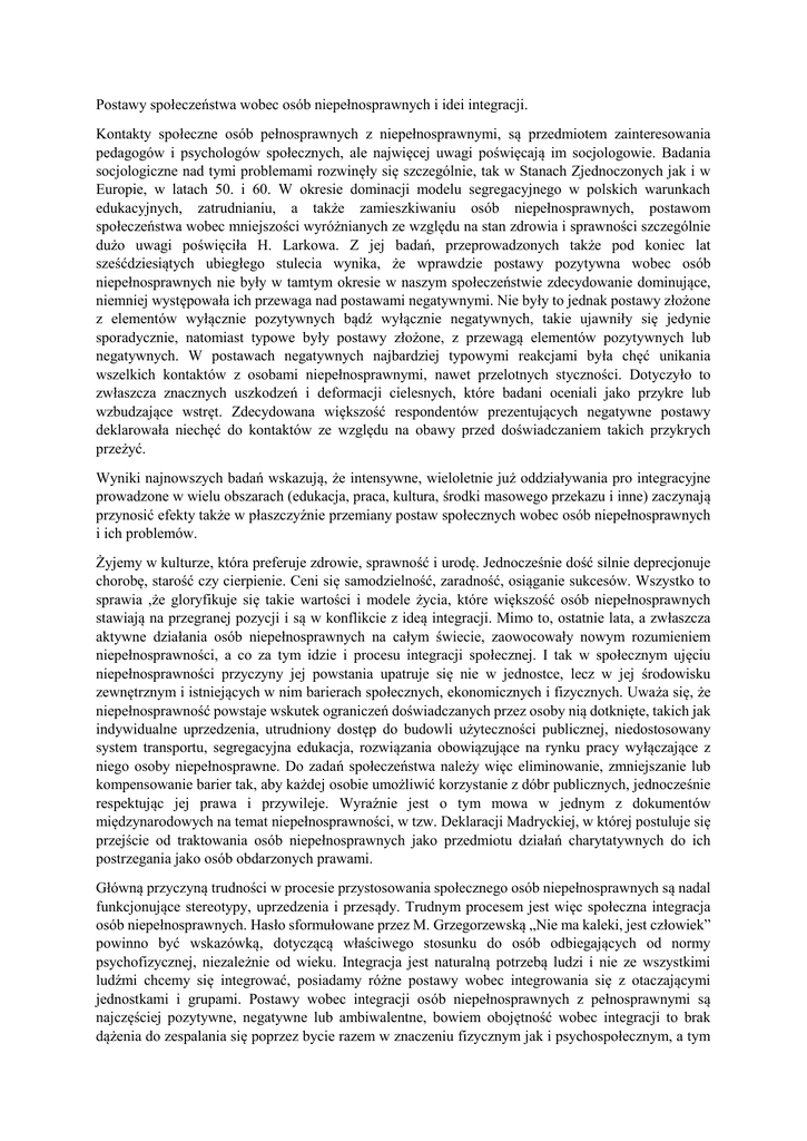 Postawy społeczeństwa wobec osób niepełnosprawnych i idei integracji. Kontakty społeczne osób pełnosprawnych z niepełnosprawnymi, są przedmiotem zainteresowania pedagogów i psychologów społecznych, ale najwięcej uwagi poświęcają im socjologowie. Badania socjologiczne nad tymi problemami rozwinęły się szczególnie, tak w Stanach Zjednoczonych jak i w Europie, w latach 50. i 60. W okresie dominacji modelu segregacyjnego w polskich warunkach edukacyjnych, zatrudnianiu, a także zamieszkiwaniu osób niepełnosprawnych, postawom społeczeństwa wobec mniejszości wyróżnianych ze względu na stan zdrowia i sprawności szczególnie dużo uwagi poświęciła H. Larkowa. Z jej badań, przeprowadzonych także pod koniec lat sześćdziesiątych ubiegłego stulecia wynika, że wprawdzie postawy pozytywna wobec osób niepełnosprawnych nie były w tamtym okresie w naszym społeczeństwie zdecydowanie dominujące, niemniej występowała ich przewaga nad postawami negatywnymi. Nie były to jednak postawy złożone z elementów wyłącznie pozytywnych bądź wyłącznie negatywnych, takie ujawniły się jedynie sporadycznie, natomiast typowe były postawy złożone, z przewagą elementów pozytywnych lub negatywnych. W postawach negatywnych najbardziej typowymi reakcjami była chęć unikania wszelkich kontaktów z osobami niepełnosprawnymi, nawet przelotnych styczności. Dotyczyło to zwłaszcza znacznych uszkodzeń i deformacji cielesnych, które badani oceniali jako przykre lub wzbudzające wstręt. Zdecydowana większość respondentów prezentujących negatywne postawy deklarowała niechęć do kontaktów ze względu na obawy przed doświadczaniem takich przykrych przeżyć. Wyniki najnowszych badań wskazują, że intensywne, wieloletnie już oddziaływania pro integracyjne prowadzone w wielu obszarach (edukacja, praca, kultura, środki masowego przekazu i inne) zaczynają przynosić efekty także w płaszczyźnie przemiany postaw społecznych wobec osób niepełnosprawnych i ich problemów. Żyjemy w kulturze, która preferuje zdrowie, sprawność i urodę. Jednocześnie dość silnie deprecjonuje chorobę, starość czy cierpienie. Ceni się samodzielność, zaradność, osiąganie sukcesów. Wszystko to sprawia ,że gloryfikuje się takie wartości i modele życia, które większość osób niepełnosprawnych stawiają na przegranej pozycji i są w konflikcie z ideą integracji. Mimo to, ostatnie lata, a zwłaszcza aktywne działania osób niepełnosprawnych na całym świecie, zaowocowały nowym rozumieniem niepełnosprawności, a co za tym idzie i procesu integracji społecznej. I tak w społecznym ujęciu niepełnosprawności przyczyny jej powstania upatruje się nie w jednostce, lecz w jej środowisku zewnętrznym i istniejących w nim barierach społecznych, ekonomicznych i fizycznych. Uważa się, że niepełnosprawność powstaje wskutek ograniczeń doświadczanych przez osoby nią dotknięte, takich jak indywidualne uprzedzenia, utrudniony dostęp do budowli użyteczności publicznej, niedostosowany system transportu, segregacyjna edukacja, rozwiązania obowiązujące na rynku pracy wyłączające z niego osoby niepełnosprawne. Do zadań społeczeństwa należy więc eliminowanie, zmniejszanie lub kompensowanie barier tak, aby każdej osobie umożliwić korzystanie z dóbr publicznych, jednocześnie respektując jej prawa i przywileje. Wyraźnie jest o tym mowa w jednym z dokumentów międzynarodowych na temat niepełnosprawności, w tzw. Deklaracji Madryckiej, w której postuluje się przejście od traktowania osób niepełnosprawnych jako przedmiotu działań charytatywnych do ich postrzegania jako osób obdarzonych prawami. Główną przyczyną trudności w procesie przystosowania społecznego osób niepełnosprawnych są nadal funkcjonujące stereotypy, uprzedzenia i przesądy. Trudnym procesem jest więc społeczna integracja osób niepełnosprawnych. Hasło sformułowane przez M. Grzegorzewską „Nie ma kaleki, jest człowiek” powinno być wskazówką, dotyczącą właściwego stosunku do osób odbiegających od normy psychofizycznej, niezależnie od wieku. Integracja jest naturalną potrzebą ludzi i nie ze wszystkimi ludźmi chcemy się integrować, posiadamy różne postawy wobec integrowania się z otaczającymi jednostkami i grupami. Postawy wobec integracji osób niepełnosprawnych z pełnosprawnymi są najczęściej pozytywne, negatywne lub ambiwalentne, bowiem obojętność wobec integracji to brak dążenia do zespalania się poprzez bycie razem w znaczeniu fizycznym jak i psychospołecznym, a tym samym wyrażanie nastawień segregacyjnych, chociaż może ona także oznaczać niedostrzeżenie potrzeb integracyjnych innych osób. Jak twierdzi dalej M. Chodkowska postawy pro- lub antyintegracyjne mają charakter globalny i wyrażają się przekonaniem, że wszystkie osoby niepełnosprawne, na miarę swoich potrzeb i możliwości powinny mieć lub nie mieć możliwości współbycia i współdziałania we wszystkich płaszczyznach społecznego funkcjonowania. Z kolei postawy cząstkowe będą miały wiele różnych odmian, mogą się różnicować w zależności od tego, do jakich kategorii osób niepełnosprawnych się odnoszą oraz w jakich płaszczyznach te potencjalne kontakty miałyby się odbywać. I tak na przykład można mieć postawę pozytywną wobec integracji osób niewidomych a negatywną wobec integracji osób upośledzonych umysłowo. Można mieć postawę pozytywną wobec integracji osób obciążonych niepełnosprawnością w płaszczyźnie edukacyjnej, ale negatywną wobec ich integracji w płaszczyźnie życia małżeńsko- rodzinnego. Suma tych cząstkowych postaw, często wzajemnie sprzecznych, utworzy globalną postawę ambiwalencji. Postawy wobec problemów niepełnosprawności , pomimo przedstawionej złożoności tych kwestii dadzą się sprowadzić do jednego wymiaru. Postaw wobec osoby z niepełnosprawnością jest tożsa