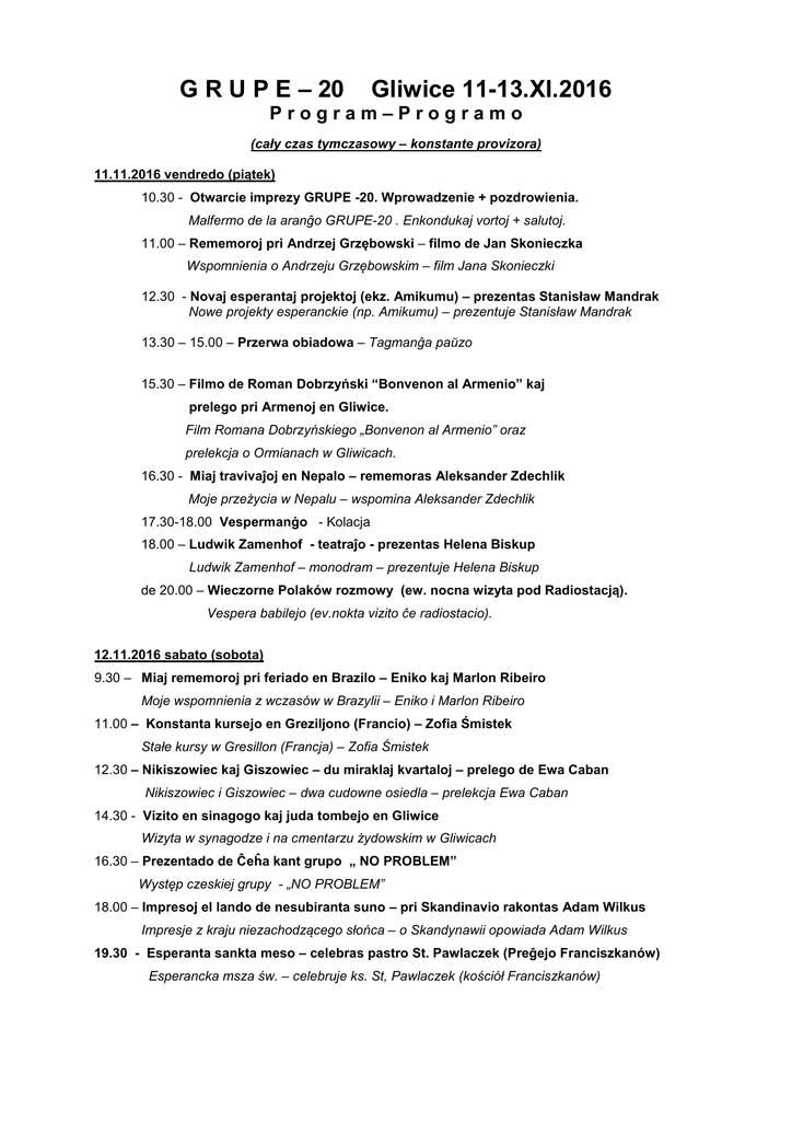G R U P E – 20 Gliwice 11-13.XI.2016 Program–Programo (cały czas tymczasowy – konstante provizora) 11.11.2016 vendredo (piątek) 10.30 - Otwarcie imprezy GRUPE -20. Wprowadzenie + pozdrowienia. Malfermo de la aranĝo GRUPE-20 . Enkondukaj vortoj + salutoj. 11.00 – Rememoroj pri Andrzej Grzębowski – filmo de Jan Skonieczka Wspomnienia o Andrzeju Grzębowskim – film Jana Skonieczki 12.30 - Novaj esperantaj projektoj (ekz. Amikumu) – prezentas Stanisław Mandrak Nowe projekty esperanckie (np. Amikumu) – prezentuje Stanisław Mandrak 13.30 – 15.00 – Przerwa obiadowa – Tagmanĝa paŭzo 15.30 – Filmo de Roman Dobrzyński “Bonvenon al Armenio” kaj prelego pri Armenoj en Gliwice. Film Romana Dobrzyńskiego „Bonvenon al Armenio” oraz prelekcja o Ormianach w Gliwicach. 16.30 - Miaj travivaĵoj en Nepalo – rememoras Aleksander Zdechlik Moje przeżycia w Nepalu – wspomina Aleksander Zdechlik 17.30-18.00 Vespermanġo - Kolacja 18.00 – Ludwik Zamenhof - teatraĵo - prezentas Helena Biskup Ludwik Zamenhof – monodram – prezentuje Helena Biskup de 20.00 – Wieczorne Polaków rozmowy (ew. nocna wizyta pod Radiostacją). Vespera babilejo (ev.nokta vizito ĉe radiostacio). 12.11.2016 sabato (sobota) 9.30 – Miaj rememoroj pri feriado en Brazilo – Eniko kaj Marlon Ribeiro Moje wspomnienia z wczasów w Brazylii – Eniko i Marlon Ribeiro 11.00 – Konstanta kursejo en Greziljono (Francio) – Zofia Śmistek Stałe kursy w Gresillon (Francja) – Zofia Śmistek 12.30 – Nikiszowiec kaj Giszowiec – du miraklaj kvartaloj – prelego de Ewa Caban Nikiszowiec i Giszowiec – dwa cudowne osiedla – prelekcja Ewa Caban 14.30 - Vizito en sinagogo kaj juda tombejo en Gliwice Wizyta w synagodze i na cmentarzu żydowskim w Gliwicach 16.30 – Prezentado de Ĉeĥa kant grupo „ NO PROBLEM” Występ czeskiej grupy - „NO PROBLEM” 18.00 – Impresoj el lando de nesubiranta suno – pri Skandinavio rakontas Adam Wilkus Impresje z kraju niezachodzącego słońca – o Skandynawii opowiada Adam Wilkus 19.30 - Esperanta sankta meso – celebras pastro St. Pawlaczek (Preĝejo Franciszkanów) Esperancka msza św. – celebruje ks. St, Pawlaczek (kościół Franciszkanów) 13.11. niedziela (dimanĉo) 10.00 – 35.a Pola E-Kongreso Łódź 2016 filmo de Jan Skonieczka 35-y Kongres polskich esperantystów – Łódź 2016 – film Jana Skonieczki 10.45 - Esperanta movado en Pollando – estraranoj de PEA Ruch esperancki w Polsce – Zarząd Główny PZE 14.00 – Zakończenie spotkania - GRUPE- 20 Fino de la aranĝo – GRUPE-20 ****************** Organizatorzy zastrzegają sobie prawo do zmian w programie. Organizantoj rezervas por si la rajtojn fari ŝanĝojn en la programo. Podczas spotkania czynne będzie stoisko esperanckie z wieloma ciekawymi (nowymi i starymi) wydawnictwami. Będzie możliwość nabycia ciekawych walorów filatelistycnych (esperanckie kartki, widokówki, koperty, okolicznościowe e-datowniki) Dum la kunveno funkcios libroservo kun interesaj (novaj kaj malnovaj) eldonaĵoj. Eblos aĉeti ankaŭ interesajn filatelaĵojn (bildkartoj, poŝtkartoj, kovertoj kaj porokazaj e-poŝtstampoj) Proponujemy także smaczne miody z pasieki kol. Romana Schodnickiego (Bielsko-Biała) Ni proponas ankaŭ bongustajn mielojn el la abelejo de kol. Roman Schodnicki (Bielsko-Biała)