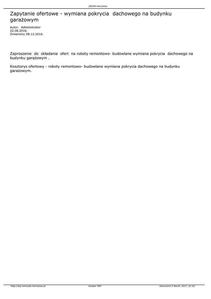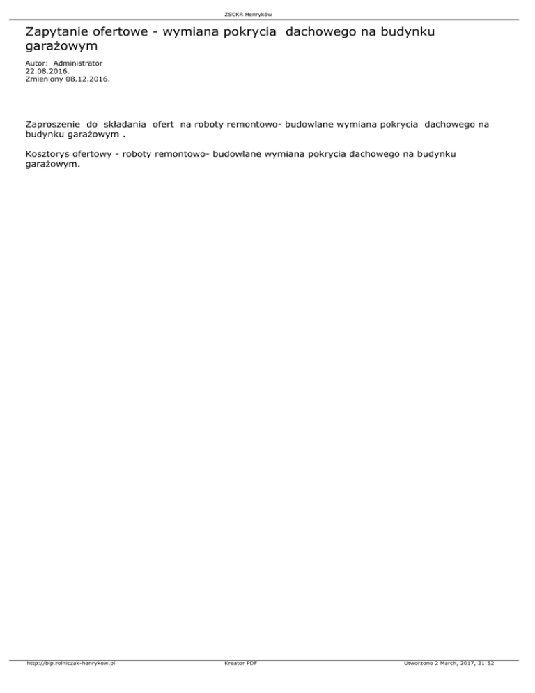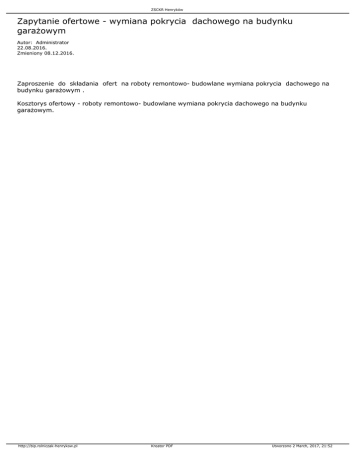 ZSCKR Henryków Zapytanie ofertowe - wymiana pokrycia dachowego na budynku garażowym Autor: Administrator 22.08.2016. Zmieniony 08.12.2016. Zaproszenie do składania ofert na roboty remontowo- budowlane wymiana pokrycia dachowego na budynku garażowym . Kosztorys ofertowy - roboty remontowo- budowlane wymiana pokrycia dachowego na budynku garażowym. http://bip.rolniczak-henrykow.pl Kreator PDF Utworzono 2 March, 2017, 21:52