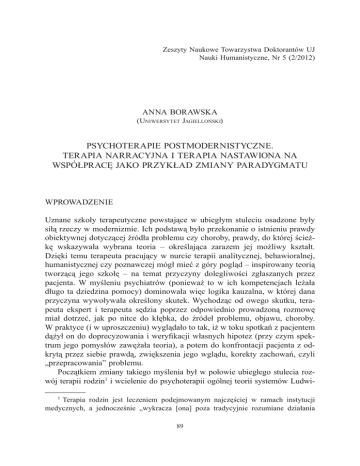 Zeszyty Naukowe Towarzystwa Doktorantów UJ Nauki Humanistyczne, Nr 5 (2/2012) Anna Borawska (Uniwersytet Jagielloński) Psychoterapie postmodernistyczne. Terapia narracyjna i terapia nastawiona na współpracę jako przykład zmiany paradygmatu Wprowadzenie Uznane szkoły terapeutyczne powstające w ubiegłym stuleciu osadzone były siłą rzeczy w modernizmie. Ich podstawą było przekonanie o istnieniu prawdy obiektywnej dotyczącej źródła problemu czy choroby, prawdy, do której ścieżkę wskazywała wybrana teoria – określająca zarazem jej możliwy kształt. Dzięki temu terapeuta pracujący w nurcie terapii analitycznej, behawioralnej, humanistycznej czy poznawczej mógł mieć z góry pogląd – inspirowany teorią tworzącą jego szkołę – na temat przyczyny dolegliwości zgłaszanych przez pacjenta. W myśleniu psychiatrów (ponieważ to w ich kompetencjach leżała długo ta dziedzina pomocy) dominowała więc logika kauzalna, w której dana przyczyna wywoływała określony skutek. Wychodząc od owego skutku, terapeuta ekspert i terapeuta sędzia poprzez odpowiednio prowadzoną rozmowę miał dotrzeć, jak po nitce do kłębka, do źródeł problemu, objawu, choroby. W praktyce (i w uproszczeniu) wyglądało to tak, iż w toku spotkań z pacjentem dążył on do doprecyzowania i weryfikacji własnych hipotez (przy czym spektrum jego pomysłów zawężała teoria), a potem do konfrontacji pacjenta z odkrytą przez siebie prawdą, zwiększenia jego wglądu, korekty zachowań, czyli „przepracowania” problemu. Początkiem zmiany takiego myślenia był w połowie ubiegłego stulecia rozwój terapii rodzin1 i wcielenie do psychoterapii ogólnej teorii systemów Ludwi1 Terapia rodzin jest leczeniem podejmowanym najczęściej w ramach instytucji medycznych, a jednocześnie „wykracza [ona] poza tradycyjnie rozumiane działania 89 Anna Borawska ka von Bertalanffy’ego oraz pewnych założeń cybernetyki. Uproszczona i dostosowana do potrzeb tej dziedziny wiedzy i praktyki ogólna teoria systemów skłoniła terapeutów do zwrócenia większej uwagi na rolę otoczenia, a przede wszystkim rodziny osoby objętej opieką psychoterapeuty. Wprawdzie już Zygmunt Freud dostrzegał wpływ – w skali mikro – osób z najbliższego otoczenia swoich pacjentów, a w skali makro – społeczeństwa na kształtowanie się pewnych zaburzeń2, jednakże kładł on wyraźnie nacisk na konieczność wydzielenia osoby pacjenta i zajmowania się nią niejako w oderwaniu od kontekstu – uważał na przykład, że psychoterapeucie nie wolno wchodzić w kontakt z członkami rodziny pacjenta, gdyż może to prowadzić do utraty obiektywizmu3. Siła oddziaływania autorytetu Freuda była tej miary, iż psychoterapeuci, nie tylko psychoanalityczni, potraktowali tę opinię jak nakaz. Obowiązywała ona przez większość minionego stulecia, choć już od lat trzydziestych podejmowano nieśmiałe próby pracy z pacjentem i bliskimi mu osobami4. Od lat pięćdziesiątych ten sposób pracy terapeutów stawał się coraz bardziej popularny, a na pewno coraz bardziej potrzebny wskutek zmieniającej się sytuacji społeczno-kulturowej rodziny5. Logika (przyczynowość) cybernetyczna6 dopełniła zmian w postrzeganiu wpływu systemu, w którym pozostaje pacjent, na rozwój lub utrzymanie się zaburzenia – ale też wpływu członków rodziny na siebie nawzajem. Od myślemedyczne. Jej swoistość polega na tym, że celem jest tu uzyskanie korzystnej zmiany w zakresie tego, co się dzieje między członkami rodziny” (B. de Barbaro, Dzieje terapeuty rodzinnego, „Znak” 2002, nr 2, s. 90). Do zmiany tej może dojść wskutek przemian w komunikacji, procesach emocjonalnych, strukturze rodziny. Terapeuta rodzinny powinien być obeznany z zagadnieniami dotyczącymi teorii rodziny, psychologii jednostki, socjologii i antropologii kulturowej. W tych wymaganiach można dopatrywać się pewnych przyczyn, dla których to właśnie terapia rodzin podlega nadal intensywnym zmianom. Jak zauważa Górniak: „systemowa terapia rodzin stanowi o tyle ciekawy obszar instytucjonalnego pomagania, że jej metodologia stanowi wyraźne odbicie nowych idei i koncepcji pojawiających się w naukach społecznych i poznawczych” (L. Górniak, Konstruktywizm a zmiany w praktyce psychoterapeutycznej, [w:] Ewolucja myślenia systemowego w terapii rodzin. Od metafory cybernetycznej do dialogu i narracji, red. B. Józefik, L. Górniak, Kraków 2003, s. 33–56). 2 H. Goldenberg, I. Goldnberg, Terapia rodzin, tłum. M. Łuczak, M. Młynarz, K. Siemieniuk, Kraków 2006. 3 Teoria Freuda – podobnie jak jego praktyka – podlegała ewolucji i stwierdzenie to nie może być zawsze do niej odnoszone. 4 H. Goldenberg, I. Goldenberg, op. cit. 5 B. de Barbaro, Dzieje terapeuty rodzinnego, op. cit., s. 90–95; B. Józefik, Rozwój myślenia systemowego a terapia rodzin, [w:] Ewolucja myślenia systemowego w terapii rodzin…, op. cit., s. 19–32; B. Almond, The Fragmenting family, Oxford 2006; M. Orwid, Wstęp, [do:] Ewolucja myślenia systemowego w terapii rodzin…, op. cit., s. 7–10. 6 B. Józefik, op. cit. 90 Psychoterapie postmodernistyczne... nia linearnego, w którym zakładano istnienie określonego rozwiązania, psychoterapeuci przeszli do rozumienia wzajemnych zależności w kategoriach pętli sprzężenia zwrotnego. Działania jednostki przestały być rozumiane jako jedynie rezultaty wewnętrznych konfliktów (opcja psychodynamiczna), błędów poznawczych (terapia kognitywistyczna), wyuczonych reakcji (behawioryzm) etc., a były rozumiane jako element „tańca rodziny”, zarazem skutek i przyczyna działań innych osób. Ten sposób rozumienia problemu nie podważył przekonania o możliwości dotarcia do przyczyn leżących u podłoża zaburzeń, tyle tylko, że teraz były one rozumiane relacyjnie – osadzone nie tylko w historii osoby, ale i rodziny. Źródłem dalszych zmian był rozwój różnych kierunków