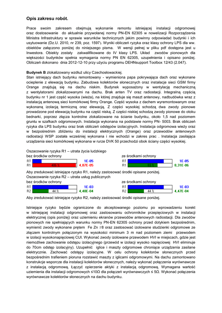 Opis zakresu robót. Prace swoim zakresem obejmują wykonanie remontu istniejącej instalacji odgromowej oraz dostosowanie do aktualnie przywołanej normy PN-EN 62305 w nowelizacji Rozporządzenia Ministra Infrastruktury w sprawie warunków technicznych jakim powinny odpowiadać budynki i ich usytuowanie (Dz.U. 2010, nr 239, poz. 1597). Wyniki obliczeń ryzyka oraz klasy ochrony LPS dla ww. obiektów załączono poniżej do niniejszego pisma. W wersji pełnej w pliku pdf dostępna jest u Inwestora. Obiekty zostały zakwalifikowane do IV klasy LPS. Układ zwodów pionowych dla większości budynków spełnia wymagania normy PN EN 62305, uzupełnienia i opisano poniżej. Obliczeń dokonano dnia 2012-12-10 przy użyciu programu DEHNsupport Toolbox 12/43 (2.047). Budynek B zlokalizowany wzdłuż ulicy Czechosłowackiej. Stan istniejący dach budynku remontowany - wymieniona papa pokrywająca dach oraz wykonane ocieplenie z elewacją budynku. Zabudowa kolektorów słonecznych oraz instalacje sieci GSM firmy Orange znajdują się na dachu niskim. Budynek wyposażony w wentylację mechaniczną z wentylatorami zlokalizowanymi na dachu. Brak anten TV oraz radiostacji. Integralną częścią budynku nr 1 jest część wysoka (wieża), na której znajduje się maszt antenowy, nadbudówka wraz z instalacją antenową sieci komórkowej firmy Orange. Część wysoka z dachem wyremontowanym oraz wykonaną izolacją termiczną oraz elewacją. Z części wysokiej schodzą dwa zwody pionowe prowadzone pod elewacją budynku na część niską. Z części niskiej schodzą zwody pionowe do otoku bednarki, poprzez złącza kontrolne zlokalizowane na ścianie budynku, około 1,5 nad poziomem gruntu w szafkach odgromowych. Instalacja wykonana na podstawie normy PN- 5003. Brak obliczeń ryzyka dla LPS budynku oraz brak obliczeń odstępów izolacyjnych. Instalacja odgromowa wieży oraz w bezpośrednim zbliżeniu do instalacji elektrycznych (Orange) oraz przewodów antenowych radiostacji WSP została wcześniej wykonana i nie wchodzi w zakres prac . Instalacja zasilająca urządzenia sieci komórkowej wykonana w rurze DVK 50 przechodzi obok ściany części wysokiej. Oszacowanie ryzyka R1 – utrata życia ludzkiego bez środków ochrony ze środkami ochrony Aby zredukować istniejące ryzyko R1, należy zastosować środki opisane poniżej. Oszacowanie ryzyka R2 – utrata usług publicznych bez środków ochrony ze środkami ochrony Aby zredukować istniejące ryzyko R2, należy zastosować środki opisane poniżej. Istniejące ryzyko będzie ograniczone do akceptowanego poziomu po wprowadzeniu korekt w istniejącej instalacji odgromowej oraz zastosowaniu ochronników przepięciowych w instalacji elektrycznej (opis poniżej) oraz uziemieniu ekranów przewodów antenowych radiostacji. Dla zwodów pionowych nie spełniających warunku normy PN-EN 62305 ochrony przed dotykiem bezpośrednim, wymienić zwody wykonane prętem Fe Zn F8 oraz zastosować izolowane studzienki odgromowe ze złączem kontrolnym połączonym na wysokości minimum 3 m nad poziomem ziemi przewodem w izolacji wysokonapięciowej CUI. Wykonać zwody izolowane przewodem HVI w miejscach, gdzie jest niemożliwe zachowanie odstępu izolacyjnego (przewód w izolacji wysoko napięciowej HVI eliminuje do 70cm odstęp izolacyjny). Uzupełnić iglice i maszty odgromowe chroniące urządzenia zasilane elektrycznie. Zachować odstępy izolacyjne. W celu ochrony kolektorów słonecznych przed bezpośrednim trafieniem pioruna rozstawić maszty z iglicami odgromowymi. Na dachu zamontowano konstrukcje wsporcze dla instalacji kolektorów słonecznych, należy wykonać połączenia wyrównawcze z instalacją odgromową. Łączyć opierzenie aktyki z instalacją odgromową. Wymagana wartość uziemienia dla instalacji odgromowych ≤10Ω dla połączeń wyrównawczych ≤ 5Ω. Wykonać połączenia wyrównawcze kolektorów słonecznych na dachu budynku. Budynek C stołówka zlokalizowany wzdłuż ulicy Czechosłowackiej. Obiekt posiada wykonaną izolację termiczną oraz elewację z tynków mineralnych. Zwody pionowe prowadzone są pod elewacją jak na rysunku do ziemi poprzez złącza kontrolne zlokalizowane na ścianie budynku około 1,5 m nad poziomem gruntu w szafkach odgromowych. Instalacja wykonana na podstawie normy PN- 5003. Oszacowanie ryzyka R1 – utrata życia ludzkiego. bez środków ochrony ze środkami ochrony Aby zredukować istniejące ryzyko R1, należy zastosować środki opisane poniżej. Oszacowanie ryzyka R2 – utrata usług publicznych bez środków ochrony ze środkami ochrony Aby zredukować istniejące ryzyko R2, należy zastosować środki opisane poniżej. Instalacja skorodowana przeznaczona do wymiany i uzupełnienia. Zwody pionowe spełniają warunek normy PN-EN 62305 ochrony przed dotykiem bezpośrednim i nie wymagają uzupełnienia. Wymiany wymaga jednak pręt odgromowy stanowiący siatkę zwodów niskich oraz uchwyty, złącza. Uzupełnienia wymagają urządzenia elektryczne zamontowane na dachu (wentylatory, klimatyzatory). Na dachu wykonać siatkę zwodów niskich prętem Fe Zn F8 na klockach betonowych klejonych do papy. Zamontować iglice i maszty odgromowe chroniące urządzenia zasilane elektrycznie, ustawić jak na załączonym rysunku. Zachować odstępy izolacyjne. Łączyć opierzenie aktyki z instalacją odgromową. W rozdzielnicy głównej instalować ochronnik przepięciowy (iskiernikowy z warystorem), że skoordynowaną ochroną przepięciową I i II stopnia. Sprawdzić rezystancję uziomu. Wymagana wartość uziemienia dla instalacji odgromowych ≤10Ω dla połączeń wyrównawczych ≤ 5Ω. Budynek F. Posiada instalację piorunochronną wykonaną na podstawie normy PN-ICE 61024. Obiekt ma wykonaną izolację termiczną oraz elewację z tynków mineralnych. Jako zwody pionowe odprowadzające wykorzystano konstrukcję stalową słupów nośnych połączonych poprzez złącza kontrolne zlokalizowane na ścianie budy