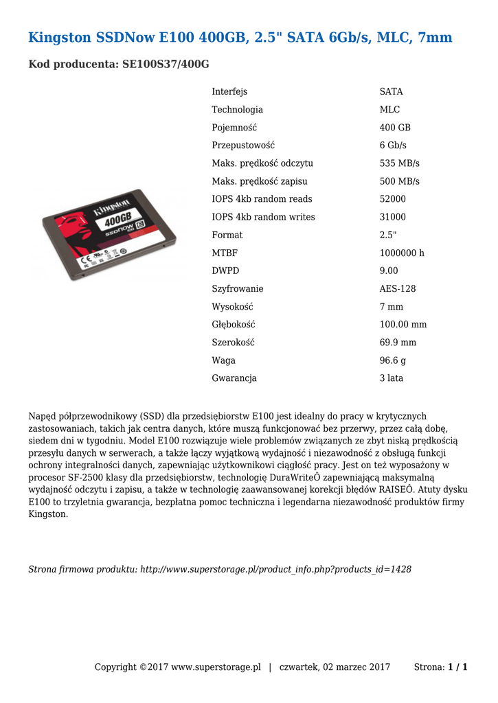 Kingston SSDNow E100 400GB, 2.5" SATA 6Gb/s, MLC, 7mm Kod producenta: SE100S37/400G Interfejs SATA Technologia MLC Pojemność 400 GB Przepustowość 6 Gb/s Maks. prędkość odczytu 535 MB/s Maks. prędkość zapisu 500 MB/s IOPS 4kb random reads 52000 IOPS 4kb random writes 31000 Format 2.5" MTBF 1000000 h DWPD 9.00 Szyfrowanie AES-128 Wysokość 7 mm Głębokość 100.00 mm Szerokość 69.9 mm Waga 96.6 g Gwarancja 3 lata Napęd półprzewodnikowy (SSD) dla przedsiębiorstw E100 jest idealny do pracy w krytycznych zastosowaniach, takich jak centra danych, które muszą funkcjonować bez przerwy, przez całą dobę, siedem dni w tygodniu. Model E100 rozwiązuje wiele problemów związanych ze zbyt niską prędkością przesyłu danych w serwerach, a także łączy wyjątkową wydajność i niezawodność z obsługą funkcji ochrony integralności danych, zapewniając użytkownikowi ciągłość pracy. Jest on też wyposażony w procesor SF-2500 klasy dla przedsiębiorstw, technologię DuraWriteÔ zapewniającą maksymalną wydajność odczytu i zapisu, a także w technologię zaawansowanej korekcji błędów RAISEÔ. Atuty dysku E100 to trzyletnia gwarancja, bezpłatna pomoc techniczna i legendarna niezawodność produktów firmy Kingston. Strona firmowa produktu: http://www.superstorage.pl/product_info.php?products_id=1428 Copyright ©2017 www.superstorage.pl | czwartek, 02 marzec 2017 Strona: 1 / 1