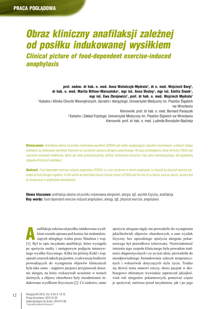 PRACA POGLĄDOWA Obraz kliniczny anafilaksji zależnej od posiłku indukowanej wysiłkiem Clinical picture of food-dependent exercise-induced anaphylaxis prof. nadzw. dr hab. n. med. Anna Wolańczyk-Mędrala1, dr n. med. Wojciech Barg2, dr hab. n. med. Marita Nittner-Marszalska1, mgr inż. Anna Skotny1, mgr inż. Emilia Siwak1, mgr inż. Ewa Zbrojewicz1, prof. dr hab. n. med. Wojciech Mędrala1 1 Katedra i Klinika Chorób Wewnętrznych, Geriatrii i Alergologii, Uniwersytet Medyczny im. Piastów Śląskich we Wrocławiu Kierownik: prof. dr hab. n. med. Bernard Panaszek 2 Katedra i Zakład Fizjologii, Uniwersytet Medyczny im. Piastów Śląskich we Wrocławiu Kierownik: prof. dr hab. n. med. Ludmiła Borodulin-Nadzieja Streszczenie: Anafilaksja zależna od posiłku indukowana wysiłkiem (FDEIA) jest rzadko występującym zespołem chorobowym, w którym objawy anafilaksji są indukowane wysiłkiem fizycznym po uprzednim spożyciu alergenu pokarmowego. W pracy przedstawiono obraz kliniczny FDEIA oraz znaczenie rozmaitych kofaktorów, takich jak: kwas acetylosalicylowy, alkohol, temperatura otoczenia i faza cyklu menstruacyjnego, dla wyzwalania objawów klinicznych anafilaksji. Abstract: Food-dependent exercise-induced anaphylaxis (FDEIA) is a rare syndrome in which anaphylaxis is induced by physical exercise preceded by food allergen ingestion. In this article we described diverse clinical picture of FDEIA and the role of co-factors such as aspirin, alcohol and air temperature in anaphylaxis development. Słowa kluczowe: anafilaksja zależna od posiłku indukowana alergenem, alergia, IgE, wysiłek fizyczny, anafilaksja Key words: food-dependent exercise-induced anaphylaxis, allergy, IgE, physical exercise, anaphylaxis A nafilaksja zależna od posiłku indukowana wysiłkiem została opisana pod koniec lat siedemdziesiątych ubiegłego wieku przez Maulitza i wsp. [1]. Był to opis incydentu anafilaksji, która wystąpiła po spożyciu małży i następowym podjęciu intensywnego wysiłku fizycznego. Kilka lat później Kidd i wsp. opisali czterech takich pacjentów, a sekwencja bodźców prowadzących do wystąpienia objawów klinicznych była taka sama – najpierw pacjenci przyjmowali doustnie alergen, na który wykazywali uczulenie w testach skórnych, a objawy chorobowe były nieodmiennie indukowane wysiłkiem fizycznym [2]. Co ciekawe, samo 12 Alergoprofil 2013, Vol. 9, Nr 4, 12-15 Pracę otrzymano: 2013.12.30 Zaakceptowano do druku: 2014.01.08 “Copyright by Medical Education” spożycie alergenu nigdy nie prowadziło do wystąpienia jakichkolwiek objawów chorobowych, a sam wysiłek fizyczny bez uprzedniego spożycia alergenu pokarmowego był prawidłowo tolerowany. Nieświadomość istnienia tego zespołu klinicznego była powodem trudności diagnostycznych i co za tym idzie, prowadziła do nieodpowiedniego formułowania zaleceń terapeutycznych i wskazówek dotyczących stylu życia. Trudno się dziwić temu stanowi rzeczy, skoro pacjent w drobiazgowo zbieranym wywiadzie zaprzeczał jakiejkolwiek roli alergenów pokarmowych, ponieważ często je spożywał, zarówno przed incydentem, jak i po jego PRACA POGLĄDOWA zaistnieniu, i zawsze dobrze je tolerował, podobnie jak wysiłek fizyczny. Wspomniana wyżej grupa badawcza Kidda zaproponowała nową nazwę tego zespołu chorobowego: anafilaksja zależna od posiłku indukowana wysiłkiem (FDEIA, food-dependent exercise-induced anaphylaxis) [2]. Trzeba podkreślić, że zaproponowana nazwa optymalnie przedstawiała charakter opisywanego zespołu klinicznego, ponieważ to wysiłek fizyczny indukował wystąpienie anafilaksji, ale była ona zależna od wcześniejszego spożycia alergenu pokarmowego. Konsekwencją tego była szeroka akceptacja tej nazwy, która przetrwała do dziś. Z biegiem czasu kolejne grupy badawcze opisywały coraz więcej takich przypadków [3–11]. W większości tych doniesień prezentowano głównie pojedynczych pacjentów, ponieważ, jak się okazało, jest to rzadko występująca patologia, znana stosunkowo słabo, nawet w kręgach alergologicznych. Przykładem dobrze ilustrującym częstość występowania tego zespołu klinicznego jest publikacja zespołu japońskiego, w której występowanie FDEIA wśród młodzieży szkół średnich było na poziomie 0,017% [3]. Ten klasyczny obraz kliniczny został potwierdzony przez badaczy włoskich, którzy określili, iż w badanej populacji najczęstszymi alergenami są pomidory, zboża i orzeszki ziemne [10], podczas gdy w populacji japońskiej – pszenica, a zwłaszcza jej składowa omega-5 gliadyna [9]. Ten fakt skłonił badaczy japońskich do stosowania innej nazwy: anafilaksja zależna od pszenicy indukowana wysiłkiem – wheatdependent exercise-induced anaphylaxis (WDEIA), zamiast stosowania przyjętej już nazwy FDEIA. Tę pokrewną nazwę uzasadnia jedynie rodzaj alergenu, lecz objawy kliniczne i sekwencja działania bodźców pozostają takie same. Wyżej wymienione alergeny pokarmowe są najważniejszymi pod względem częstości wywoływania objawów FDEIA, lecz ich spektrum jest bogate. Są to: owoce morza, mleko krowie, pomarańcze, cebula, grejpfruty, mięsa, ślimaki, fasola i grzyby [6]. Dodatkowymi czynnikami, powodującymi trudności diagnostyczne, mogą być alergeny inhalacyjne, takie jak roztocza, lub występujące jako zanieczyszczenia w diecie pleśnie, które opisano jako alergeny sprawcze zdolne do wywoływania objawów FDEIA [6]. Tak szeroka gama alergenów, których rolę w rozwoju objawów FDEIA udowodniono, sugeruje, że do wywołania objawów FDEIA niezbędny jest fakt ich spożycia, a nie ich specyficzne właściwości strukturalne bądź czynnościowe. Kluczowy jest po prostu fakt ich obecności w przewodzie pokarmowym i uprzednie wytworzenie nadwrażliwości IgE-zależnej. Do wywołania objawów anafilaksji jest zaś niezbędny proces ich wchłonięcia do krwiobiegu. W klasycznym ujęciu A. Wolańczyk-Mędrala, W. Barg, M. Nittner