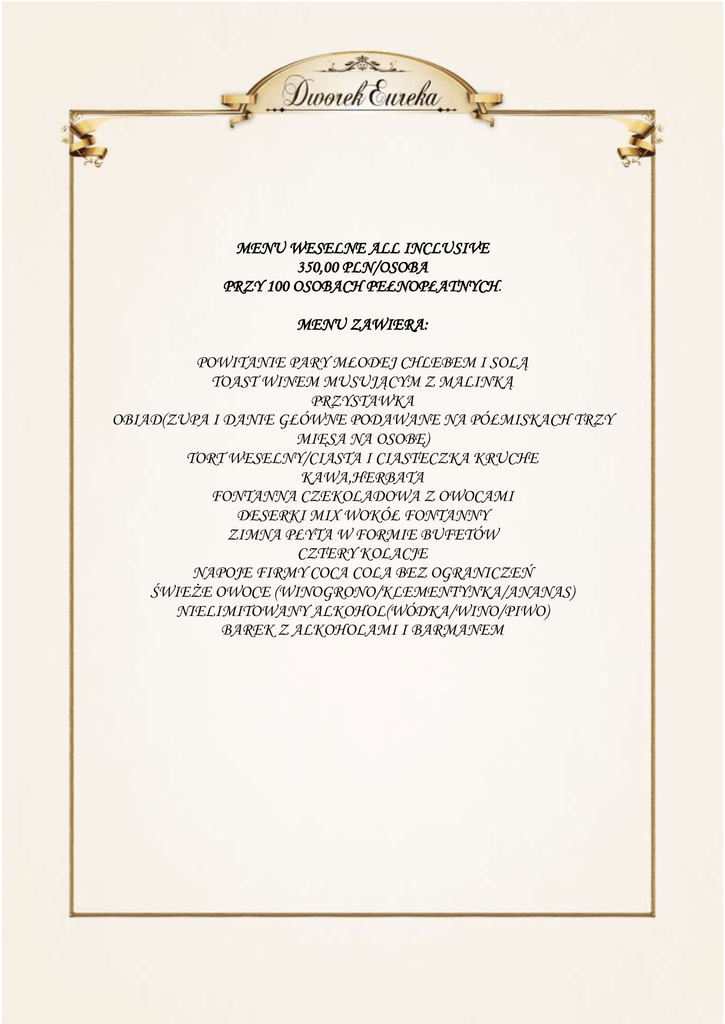MENU WESELNE ALL INCLUSIVE 350,00 PLN/OSOBA PRZY 100 OSOBACH PEŁNOPŁATNYCH. MENU ZAWIERA: POWITANIE PARY MŁODEJ CHLEBEM I SOLĄ TOAST WINEM MUSUJĄCYM Z MALINKĄ PRZYSTAWKA OBIAD(ZUPA I DANIE GŁÓWNE PODAWANE NA PÓŁMISKACH TRZY MIĘSA NA OSOBĘ) TORT WESELNY/CIASTA I CIASTECZKA KRUCHE KAWA,HERBATA FONTANNA CZEKOLADOWA Z OWOCAMI DESERKI MIX WOKÓŁ FONTANNY ZIMNA PŁYTA W FORMIE BUFETÓW CZTERY KOLACJE NAPOJE FIRMY COCA COLA BEZ OGRANICZEŃ ŚWIEŻE OWOCE (WINOGRONO/KLEMENTYNKA/ANANAS) NIELIMITOWANY ALKOHOL(WÓDKA/WINO/PIWO) BAREK Z ALKOHOLAMI I BARMANEM POWITANIE PARY MŁODEJ I GOŚCI: UROCZYSTE POWITANIE CHLEBEM I SOLĄ W HOLU DWORKU TOAST WINEM MUSUJĄCYM Z MALINKĄ NA ŚRODKU SALI BALOWEJ PRZYSTAWKA DO WYBORU: SAŁATKA CAPRESSE ŁOSOŚ WĘDZONY NA SAŁACIE PASZTET Z KACZKI Z SOSEM WIŚNIOWYM ZUPA DO WYBORU: KRÓLEWSKI ROSÓŁ Z MAKARONEM I KLUSECZKAMI KREM PIECZARKOWY Z GROSZKIEM PTYSIOWYM KREM BROKUŁOWY Z GRZANKĄ DANIA GŁÓWNE SERWOWANE NA PÓŁMISKACH 3szt./os.: ŚLĄSKA ROLADA WOŁOWA SCHAB FIRMOWY ZAPIEKANY Z BOCZKIEM I SEREM KORONA Z SCHABU FASZEROWANA DE VOLAILLE TRADYCYJNY KOTLET PANIEROWANY UDKO FASZEROWANE PIECZARKAMI DODATKI DO GŁÓWNEGO DANIA: KLUSKI ŚLĄSKIE WŁASNEJ PRODUKCJI ZIEMNIAKI GOTOWANE Z KOPERKIEM KAPUSTA CZERWONA GOTOWANA KAPUSTA BIAŁA SURÓWKA SURÓWKA Z MARCHWI I POMARAŃCZY BURACZKI TARTE SŁODYCZE: TORT WESELNY SERWOWANY DLA KAŻDEGO BUFET Z FONTANNĄ CZEKOLADOWĄ(OWOCE,RURKI,PIANKI) BUFET Z DESERKAMI MIX 1 SZT NA OSOBĘ(PANA COTTA,KREM BRULEE,JAŚ I MAŁGOSIA,GALARETKI) BUFET (OSIEM RODZAJÓW CIASTA). OWOCE (WINOGRONO,MANDARYNKA I ANANAS KROJONY) SERWOWANY NA STOŁY NA PATERACH ORAZ KRUCHE CIASTECZKA. BUFET Z ZAKĄSKAMI W DWÓCH BUFETACH NA ZIMNO: TRADYCYJNE MIĘSA PIECZONE SZYNKA WIEPRZOWA PIECZONA W PIECU DESKA SERÓW (SER ŻÓŁTY/PLESNIOWY,KORBACZE,OSCYPKI) SAŁATKA GRECKA SAŁATKA Z SELERA NACIOWEGO I ORZECHÓW SAŁATKA JARZYNOWA SAŁATKA Z RUCOLLI I SUSZONE POMIDORY TYMBALIK Z DROBIU RULONIK Z NADZIENIEM CHRZANOWYM ŚLEDZ W ŚMIETANIE MOZARELLA W POMIDORACH BEFSZTYK TATARSKI ŁOSOŚ Z PASTĄ CHRZANOWĄ PIECZYWO MIX BUFET Z ZAKĄSKAMI W DWÓCH BUFETACH NA GORĄCO: PIEROGI DOMOWE MIX OSCYPEK W BEKONIE ŚLIWKA W BEKONIE KORECZKI DROBIOWE ŻEBERKA PIECZONE NA KAPUŚCIE I KOLACJA DO WYBORU: STEK WIEPRZOWY NA PLACKU ZIEMNIACZANYM W SOSIE Z ZIELONEGO PIEPRZU ROLADKA DROBIOWA ZIEMNIAKI PIECZONE SAŁATKA MIX POLĘDWICZKI WIEPRZOWE,KLUSKI SZARE,BROKUŁY GOTOWANE II KOLACJA: BARSZCZ Z KROKIETEM PASZTECIK Z CIASTA FRANCUSKIEGO Z BARSZCZEM CAMEMBERT ZAPIEKANY Z ŻURAWINĄ SAŁATKA Z GRILLOWANYM KURCZAKIEM,SOS CZOSNKOWY III KOLACJA CYGAŃSKA: ŚWINKI PŁONĄCE,CHRZAN,MUSZTARDA,KAPUSTA ZASMAZANA SZASZŁYKI DROBIOWE,CHRZAN,MUSZTARDA,PIECZYWO ŻEBERKA PIECZONE Z KAPUSTĄ ZASMAŻANĄ IV KOLACJA: ŻUREK STAROPOLSKI Z ZIEMNIAKAMI I SKWARKAMI (BOGRACZ)GULASZ WĘGIERSKI Z KLUSKAMI GULASZ WIEPRZOWY KREM TOSKAŃSKI Z ŚWIEŻYCH POMIDORÓW NAPOJE BEZ ALKOHOLOWE NIELIMITOWANE: WODA GAZOWANA NIEGAZOWANA,SOKI,COLA,SPRITE,KAWA,HERBATA NAPOJE ALKOHOLOWE NIELIMITOWANE: WÓDKA WYBOROWA,WINO WŁOSKIE,PIWO LANE TYSKIE. BAR Z BARMANEM BEZ OGRANICZEŃ: WHISKI BALLANTINES,GRANTS,MARTINI,WINO WŁOSKIE BIAŁE I CZERWONE,ORAZ CZTERY COCKTAILE