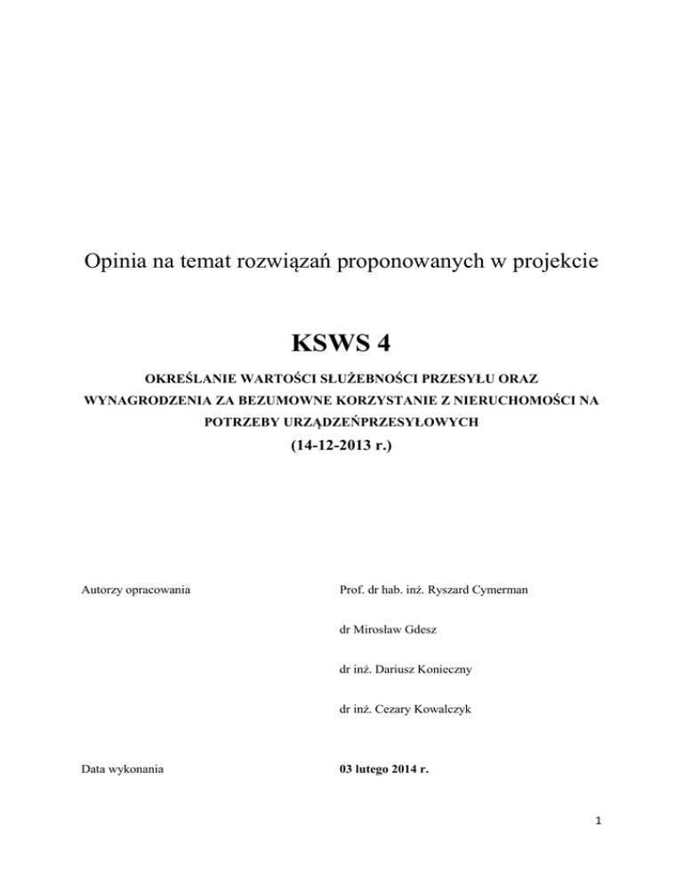 Opinia na temat rozwiązań proponowanych w projekcie KSWS 4 OKREŚLANIE WARTOŚCI SŁUŻEBNOŚCI PRZESYŁU ORAZ WYNAGRODZENIA ZA BEZUMOWNE KORZYSTANIE Z NIERUCHOMOŚCI NA POTRZEBY URZĄDZEŃPRZESYŁOWYCH (14-12-2013 r.) Autorzy opracowania Prof. dr hab. inż. Ryszard Cymerman dr Mirosław Gdesz dr inż. Dariusz Konieczny dr inż. Cezary Kowalczyk Data wykonania 03 lutego 2014 r. 1 Spis treści 1. Przedmiot i zakres opinii ................................................................................................................. 3 2. Cel opinii ......................................................................................................................................... 3 3. Stan prac nad jednolitym standardem.............................................................................................. 3 4. Stan nieruchomości na dzień szacowania wartości prawa służebności przesyłu ............................ 8 5. Uwagi do treści zawartych w projekcie standardu ........................................................................ 12 6. Konkluzje ...................................................................................................................................... 19 7. Wnioski ......................................................................................................................................... 20 2 1. Przedmiot i zakres opinii W opinii odniesiono się do proponowanego definiowania pojęć oraz rozwiązań metodycznych z zakresu określania wartości służebności przesyłu i bezumownego korzystania z nieruchomości zaproponowanych w projekcie standardu KSWS 4 z dnia 14 grudnia 2013 r. 2. Cel opinii Wypracowanie jednolitych zasad szacowania wartości służebności przesyłu oraz wskazanie słabych stron proponowanej metodyki i metodologii. 3. Stan prac nad jednolitym standardem Przed przystąpieniem do omówienia aktualnych zapisów standardu chcielibyśmy przypomnieć rozwiązania stosowane w projektach standardu KSWS 4 proponowanych do dnia dzisiejszego. Tabela 1. Przykłady różnego podejścia do szacowania wartości służebności przesyłu Przybliżony miesiąc udostępnienia projektu marzec 2011 Wzajemne relacje pomiędzy obniżeniem wartości a wartością prawa służebności (WSP oznacza wartość służebności przesyłu, ZW i OW jest to zmniejszenie wartości na skutek lokalizacji sieci) Uwagi do projektu wrzesień 2011 – opinia Pani prof. dr hab. Stanisławy Kalus i dr Grzegorza Matusika wskazująca miedzy innymi na konieczność oddzielenia odszkodowań od wynagrodzeń; maj 2011 – negatywna opinia dr inż. Dariusza Koniecznego i dr inż. Cezarego Kowalczyk; MINISTER INFRASTRUKTURY odmawia uzgodnienia październik 2011 Pojawiły się dwa projekty z wzorami i bez wzorów jednak żaden nie znalazł jednolitego uznania środowiska rzeczoznawców. 3 maj 2012 Ta wersja projektu pokazuje, że wartość służebności przesyłu należy liczyć od wartości nieruchomości obciążonej urządzeniami infrastruktury. To podejście jest logiczne, ponieważ oddziela szkody wyrządzone na etapie planistycznym i etapie budowy od korzystania z nieruchomości. lipiec 2012 – mimo słusznego założenia wyjściowego, projekt standardu zawiera wiele błędów logicznych, dlatego uzyskuje negatywną opinię dr inż. Dariusza Koniecznego i dr inż. Cezarego Kowalczyk; grudzień 2013 W tym projekcie zaproponowano różny sposób określania WSP zależny od daty wybudowania sieci: a) b) WSP = W2 – W4 WSP = W1 – W4 Źródło: Opracowanie własne na podstawie projektów standardu KSWS 4. Proszę zauważyć, iż proponowane rozwiązania przedstawiane przez jeden zespół opracowujący projekt standardu KSWS 4 potrafią być różne. W czasie tworzenia projektów nie zmieniały się przepisy związane z zagadnieniem wyceny praw do nieruchomości, natomiast autorzy przedstawiali środowisku różne koncepcje. Wytworzona sytuacja wielowariantowości, podparta cyklem szkoleniowym, w ramach którego podawano różne zasady postępowania w zależności od przyjmowanej metodyki doprowadziła do chaosu, jaki panuje w stosowanych w praktyce procedurach szacowania wartości ograniczonego prawa rzeczowego, jakim jest prawo służebności przesyłu. Autorzy standardu nie dostrzegają podstawowych zależności w polskim prawie, gdzie istnieje wyraźny podział na gałąź prawa administracyjnego i gałąź prawa cywilnego. Prawo służebności przesyłu jest pojęciem z zakresu prawa cywilnego, którego cel jest wyraźnie określony w ustawie z dnia 23 kwietnia 1964 r. Kodeks cywilny (kc). Szkody wynikające z opracowań planistycznych i decyzji lokalizacyjnych zostały opisane w przepisach prawa administracyjnego i to w tych przepisach określono wyraźnie zakres odpowiedzialności organu uchwalającego miejscowe plany zagospodarowania przestrzennego (mpzp) lub wydającego decyzję o ustaleniu lokalizacji inwestycji celu publicznego (ulicp) lub decyzji wydanych w trybie specustw o odpowiedzialności z tytułu ograniczeń przed właścicielem nieruchomości. Zapisy dotyczące odszkodowań i wywłaszczeń związanych z lokalizacją sieci przesyłowych istniały w polskim prawie od początku zeszłego wieku, dlatego zupełnie niezrozumiałe jest twierdzenie autorów projektu standardu KSWS 4 (wersja z 4 grudnia 2013 r.), iż na wartość prawa służebności przesyłu składa się również obniżenie wartości nieruchomości spowodowane ograniczeniem sposobu korzystania na skutek ustalenia lokalizacji sieci przed 1 stycznia 1995 r. (pkt. 1.2 projektu standardu z grudnia 2013 r. ). Wprowadzenie instytucji służebności przesyłu nie miało na celu rozliczania szkód wyrządzonych przed dniem 1 stycznia 1995 r. tylko uregulowanie prawa do korzystania z nieruchomości na przyszłość. W celu rozliczenia spraw zaległych odpłatności za korzystanie służy art. 224 § 2 i art. 225 kodeksu cywilnego mówiący o wynagrodzeniu za bezumowne korzysta