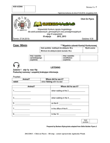KOD UCZNIA Strona 1 z 7 Tajemnica konkursu do dnia 27.04.2013r. do godziny 9.30 Click On Flyers Wojewódzki Konkurs Języka Angielskiego dla szkół podstawowych, gimnazjalnych oraz ponadgimnazjalnych etap III wojewódzki IX edycja 2012_2013 Termin: 27.04.2013r. Godzina: 9.30 Czas: 90min ***Wypełnia członek Komisji Konkursowej Ilość punktów możliwych do zdobycia: 80 p Wynik ucznia: Minimum do zdobycia tytułu laureata: 64 p Imię i nazwisko sprawdzającego: (czytelnie) Imię i nazwisko weryfikatora: (czytelnie) LISTENING Zadanie 1 odp-1p max-10p Posłuchaj rozmowy i uzupełnij brakujące informacje. Przykład: Animal? rabbit Animal? Where did he see it? when fishing with his dad Where did he see it? 1.________________ when waiting at the 2.________________ 3.________________ when walking in the 4.___________ 5. _______________ on the 6. _____________ 7._______________ in the office of the 8._____________ 9._______________ In the 10. ________________ Ilość punktów Prepared by Barbara Rybczyńska adapted from Skills Builder Flyers 2 2012/2013 – Click on Flyers – III etap – zestaw opracowała Agnieszka Wnuk Strona 2 z 7 READING Zadanie 2 odp-1p max-9p Przeczytaj tekst i uzupełnij poniższe zdania, tak aby były poprawne logicznie i gramatycznie. Something strange happened to Katy last Friday evening. It was cold and foggy outside and Katy was coming back home after a school party. When she got home, took out her key, opened the front door and turned on the lights in the hall. Suddenly, she saw a strange creature standing in front of her and looking at her angrily. “Oh no!” she thought. “There is a monster in my house. What should I do?” she whispered. She was sure that the monster wanted to eat her, so she started shouting and ran out of house. “Help! Help” she screamed. But no one could hear her. She went to the garden and hid in the shed. The monster followed her laughing in a human voice. When Katy looked closely she saw that the monster was really strange, because it has four legs and two of them human. “You silly girl!” said the monster. When it took off its head, Katy saw her brother Nick. He couldn`t stop laughing. “How do you like my Halloween costume?” asked Nick. “As soon as I get you, I`ll show you!” shouted Katy and ran into the house, closing the door behind them. 1. Katy had a strange adventure________________________. 2. The weather was _____________________________. 3. Katy __________________________ when she went into her house. 4. Katy saw _______________________ looking at her. 5. She ran out of the house because she thought __________________________ 6. She ran out of the house and _________________________. 7. No one heard her so she decided to hide in ________________________ 8. _________________________ was wearing the monster`s costume. 9. The costume was for ________________________. 10. Ilość punktów Prepared by Barbara Rybczyńska adapted from Skills Builder Flyers 2 2012/2013 – Click on Flyers – III etap – zestaw opracowała Agnieszka Wnuk Strona 3 z 7 Zadanie 3 odp-1p max -11p Przeczytaj i uzupełnij tekst wpisując brakujące słowo wybierając z trzech podanych możliwości poniżej. Universities Many young people go to university 1)_____________________ they finish school. You need to go 2) ____________________ university and study to do lots of 3)________________ jobs. There are hundreds of universities in 4) _______________________ country. Some students choose to study 5)__________________ their family home, 6) ______________ others move to another city. There are 7) ____________________ of subjects you can choose to study. They include geography, science, English, drama, history and 8) __________________ others. University isn’t easy because you have to 9)_________________ lots of books, and study 10) ____________________ hard. When you 11) ________________________your last exams, you know you will find a great job! 1. after before until 2. at in to 3. different same big 4. every all a 5. between near in 6. if once but 7. few much lots 8. many one a lots 9. look listen read 10. much very more 11. finish stop finished Ilość punktów Taken from Skills Builder Flyers 2 by Agnieszka Wnuk 2012/2013 – Click on Flyers – III etap – zestaw opracowała Agnieszka Wnuk Strona 4 z 7 VOCABULARY Zadanie 4 odp-1p max- 8p Rozwiąż krzyżówkę. 1. 2. 3. 4. 5. 6. 7. 8. Across: 1. Rob cut his f………………… while he was using a knife. 2. Jane h…………….. her head when she fell on the floor. 3. Fran b………………. her hand while she was lighting a fire. 4. Akim b…………………… his eye in a karate competition. 5. James c………………… his foot on a piece of glass. 6. Ken s……………………… his wrist while he was playing volleyball. 7. Jake t……………………… his ankle while he was playing basketball. 8. Harry p………………….. a muscle as he was picking up a heavy box. Ilość punktów Taken from Starland 3 by Agnieszka Wnuk 2012/2013 – Click on Flyers – III etap – zestaw opracowała Agnieszka Wnuk Strona 5 z 7 Zadanie 5 odp-1p max- 12p Podpisz obrazki. __ O __ __ __ __ S __ __ __ __ P __ __ __ N __ __ __ ___ U ___ __ P ___ ____ ____ __ __ L __ and __ E __ __ __ __ M __ __ __ __ W __ __ __ R__ F__ __ __ __ __ __ __ __ __ ___ ___ ___ L ___ ___ R ___ ___ ___ P D __ __ __ __ __ __ __ __ __ O__ __ __ Ilość punktów Prepared by Agnieszka Wnuk 2012/2013 – Click on Flyers – III etap – zestaw opracowała Agnieszka Wnuk Strona 6 z 7 GRAMMAR Zadanie 6 odp-1p max-10p Wpisz brakujące słowa: zaimki osobowe, przymiotne, dopełnieniowe, tak aby powstały poprawne gramatycznie i logicznie zdania. 1. This is my car. __________ is red. 2. This is Tomek. Come and meet _______________ . 3. We live in that house. ______ kitchen is very big. 4. This is John. _______ is fourteen. 5. Look at _____________. She can ride a bike! 6. I can’t find my shoes. Where 