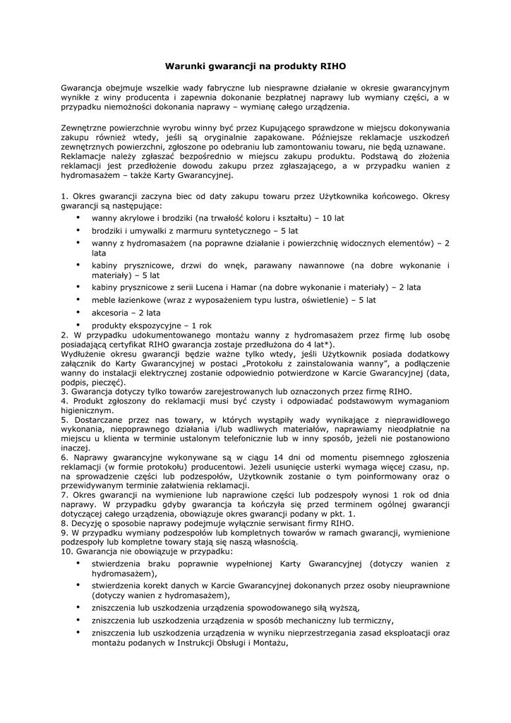 Warunki gwarancji na produkty RIHO Gwarancja obejmuje wszelkie wady fabryczne lub niesprawne działanie w okresie gwarancyjnym wynikłe z winy producenta i zapewnia dokonanie bezpłatnej naprawy lub wymiany części, a w przypadku niemożności dokonania naprawy – wymianę całego urządzenia. Zewnętrzne powierzchnie wyrobu winny być przez Kupującego sprawdzone w miejscu dokonywania zakupu również wtedy, jeśli są oryginalnie zapakowane. Późniejsze reklamacje uszkodzeń zewnętrznych powierzchni, zgłoszone po odebraniu lub zamontowaniu towaru, nie będą uznawane. Reklamacje należy zgłaszać bezpośrednio w miejscu zakupu produktu. Podstawą do złożenia reklamacji jest przedłożenie dowodu zakupu przez zgłaszającego, a w przypadku wanien z hydromasażem – także Karty Gwarancyjnej. 1. Okres gwarancji zaczyna biec od daty zakupu towaru przez Użytkownika końcowego. Okresy gwarancji są następujące: • • • wanny akrylowe i brodziki (na trwałość koloru i kształtu) – 10 lat • kabiny prysznicowe, drzwi do wnęk, parawany nawannowe (na dobre wykonanie i materiały) – 5 lat • • • • kabiny prysznicowe z serii Lucena i Hamar (na dobre wykonanie i materiały) – 2 lata • stwierdzenia braku hydromasażem), • stwierdzenia korekt danych w Karcie Gwarancyjnej dokonanych przez osoby nieuprawnione (dotyczy wanien z hydromasażem), • • • zniszczenia lub uszkodzenia urządzenia spowodowanego siłą wyższą, brodziki i umywalki z marmuru syntetycznego – 5 lat wanny z hydromasażem (na poprawne działanie i powierzchnię widocznych elementów) – 2 lata meble łazienkowe (wraz z wyposażeniem typu lustra, oświetlenie) – 5 lat akcesoria – 2 lata produkty ekspozycyjne – 1 rok 2. W przypadku udokumentowanego montażu wanny z hydromasażem przez firmę lub osobę posiadającą certyfikat RIHO gwarancja zostaje przedłużona do 4 lat*). Wydłużenie okresu gwarancji będzie ważne tylko wtedy, jeśli Użytkownik posiada dodatkowy załącznik do Karty Gwarancyjnej w postaci „Protokołu z zainstalowania wanny”, a podłączenie wanny do instalacji elektrycznej zostanie odpowiednio potwierdzone w Karcie Gwarancyjnej (data, podpis, pieczęć). 3. Gwarancja dotyczy tylko towarów zarejestrowanych lub oznaczonych przez firmę RIHO. 4. Produkt zgłoszony do reklamacji musi być czysty i odpowiadać podstawowym wymaganiom higienicznym. 5. Dostarczane przez nas towary, w których wystąpiły wady wynikające z nieprawidłowego wykonania, niepoprawnego działania i/lub wadliwych materiałów, naprawiamy nieodpłatnie na miejscu u klienta w terminie ustalonym telefonicznie lub w inny sposób, jeżeli nie postanowiono inaczej. 6. Naprawy gwarancyjne wykonywane są w ciągu 14 dni od momentu pisemnego zgłoszenia reklamacji (w formie protokołu) producentowi. Jeżeli usunięcie usterki wymaga więcej czasu, np. na sprowadzenie części lub podzespołów, Użytkownik zostanie o tym poinformowany oraz o przewidywanym terminie załatwienia reklamacji. 7. Okres gwarancji na wymienione lub naprawione części lub podzespoły wynosi 1 rok od dnia naprawy. W przypadku gdyby gwarancja ta kończyła się przed terminem ogólnej gwarancji dotyczącej całego urządzenia, obowiązuje okres gwarancji podany w pkt. 1. 8. Decyzję o sposobie naprawy podejmuje wyłącznie serwisant firmy RIHO. 9. W przypadku wymiany podzespołów lub kompletnych towarów w ramach gwarancji, wymienione podzespoły lub kompletne towary stają się naszą własnością. 10. Gwarancja nie obowiązuje w przypadku: poprawnie wypełnionej Karty Gwarancyjnej (dotyczy wanien z zniszczenia lub uszkodzenia urządzenia w sposób mechaniczny lub termiczny, zniszczenia lub uszkodzenia urządzenia w wyniku nieprzestrzegania zasad eksploatacji oraz montażu podanych w Instrukcji Obsługi i Montażu, • zniszczenia lub uszkodzenia urządzenia z powodu przepięć lub spadku napięcia w sieci elektroenergetycznej, • stwierdzenia samodzielnych nieautoryzowanych napraw i przeróbek lub zastosowania nieoryginalnych części, • zabudowy wanny w sposób uniemożliwiający wentylację oraz swobodny dostęp do urządzeń zainstalowanych pod wanną, • montażu na wannie innych urządzeń (za wyjątkiem baterii nawannowych i parawanów w miejscach do tego przeznaczonych), • zużycia towaru wynikającego z normalnej jego eksploatacji, uszkodzenia produktu wynikłego na skutek osadzania się kamienia oraz stosowania środków czyszczących i konserwujących o właściwościach ściernych lub szkodliwym składzie, • • gwarancją nie są ponadto objęte materiały eksploatacyjne (np. żarówki, uszczelki itp.). 11. Nie zwracamy kosztów związanych z wymianą uszkodzonych płytek czy innych materiałów zabudowy w sytuacjach, gdy wykonanie naprawy gwarancyjnej powoduje uzasadnioną konieczność naruszenia tejże zabudowy. Nie ponosimy żadnej odpowiedzialności za jakiekolwiek inne szkody wynikowe poniesione przez klienta. 12. Nie wydaje się kopii Karty Gwarancyjnej. Karta Gwarancyjna jest nieważna bez dowodu zakupu. 13. Gwarancja jest ważna tylko na terytorium Rzeczpospolitej Polskiej. 14. W przypadku niesłusznego zgłoszenia reklamacyjnego, nie znajdującego uzasadnienia w rzeczywistych wadach bądź usterkach produktu, a wynikającego z braku znajomości zasad Instrukcji Obsługi i Montażu lub Karty Gwarancyjnej, koszty dojazdu serwisanta ponosi Użytkownik. 15. Dostarczane przez nas towary są zgodne z wymaganiami określonymi przez polskie przepisy prawa oraz dyrektywy Wspólnoty Europejskiej. 16. Gwarancja udzielana na sprzedawany produkt nie wyłącza, nie ogranicza i nie zawiesza uprawnień Klienta wynikających z niezgodności towaru z umową. 17. W sprawach nie uregulowanych niniejszą Kartą Gwarancyjną zastosowanie mają przepisy Kodeksu Cywilnego. *) Nie dotyczy wanien z hydromasażem z ekspozycji.