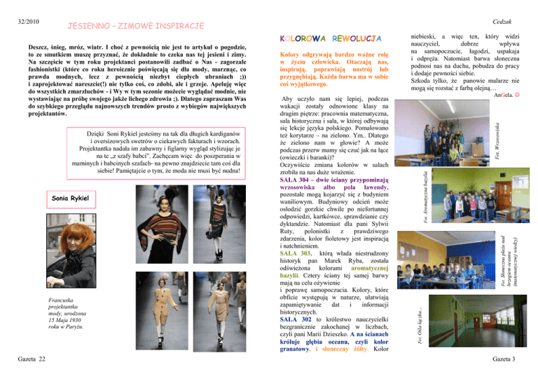 Cedzak JESIENNO – ZIMOWE INSPIRACJE Francuska projektantka mody, urodzona 15 Maja 1930 roku w ParyŜu. Gazeta 22 AnGela. ☺ brzegiem oceanu (matematycznej wiedzy) Sonia Rykiel Aby uczyło nam się lepiej, podczas wakacji zostały odnowione klasy na drugim piętrze: pracownia matematyczna, sala historyczna i sala, w której odbywają się lekcje języka polskiego. Pomalowano teŜ korytarze – na zielono. Ym.. Dlatego Ŝe zielono nam w głowie? A moŜe podczas przerw mamy się czuć jak na łące (owieczki i baranki)? Oczywiście zmiana kolorów w salach zrobiła na nas duŜe wraŜenie. SALA 304 – dwie ściany przypominają wrzosowiska albo pola lawendy, pozostałe mogą kojarzyć się z budyniem waniliowym. Budyniowy odcień moŜe osłodzić gorzkie chwile po niefortunnej odpowiedzi, kartkówce, sprawdzianie czy dyktandzie. Natomiast dla pani Sylwii Ruty, polonistki z prawdziwego zdarzenia, kolor fioletowy jest inspiracją i natchnieniem. SALA 303, którą włada niestrudzony historyk pan Marek Ryba, została odświeŜona kolorami aromatycznej bazylii. Cztery ściany tej samej barwy mają na celu oŜywienie i poprawę samopoczucia. Kolory, które obficie występują w naturze, ułatwiają zapamiętywanie dat i informacji historycznych. SALA 302 to królestwo nauczycielki bezgranicznie zakochanej w liczbach, czyli pani Marii Dzieszko. A na ścianach króluje głębia oceanu, czyli kolor granatowy, i słoneczny Ŝółty. Kolor Fot. Wrzosowiska Dzięki Soni Rykiel jesteśmy na tak dla długich kardiganów i oversizowych swetrów o ciekawych fakturach i wzorach. Projektantka nadała im zabawny i figlarny wygląd stylizując je na te „z szafy babci”. Zachęcam więc do poszperania w maminych i babcinych szafach- na pewno znajdziecie tam coś dla siebie! Pamiętajcie o tym, Ŝe moda nie musi być nudna! Kolory odgrywają bardzo waŜne rolę w Ŝyciu człowieka. Otaczają nas, inspirują, poprawiają nastrój lub przygnębiają. KaŜda barwa ma w sobie coś wyjątkowego. Fot. Słoneczna plaŜa nad Deszcz, śnieg, mróz, wiatr. I choć z pewnością nie jest to artykuł o pogodzie, to ze smutkiem muszę przyznać, Ŝe dokładnie to czeka nas tej jesieni i zimy. Na szczęście w tym roku projektanci postanowili zadbać o Nas - zagorzałe fashionistki (które co roku heroicznie poświęcają się dla mody, marznąc, co prawda modnych, lecz z pewnością niezbyt ciepłych ubraniach ;)) i zaprojektować nareszcie(!) nie tylko coś, co zdobi, ale i grzeje. Apeluję więc do wszystkich zmarzluchów - i Wy w tym sezonie moŜecie wyglądać modnie, nie wystawiając na próbę swojego jakŜe lichego zdrowia ;). Dlatego zapraszam Was do szybkiego przeglądu najnowszych trendów prosto z wybiegów największych projektantów. niebieski, a więc ten, który widzi nauczyciel, dobrze wpływa na samopoczucie, łagodzi, uspakaja i odpręŜa. Natomiast barwa słoneczna podnosi nas na duchu, pobudza do pracy i dodaje pewności siebie. Szkoda tylko, Ŝe panowie malarze nie mogą się rozstać z farbą olejną… Fot. Aromatyczna bazylia KOLOROWA REWOLUCJA Fot. Ośla łączka… 32/2010 Gazeta 3