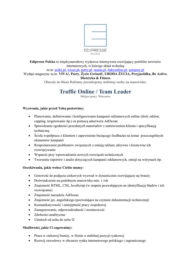 Edipresse Polska to międzynarodowy wydawca intensywnie rozwijający portfolio serwisów internetowych, w którego skład wchodzą m.in. polki.pl, wizaz.pl, party.pl, niania.pl, babyonline.pl, gotujmy.pl Wydaje magazyny m.in. VIVA!, Party. Życie Gwiazd!, URODA ŻYCIA, Przyjaciółka, Be Active. Dietetyka & Fitness Obecnie do Biura Reklamy poszukujemy ambitnej osoby na stanowisko: Traffic Online / Team Leader Miejsce pracy: Warszawa Wyzwania, jakie przed Tobą postawimy: Planowanie, definiowanie i konfigurowanie kampanii reklamowych online (ilość odsłon, capping, tergetowanie itp.) za pomocą adserwera AdOcean. Sprawdzanie zgodności przesłanych materiałów z zamówieniem klienta i specyfikacją techniczną Ścisła współpraca z klientem i zapewnienie bieżącego feedbacku na temat poszczególnych elementów kampanii Rozpoznawanie problemów związanych z emisją reklam, aktywne i kreatywne ich rozwiązywanie Wsparcie przy wprowadzaniu nowych rozwiązań technicznych Tworzenie raportów i analiz dotyczących kampanii reklamowych, emisji na witrynach itp. Oczekiwania, jakie wobec Ciebie mamy: Gotowość do podjęcia ciekawych wyzwań w dynamicznie rozwijającej się branży Doświadczenie na podobnym stanowisku min. 1 rok Znajomość HTML, CSS, JavaScript (w stopniu pozwalającym na identyfikację błędów i ich rozwiązanie) Znajomość narzędzia AdOcean Znajomość jęz. angielskiego (pozwalająca na czytanie dokumentacji technicznej) Komunikatywność i umiejętność pracy zespołowej Zaangażowanie, odpowiedzialność i terminowość Zdolności analityczne Uśmiech od ucha do ucha Możliwości, jakie Ci zapewnimy: Praca w ciekawej branży, w firmie o stabilnej pozycji rynkowej Rozwój zawodowy w obszarze rynku internetowego polskiego i zagranicznego Dostęp do unikalnego know-how Udział w ambitnych, prestiżowych projektach i wiele interesujących wyzwań zawodowych Przyjazna atmosfera pracy bez korporacyjnych ograniczeń Możliwość realizowania własnych, ciekawych pomysłów Atrakcyjne wynagrodzenie Pakiet socjalny Dla bardziej doświadczonych Kandydatów przewidujemy możliwość objęcia stanowiska Lidera Grupy Traffic Zapraszamy do przesłania aplikacji poprzez formularz zgłoszeniowy http://praca.edipresse.pl/ Informujemy, że skontaktujemy się z wybranymi kandydatami. Prosimy o dopisanie następującej klauzuli: "Wyrażam zgodę na przetwarzanie moich danych osobowych zawartych w mojej ofercie pracy dla potrzeb niezbędnych do realizacji procesu rekrutacji zgodnie z ustawą z dnia 29 sierpnia 1997 r. o ochronie danych osobowych (Dz. U. z 2002 r. Nr 101, poz. 926, ze zm.)"