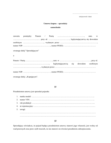 ………………………………. (miejscowość i data) Umowa kupna – sprzedaży samochodu zawarta pomiędzy Panem / Panią …………………………………, zam. w ……………………………….. , przy ul. …………………………., legitymującym/cą się dowodem osobistym …………………………., wydanym przez ………………………………………………, numer NIP: …………………………………., numer PESEL: ………………………………………. zwanego dalej” Sprzedającym” a Panem / Panią …………………………………, zam. w ………………………………………, przy ul. …………………………………………….., legitymującym/cą się dowodem osobistym …………………………………., wydanym przez …………………………………………………… numer NIP: ………………………………… , numer PESEL: ………………………………………. zwanego dalej: „Kupującym”. §1 Przedmiotem umowy jest sprzedaż pojazdu: 1. marka model: ……………………………………………………………………………….. 2. numer VIN: …………………………………………………………………………………. 3. rok produkcji: ……………………………………………………………………………….. 4. nr rejestracyjny: ……………………………………………………………………………… 5. uwagi: ………………………………………………………………………………………………… ………………………………………………………………………………………………… §2 Sprzedający oświadcza, że pojazd będący przedmiotem umowy stanowi jego własność, jest wolny od wad prawnych oraz praw osób trzecich, że nie stanowi on również przedmiotu zabezpieczenia. §3 Strony ustaliły wartość przedmiotu umowy na kwotę: …………………………………….., (słownie:……………………………………………………………………………………… ). §4 Sprzedający przenosi na rzecz Kupującego własność pojazdu określonego w §1 niniejszej umowy za kwotę określoną w §3 niniejszej umowy, której Sprzedający kwituje. Kupujący kwituje jednocześnie odbiór określonego w §1 pojazdu. §5 Kupujący oświadcza, że stan techniczny pojazdu jest mu znany. §6 Strony ustaliły, że wszelkiego rodzaju koszty transakcji z realizacji niniejszej umowy obciążają ……………………………………… . §7 W sprawach nieuregulowanych w niniejszej umowie zastosowanie mają przepisy Kodeksu cywilnego, a Sądem właściwym do rozstrzygania ewentualnych sporów jest Sąd właściwy dla miejsca sporządzenia niniejszej umowy. §8 Umowę sporządzono w dwóch jednobrzmiących egzemplarzach, po jednym dla każdej ze stron. ……………………………… Kupujący …………………………….. Sprzedający
