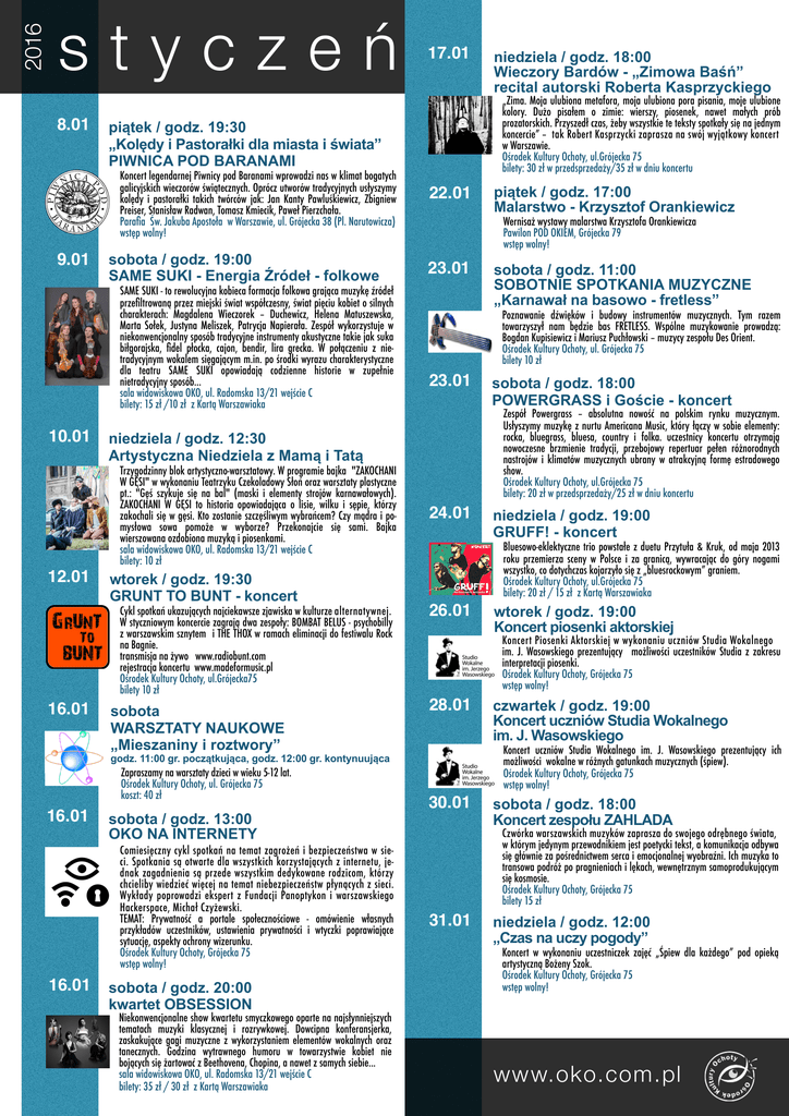 2016 styczeń 8.01 sobota / godz. 19:00 SAME SUKI - Energia Źródeł - folkowe SAME SUKI - to rewolucyjna kobieca formacja folkowa grająca muzykę źródeł przefiltrowaną przez miejski świat współczesny, świat pięciu kobiet o silnych charakterach: Magdalena Wieczorek – Duchewicz, Helena Matuszewska, Marta Sołek, Justyna Meliszek, Patrycja Napierała. Zespół wykorzystuje w niekonwencjonalny sposób tradycyjne instrumenty akustyczne takie jak suka biłgorajska, fidel płocka, cajon, bendir, lira grecka. W połączeniu z nietradycyjnym wokalem sięgającym m.in. po środki wyrazu charakterystyczne dla teatru SAME SUKI opowiadają codzienne historie w zupełnie nietradycyjny sposób… sala widowiskowa OKO, ul. Radomska 13/21 wejście C bilety: 15 zł /10 zł z Kartą Warszawiaka 10.01 12.01 wtorek / godz. 19:30 GRUNT TO BUNT - koncert Cykl spotkań ukazujących najciekawsze zjawiska w kulturze alternatywnej. W styczniowym koncercie zagrają dwa zespoły: BOMBAT BELUS - psychobilly z warszawskim sznytem i THE THOX w ramach eliminacji do festiwalu Rock na Bagnie. transmisja na żywo www.radiobunt.com rejestracja koncertu www.madeformusic.pl Ośrodek Kultury Ochoty, ul.Grójecka75 bilety 10 zł 16.01 22.01 sobota WARSZTATY NAUKOWE „Mieszaniny i roztwory” 23.01 16.01 sobota / godz. 13:00 OKO NA INTERNETY Comiesięczny cykl spotkań na temat zagrożeń i bezpieczeństwa w sieci. Spotkania są otwarte dla wszystkich korzystających z internetu, jednak zagadnienia są przede wszystkim dedykowane rodzicom, którzy chcieliby wiedzieć więcej na temat niebezpieczeństw płynących z sieci. Wykłady poprowadzi ekspert z Fundacji Panoptykon i warszawskiego Hackerspace, Michał Czyżewski. TEMAT: Prywatność a portale społecznościowe - omówienie własnych przykładów uczestników, ustawienia prywatności i wtyczki poprawiające sytuację, aspekty ochrony wizerunku. Ośrodek Kultury Ochoty, Grójecka 75 wstęp wolny! 16.01 sobota / godz. 20:00 kwartet OBSESSION Niekonwencjonalne show kwartetu smyczkowego oparte na najsłynniejszych tematach muzyki klasycznej i rozrywkowej. Dowcipna konferansjerka, zaskakujące gagi muzyczne z wykorzystaniem elementów wokalnych oraz tanecznych. Godzina wytrawnego humoru w towarzystwie kobiet nie bojących się żartować z Beethovena, Chopina, a nawet z samych siebie... sala widowiskowa OKO, ul. Radomska 13/21 wejście C bilety: 35 zł / 30 zł z Kartą Warszawiaka sobota / godz. 11:00 SOBOTNIE SPOTKANIA MUZYCZNE „Karnawał na basowo - fretless” Poznawanie dźwięków i budowy instrumentów muzycznych. Tym razem towarzyszył nam będzie bas FRETLESS. Wspólne muzykowanie prowadzą: Bogdan Kupisiewicz i Mariusz Puchłowski – muzycy zespołu Des Orient. Ośrodek Kultury Ochoty, ul. Grójecka 75 bilety 10 zł 23.01 sobota / godz. 18:00 POWERGRASS i Goście - koncert Zespół Powergrass – absolutna nowość na polskim rynku muzycznym. Usłyszymy muzykę z nurtu Americana Music, który łączy w sobie elementy: rocka, bluegrass, bluesa, country i folka. uczestnicy koncertu otrzymają nowoczesne brzmienie tradycji, przebojowy repertuar pełen różnorodnych nastrojów i klimatów muzycznych ubrany w atrakcyjną formę estradowego show. Ośrodek Kultury Ochoty, ul.Grójecka 75 bilety: 20 zł w przedsprzedaży/25 zł w dniu koncertu 24.01 niedziela / godz. 19:00 GRUFF! - koncert Bluesowo-eklektyczne trio powstałe z duetu Przytuła & Kruk, od maja 2013 roku przemierza sceny w Polsce i za granicą, wywracając do góry nogami wszystko, co dotychczas kojarzyło się z „bluesrockowym” graniem. Ośrodek Kultury Ochoty, ul.Grójecka 75 bilety: 20 zł / 15 zł z Kartą Warszawiaka 26.01 wtorek / godz. 19:00 Koncert piosenki aktorskiej Koncert Piosenki Aktorskiej w wykonaniu uczniów Studia Wokalnego 29.09 im. J. Wasowskiego prezentujący możliwości uczestników Studia z zakresu interpretacji piosenki. Ośrodek Kultury Ochoty, Grójecka 75 wstęp wolny! 28.01 czwartek / godz. 19:00 Koncert uczniów Studia Wokalnego im. J. Wasowskiego Koncert uczniów Studia Wokalnego im. J. Wasowskiego prezentujący ich możliwości wokalne w różnych gatunkach muzycznych (śpiew). Ośrodek Kultury Ochoty, Grójecka 75 wstęp wolny! godz. 11:00 gr. początkująca, godz. 12:00 gr. kontynuująca Zapraszamy na warsztaty dzieci w wieku 5-12 lat. Ośrodek Kultury Ochoty, ul. Grójecka 75 koszt: 40 zł piątek / godz. 17:00 Malarstwo - Krzysztof Orankiewicz Wernisaż wystawy malarstwa Krzysztofa Orankiewicza Pawilon POD OKIEM, Grójecka 79 wstęp wolny! niedziela / godz. 12:30 Artystyczna Niedziela z Mamą i Tatą Trzygodzinny blok artystyczno-warsztatowy. W programie bajka "ZAKOCHANI W GĘSI" w wykonaniu Teatrzyku Czekoladowy Słoń oraz warsztaty plastyczne pt.: "Gęś szykuje się na bal" (maski i elementy strojów karnawałowych). ZAKOCHANI W GĘSI to historia opowiadająca o lisie, wilku i sępie, którzy zakochali się w gęsi. Kto zostanie szczęśliwym wybrańcem? Czy mądra i pomysłowa sowa pomoże w wyborze? Przekonajcie się sami. Bajka wierszowana ozdobiona muzyką i piosenkami. sala widowiskowa OKO, ul. Radomska 13/21 wejście C bilety: 10 zł niedziela / godz. 18:00 Wieczory Bardów - „Zimowa Baśń” recital autorski Roberta Kasprzyckiego „Zima. Moja ulubiona metafora, moja ulubiona pora pisania, moje ulubione kolory. Dużo pisałem o zimie: wierszy, piosenek, nawet małych prób prozatorskich. Przyszedł czas, żeby wszystkie te teksty spotkały się na jednym koncercie” – tak Robert Kasprzycki zaprasza na swój wyjątkowy koncert w Warszawie. Ośrodek Kultury Ochoty, ul.Grójecka 75 bilety: 30 zł w przedsprzedaży/35 zł w dniu koncertu piątek / godz. 19:30 „Kolędy i Pastorałki dla miasta i świata” PIWNICA POD BARANAMI Koncert legendarnej Piwnicy pod Baranami wprowadzi nas w klimat bogatych galicyjskich wieczorów świątecznych. Oprócz utworów tradycyjnych usłyszymy kolędy i pastorałki takich twórców jak: Jan Kanty Pawluśkiew